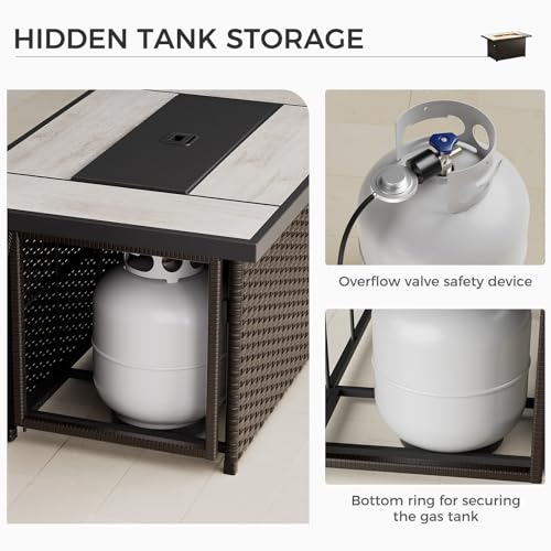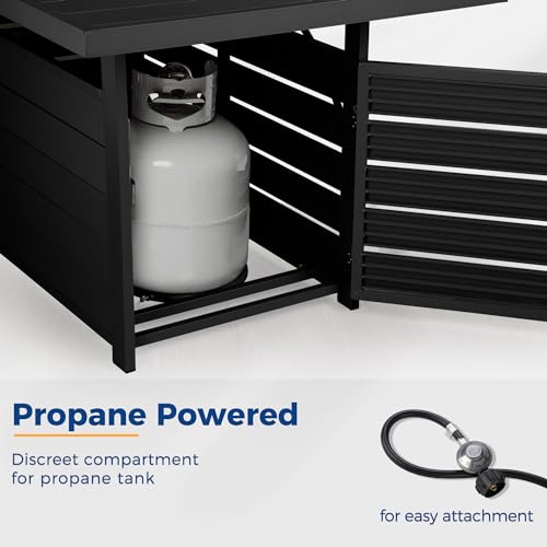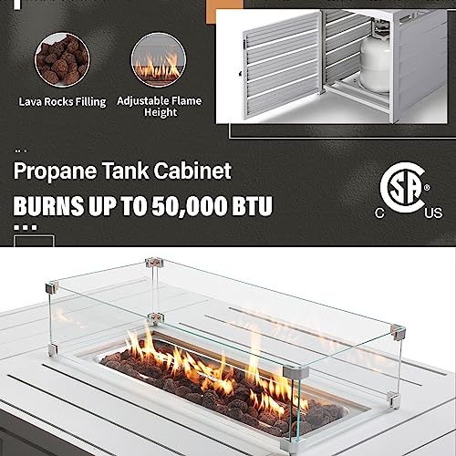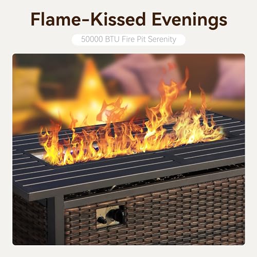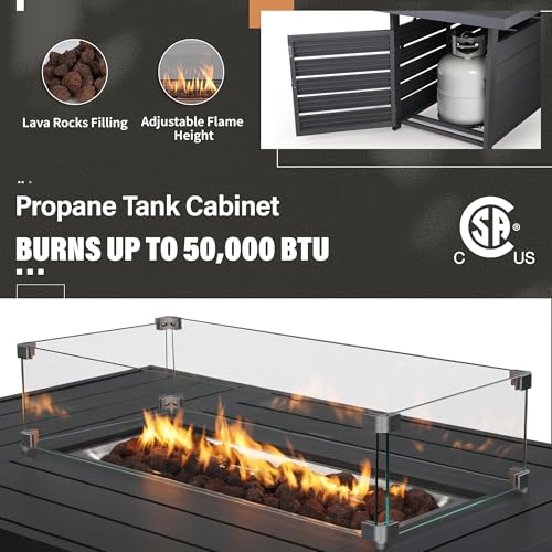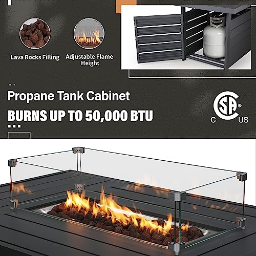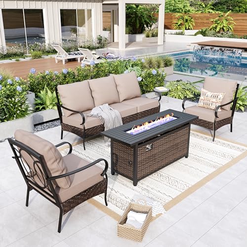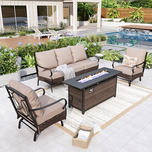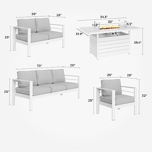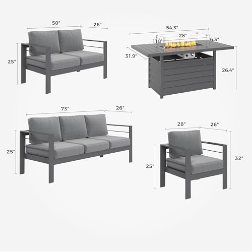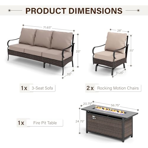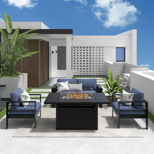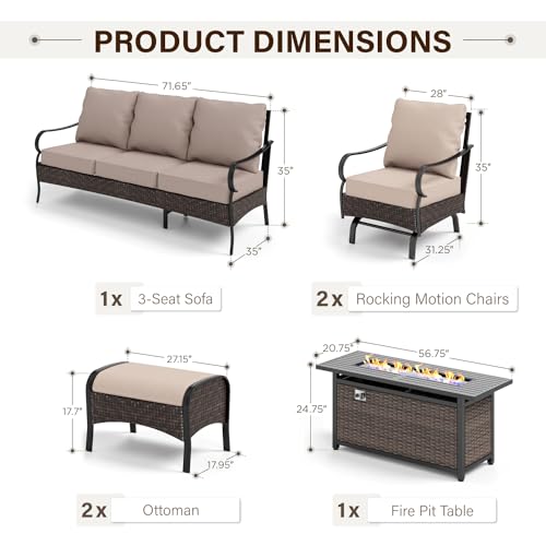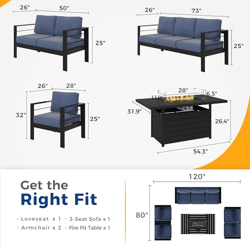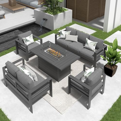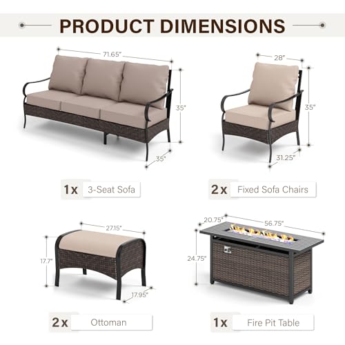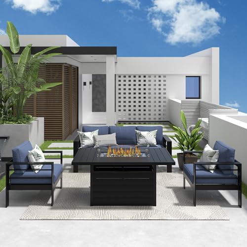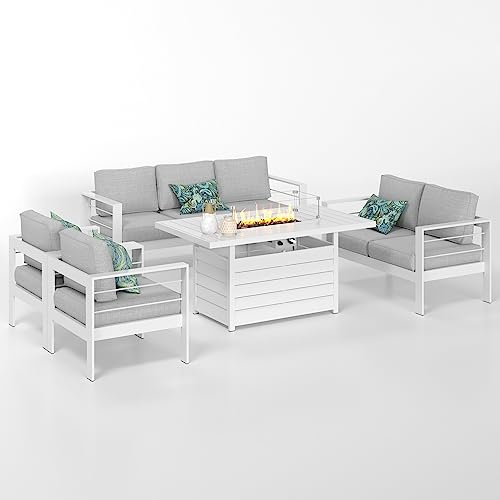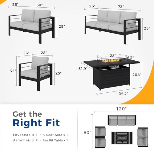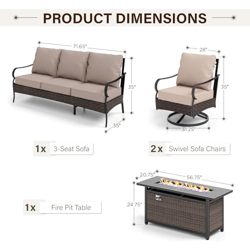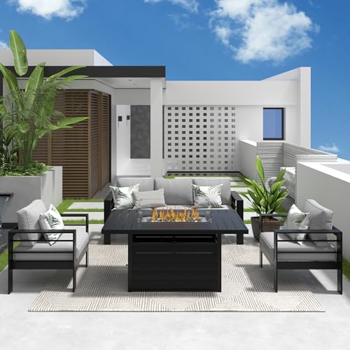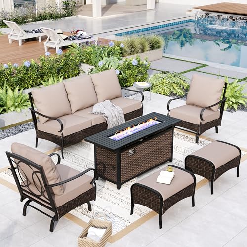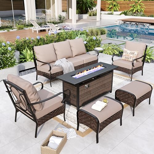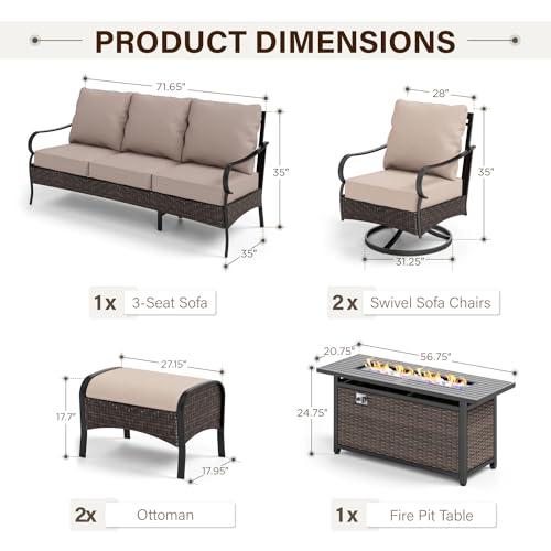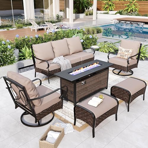 GREEN PARTY Extra Large Outdoor Patio Furniture Set with 56" Fire Pit Table 6 Pieces for 7, Modern Metal Patio Conversation Sets with High Back 3-Seat Sofa, 2 Swivel Chairs, 2 Ottoman