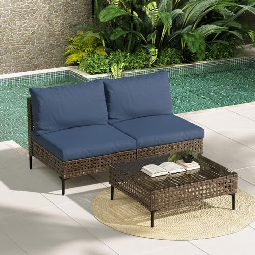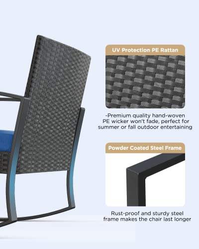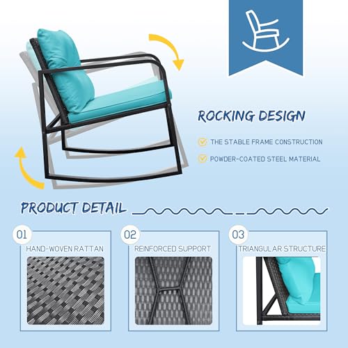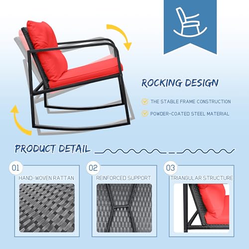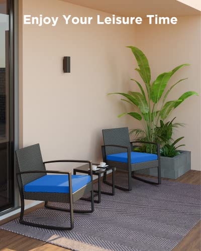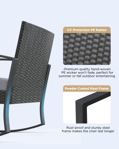 3 Pieces Patio Furniture Set Rocking Bistro Set Outdoor Rattan Conversation with Coffee Table for Garden Balcony Backyard Poolside (Grey Cushion)