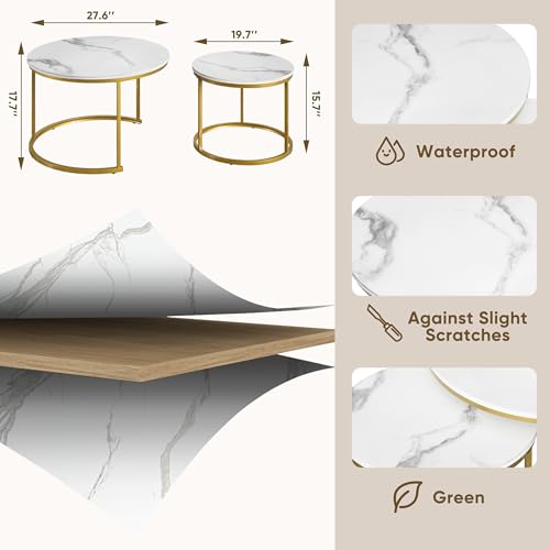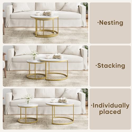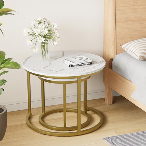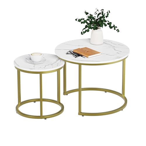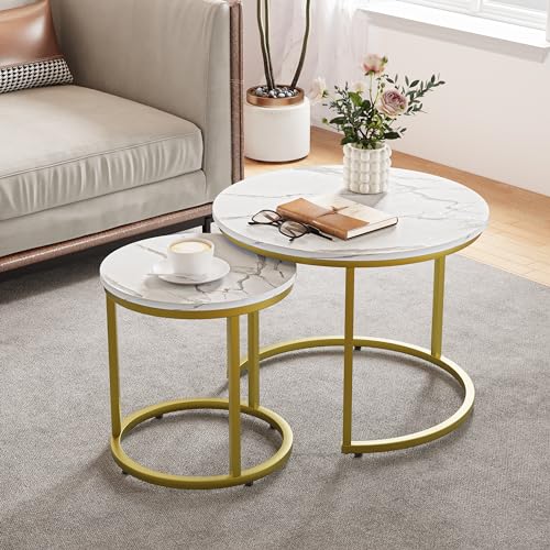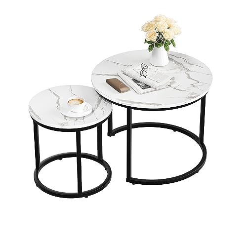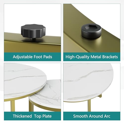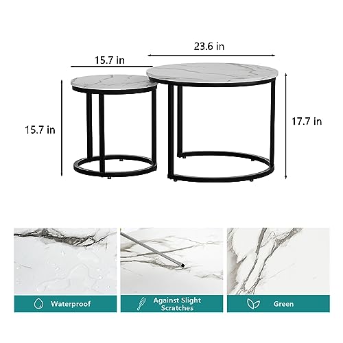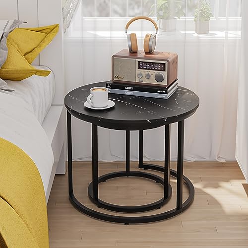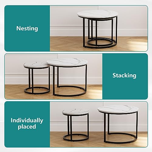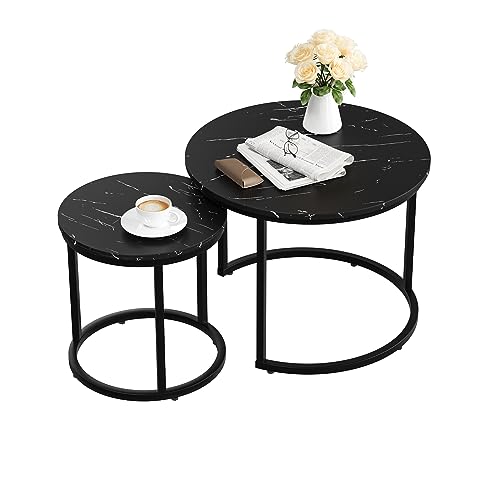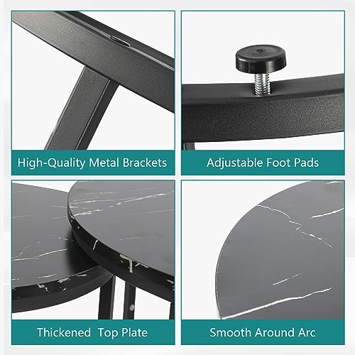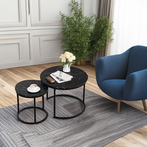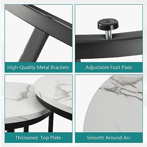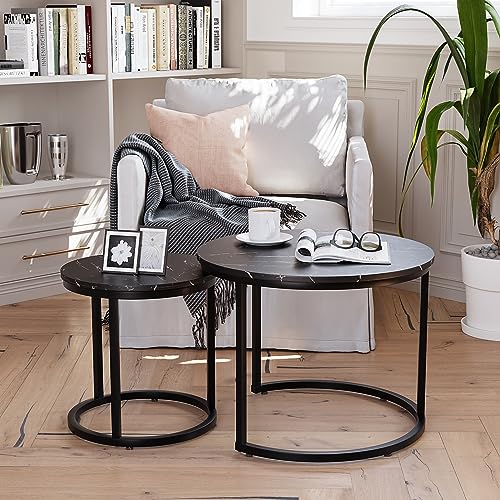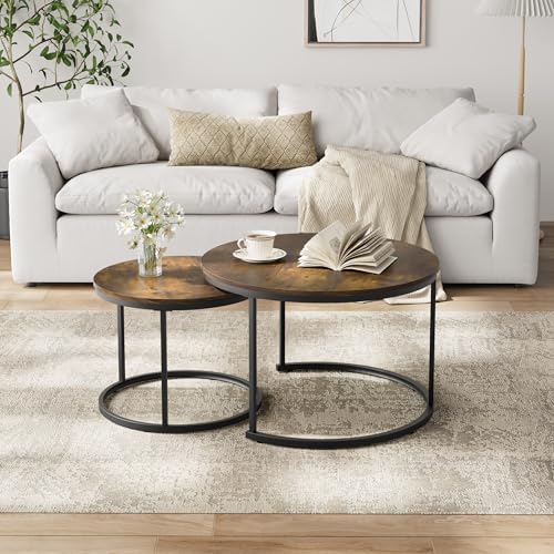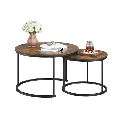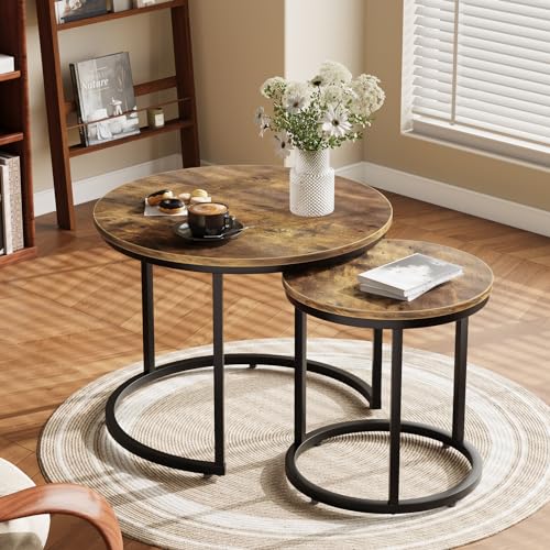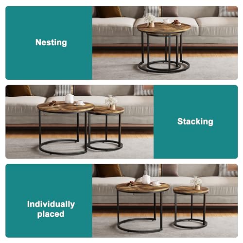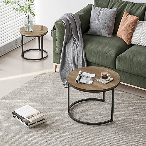 Smuxee Nesting Coffee Table Set of 2, 23.6" Round Coffee Table Wood Grain Top with Adjustable Non-Slip Feet, Industrial End Table Side Tables for Living Room Bedroom Balcony Yard
