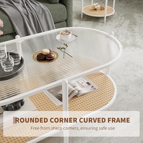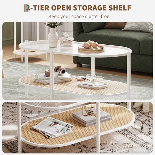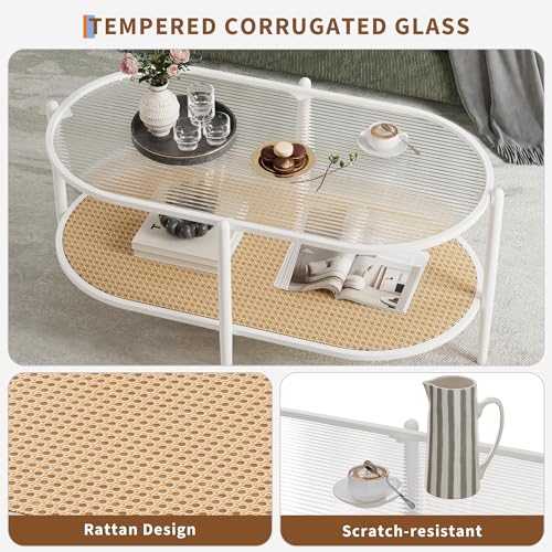 GAOMON 37" Rattan Oval Coffee Table, 2-Tier Storage Shelf and Metal Frame, Water-Wave GlassTabletop Cocktail Tea Table, Farmhouse Center Tables for Living Room Bedroom, Small Space, Black