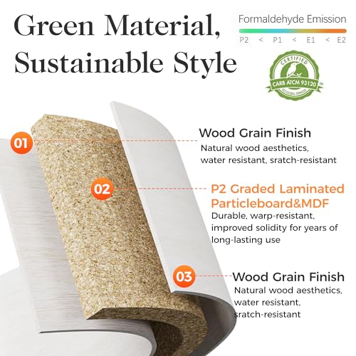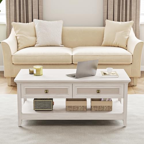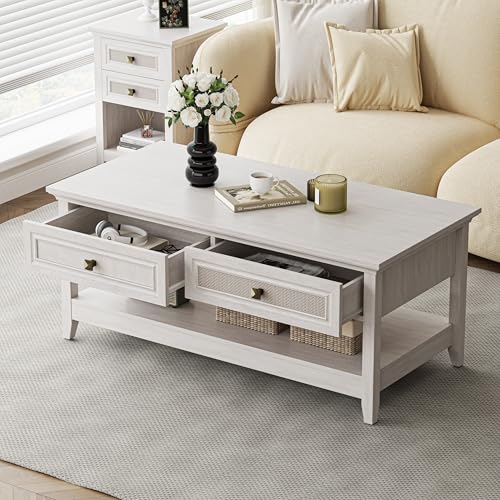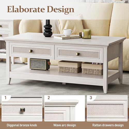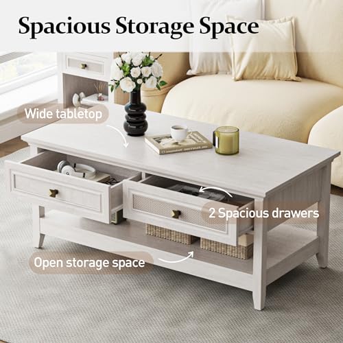 Farmhouse Coffee Table, Boho Tea Table with 2 Rattan Decor Drawers, Accent Center Sofa Table with Storage Shelf, 2 Tier Coffee Table for Living Room, Bedroom, Home Office, Grayish White