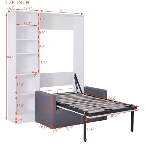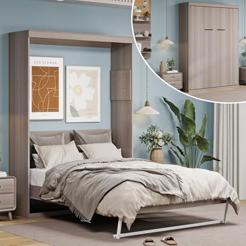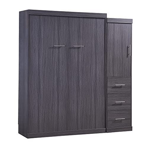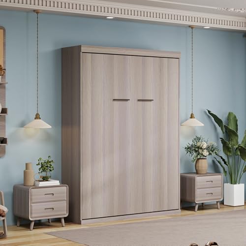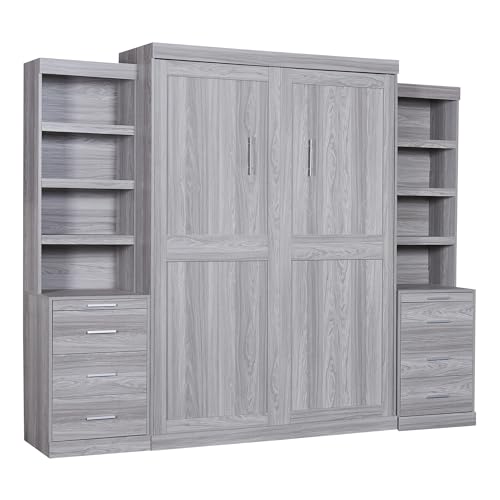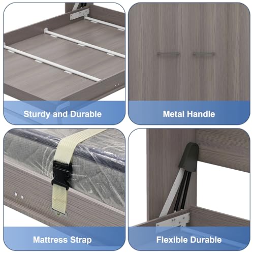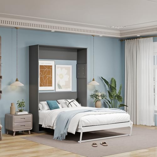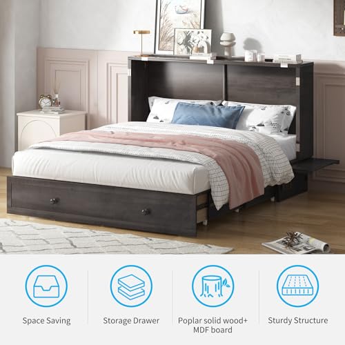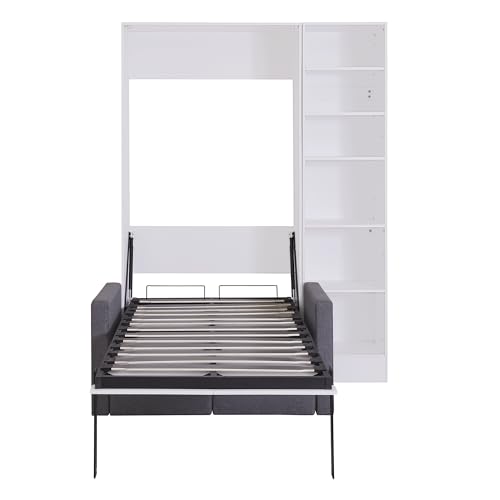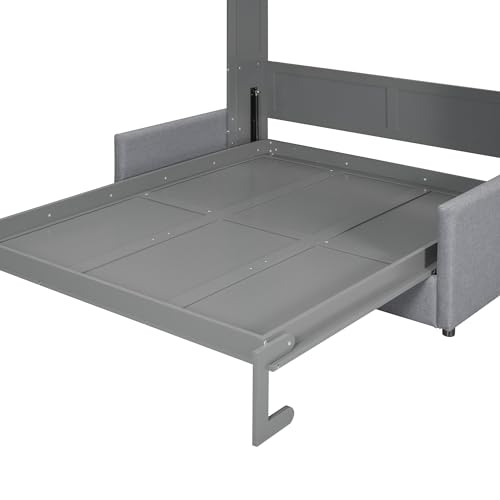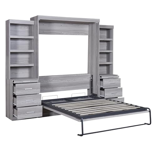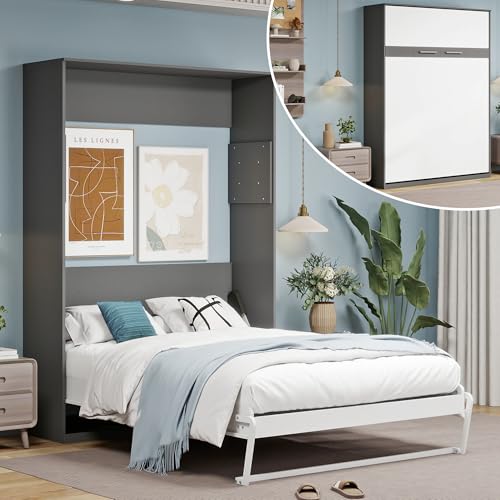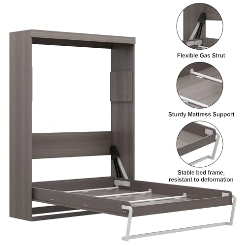 Full Size Murphy Bed with 2 Convertible Side Cabinet Storage Shelf, Foldable Wallbed Bedframe, Wall Bed Hidden Murphy Cabinet Bed Space Saving Bed Frame for Bedroom, Small Space, Grey
