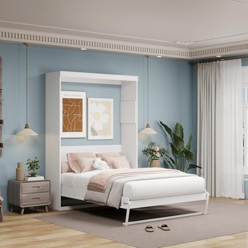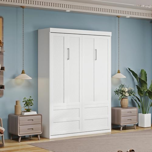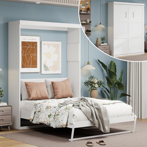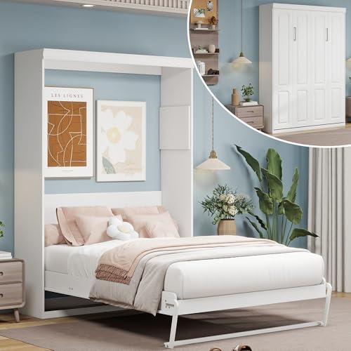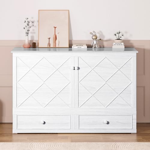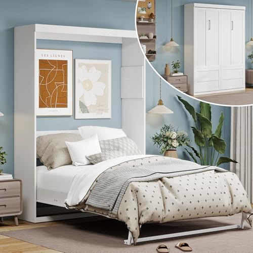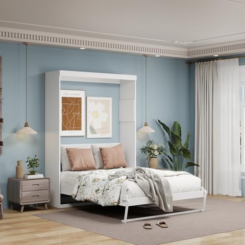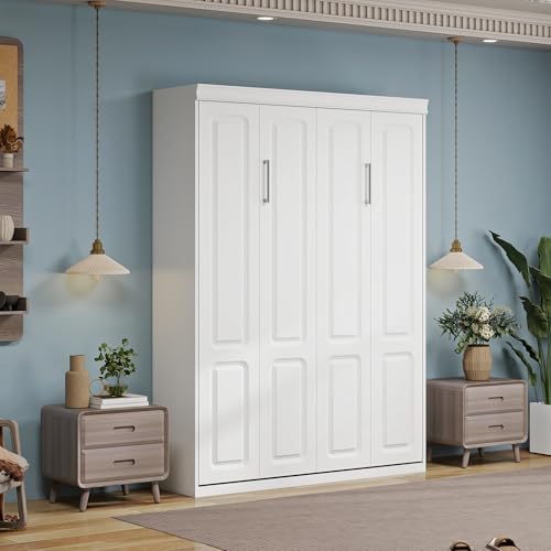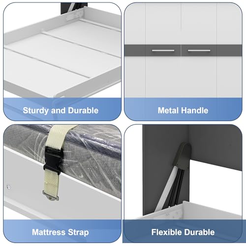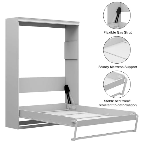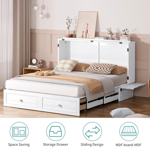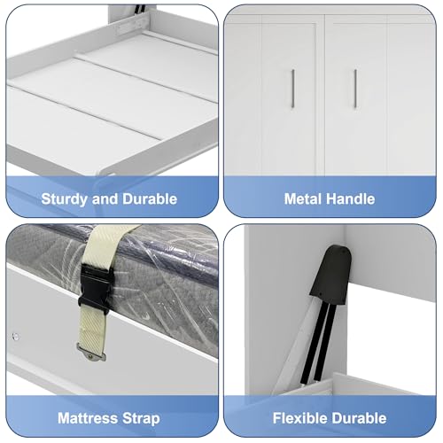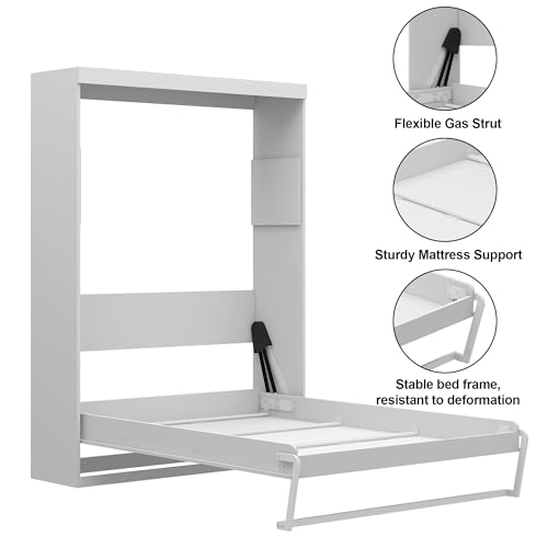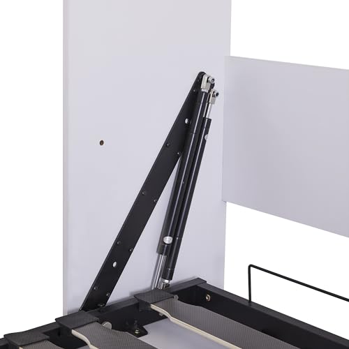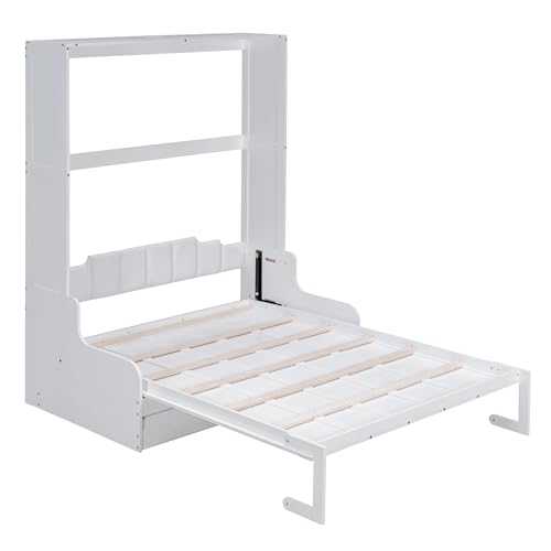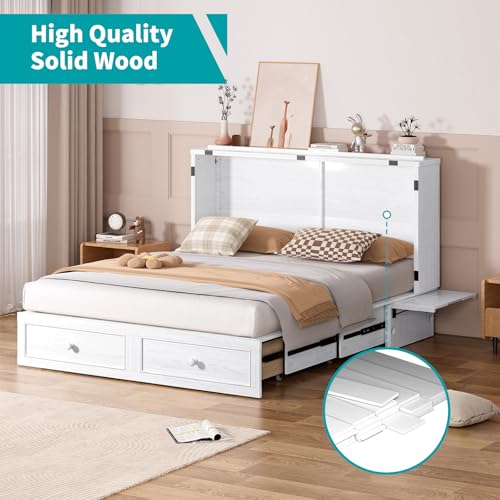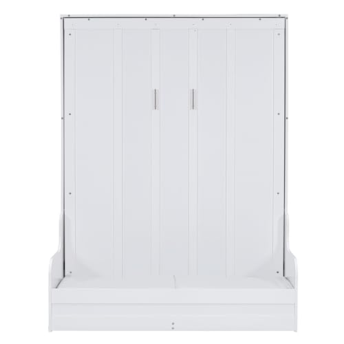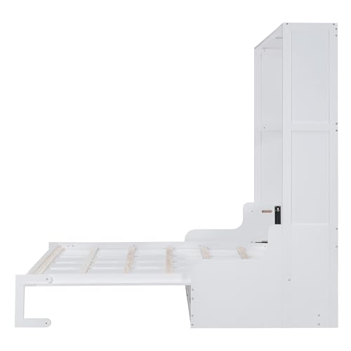 SOFTSEA Full Size Murphy Bed with Desk Combo, 61.5 inch Murphy Bed Frame, Foldable Wall Bed for Guest Room Study Room Bedroom Apartment, Home Office Wood Murphy Cabinet Bed, White