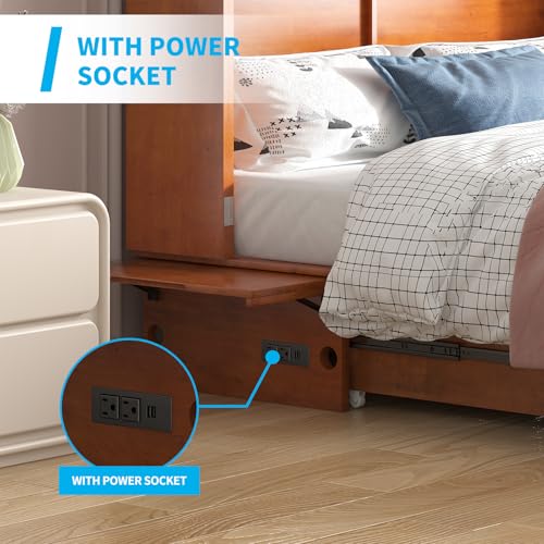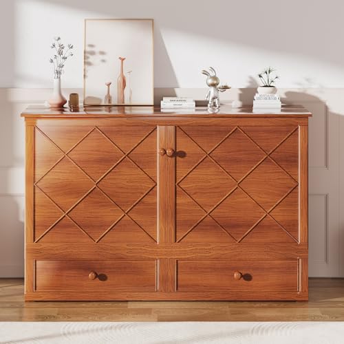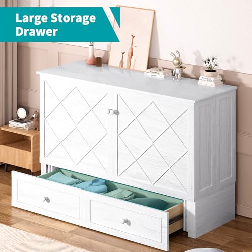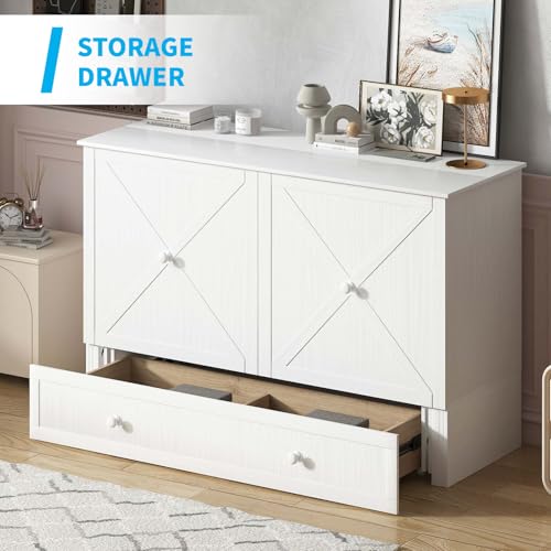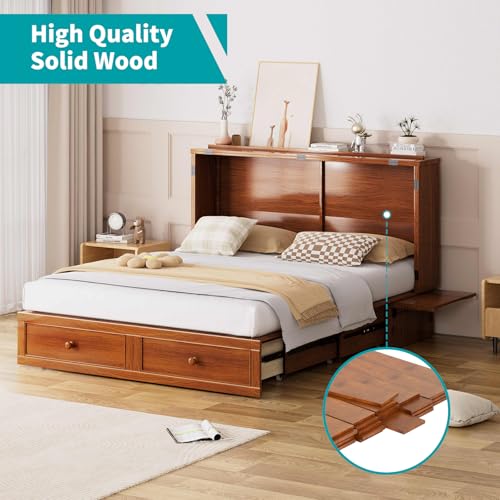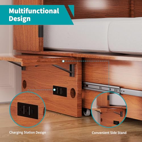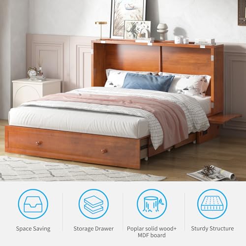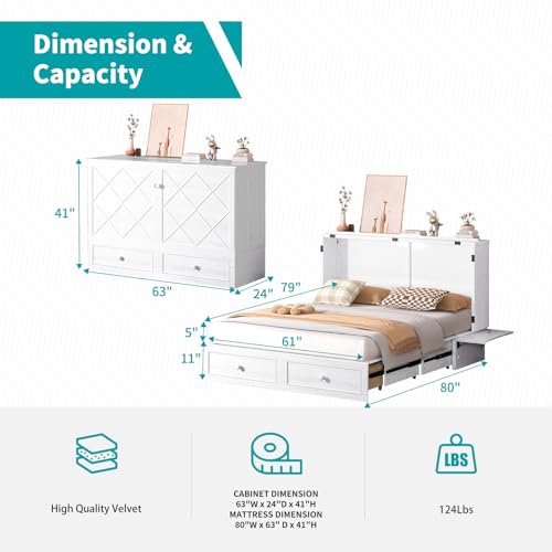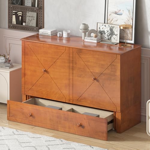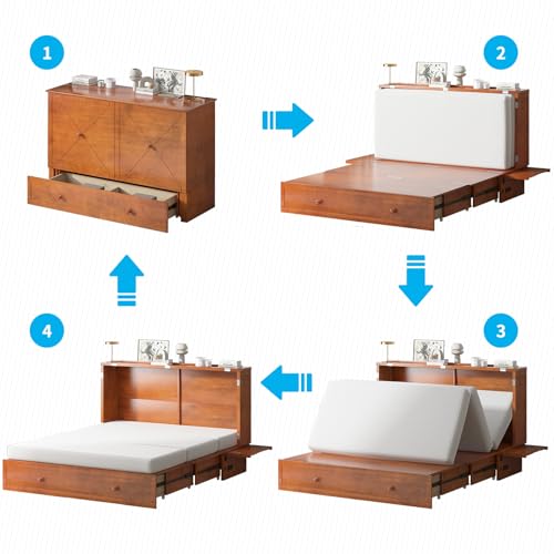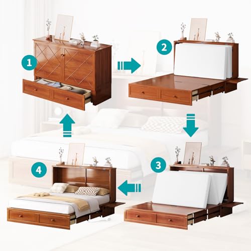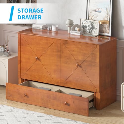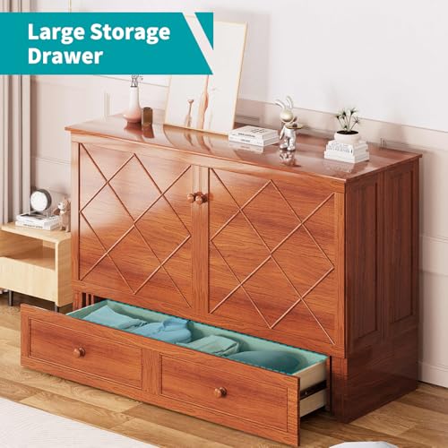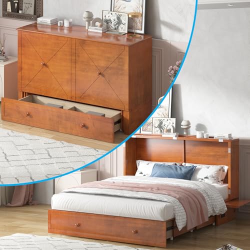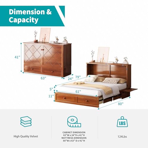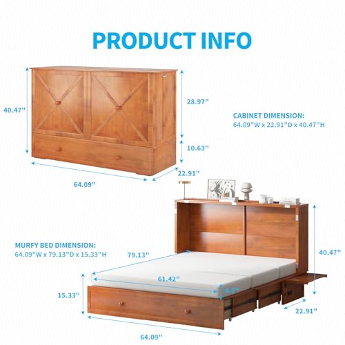BALUS Murphy Bed Cabinet, 63" W Queen Cabinet Cube Chest Bed with Tri-fold Mattress, Charging Station, Wooden Cabinets Wall Beds Convertible Design w Drawers for Guest Room Home Office, Cherry