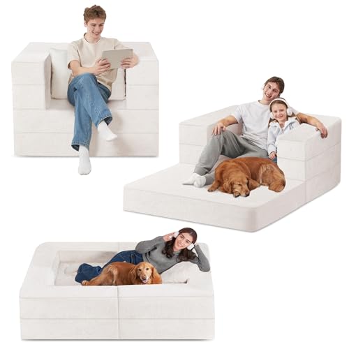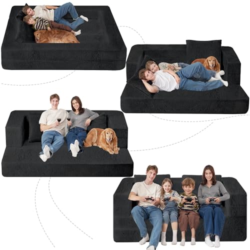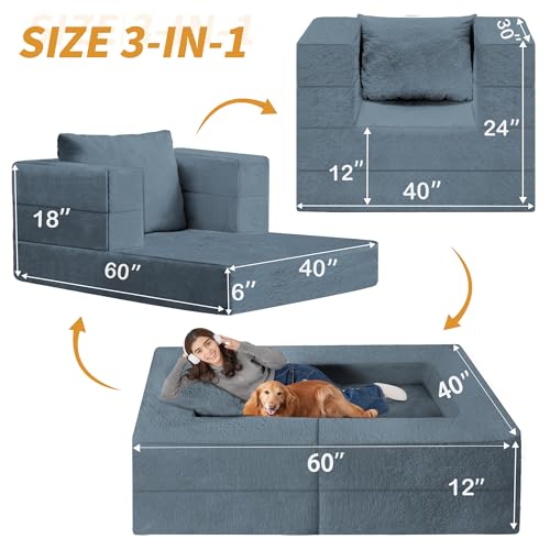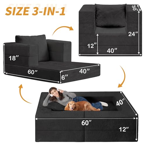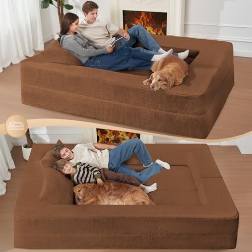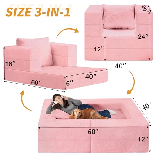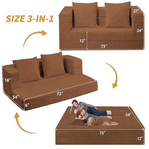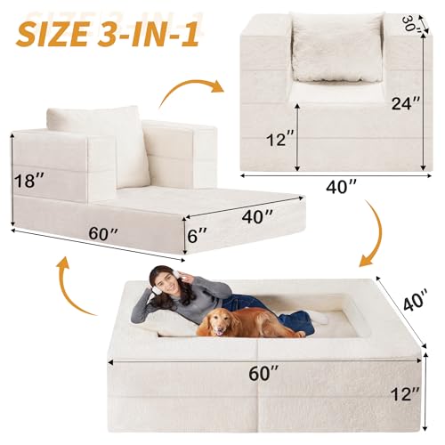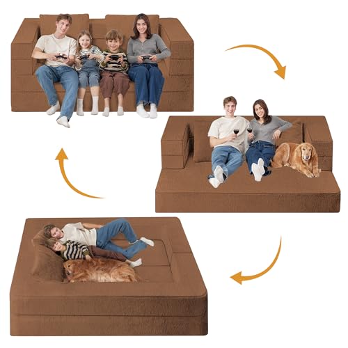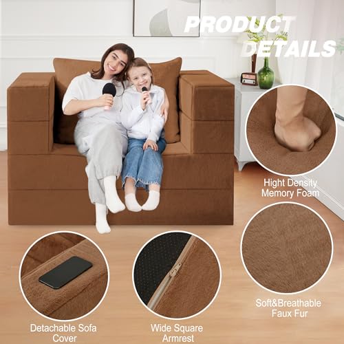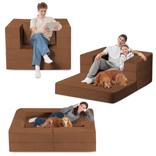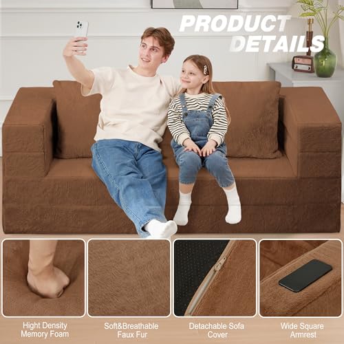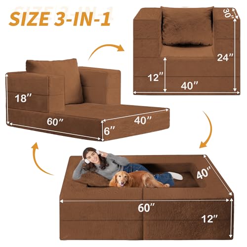 Folding Bean Bag Chair for Adults,3-in-1 Bean Bag Couch Faux Fur Floor Sofa Large Beanbag Convertible Bean Bag Sofa Bed with Pillow in Bedroom,Living Room,Apartment(Twin,Caramel)