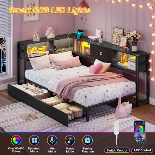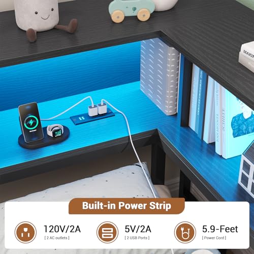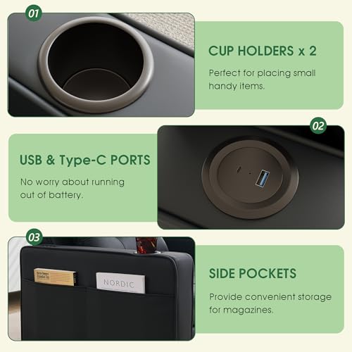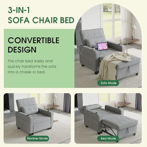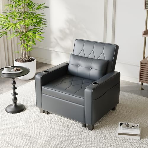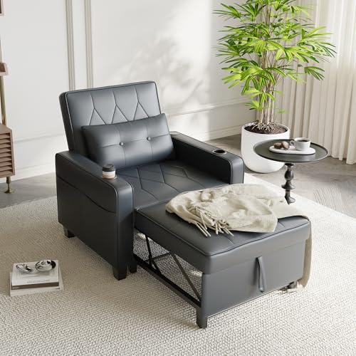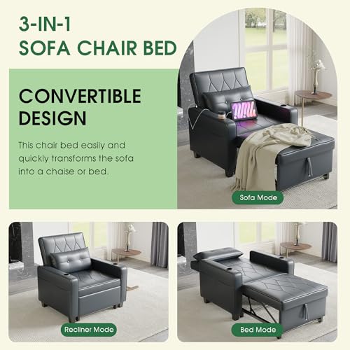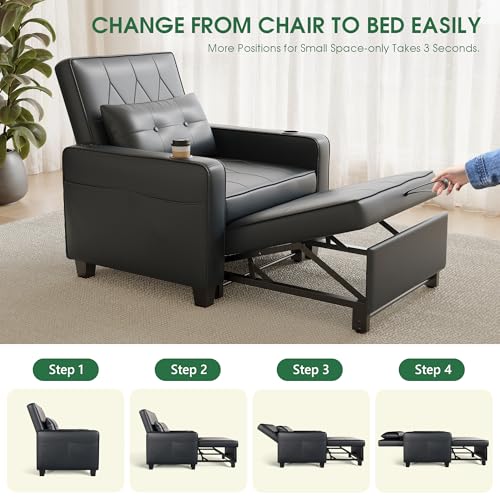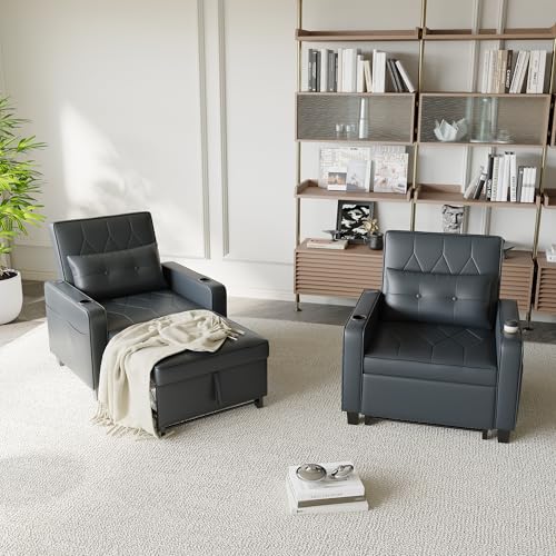 3-in-1 Convertible Sofa Chair Bed, Pull Out Leather Recliner Sleeper Sofa Chair Bed Couch with Cup Holders, USB & Type C Port,Side Pockets, Perfect for Living Room,Bedroom,Office (Black)