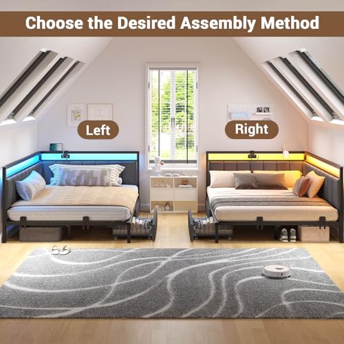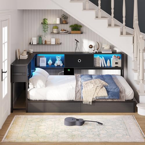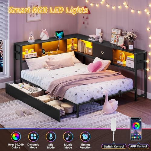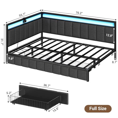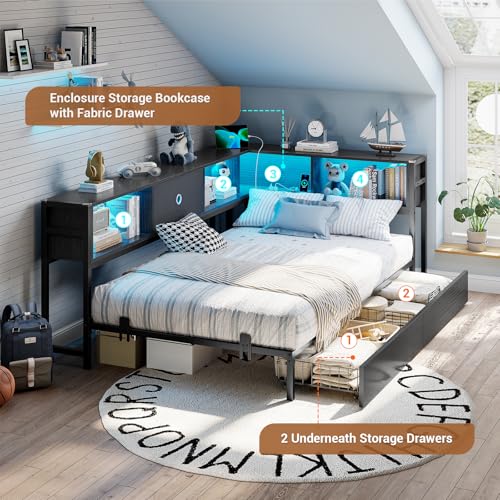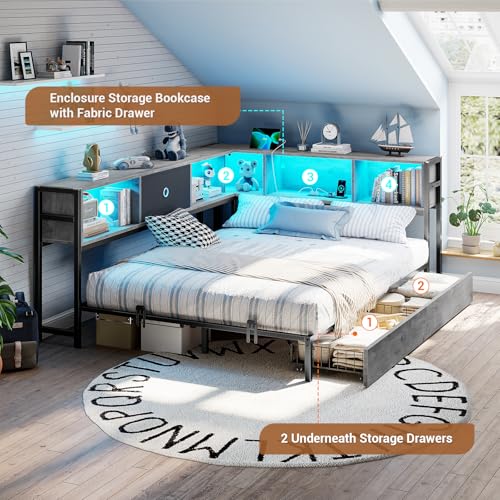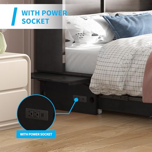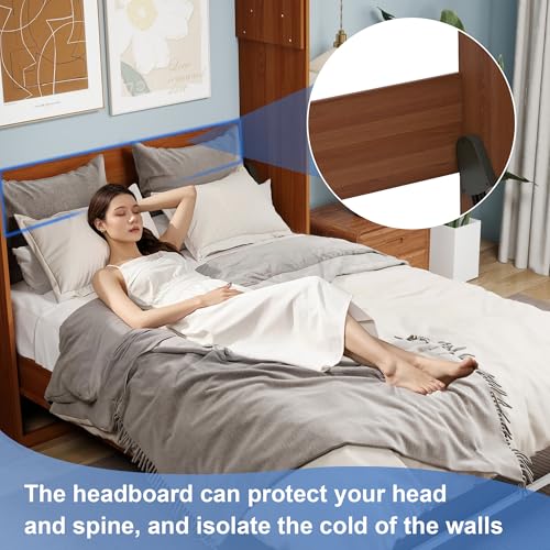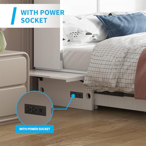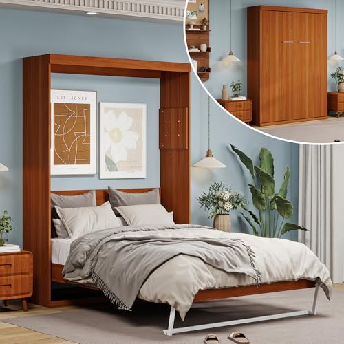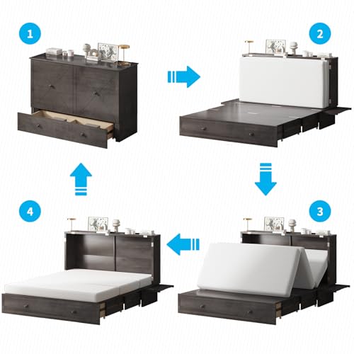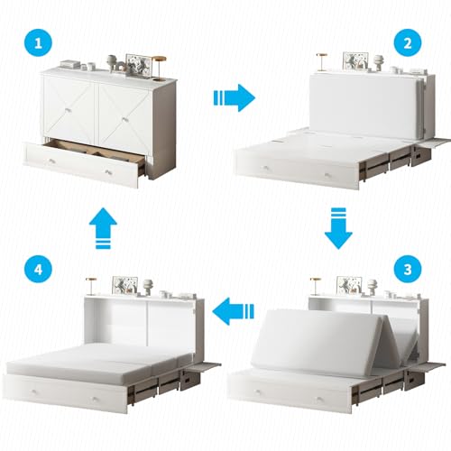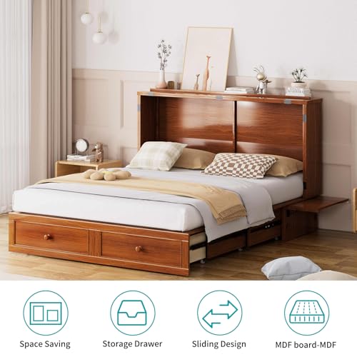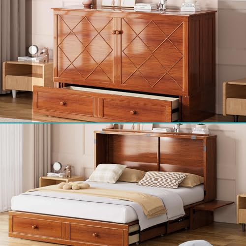 Mjkone Queen Size Murphy Bed with Tri-Folding Mattress, Charging Station, Modern Cabinet Bed with Drawers, Multifunctional Design Wall Murphy Beds for Living Room, Apartment (Cherry Pattern H)