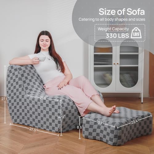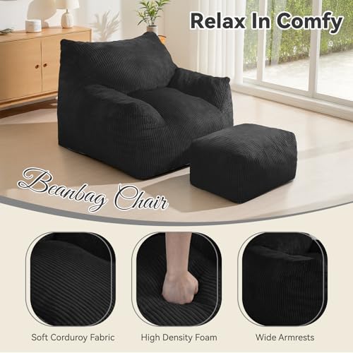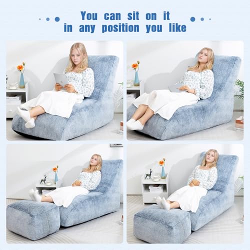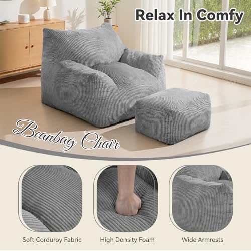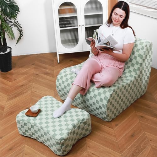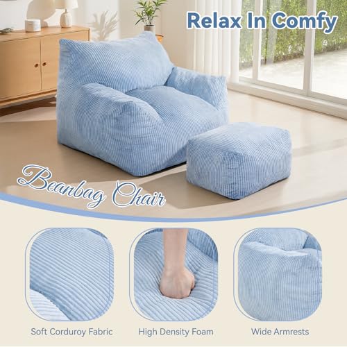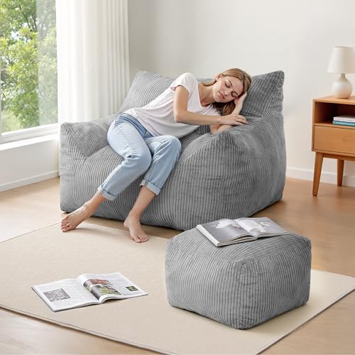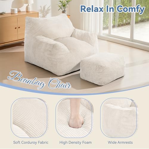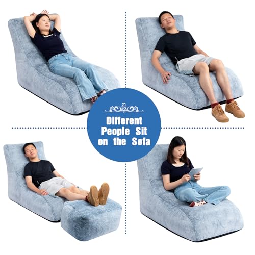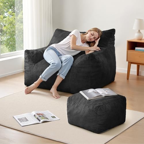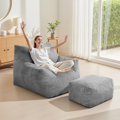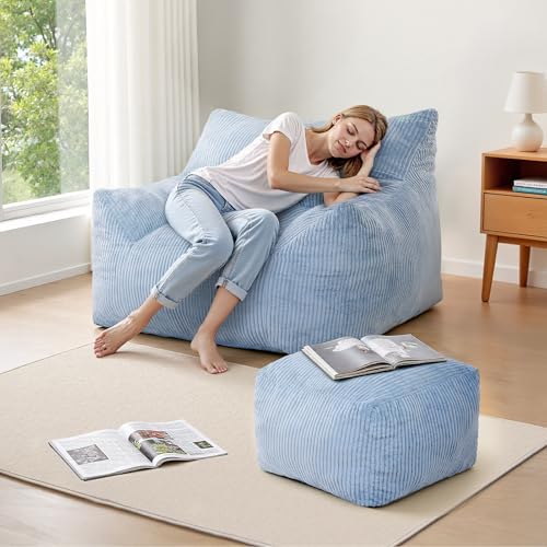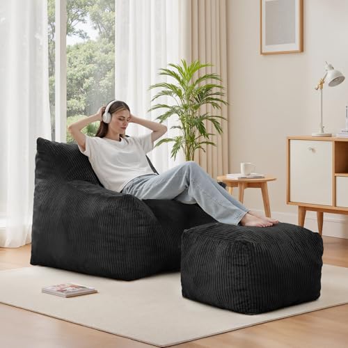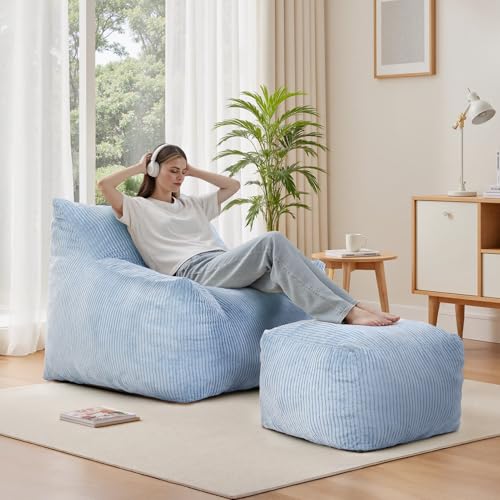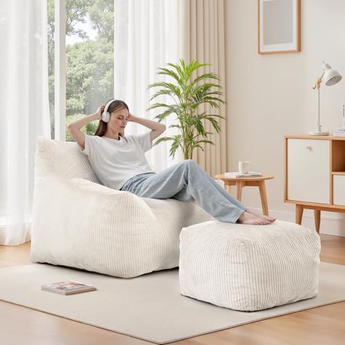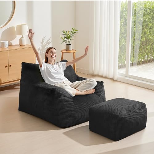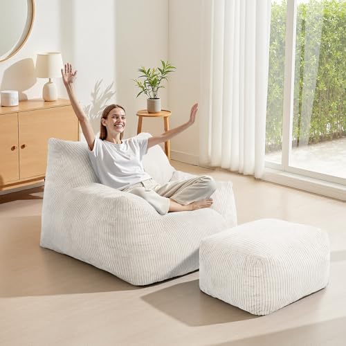 Bean Bag Chair with Ottoman, Comfy Bean Bag Sofa with Memory Foam, Lazy BeanBag Sofa with Footstool, Fireside Bean Bag Couch for Living Room, Bedroom, Apartment