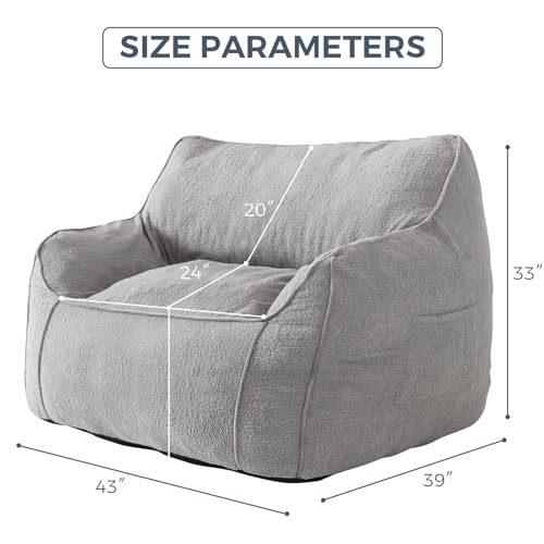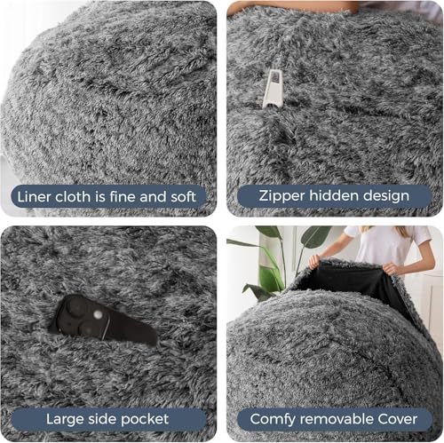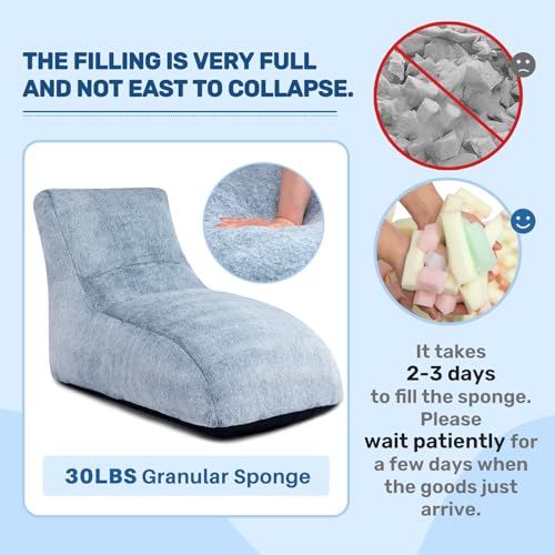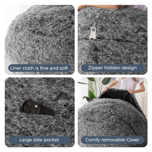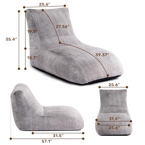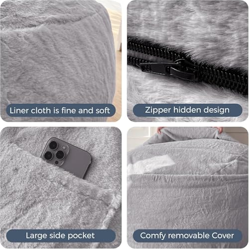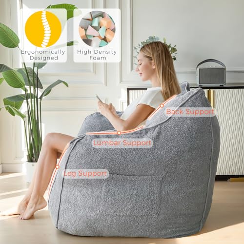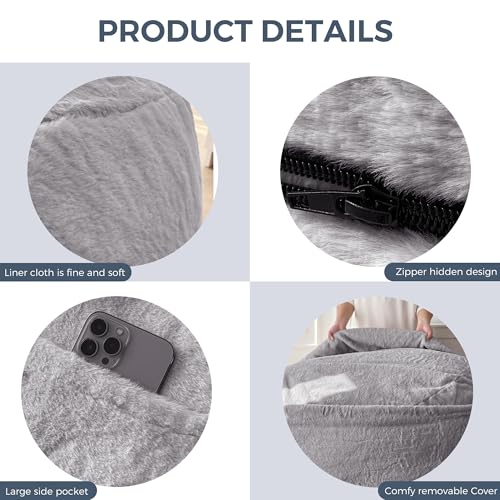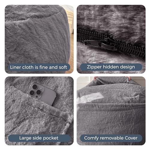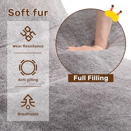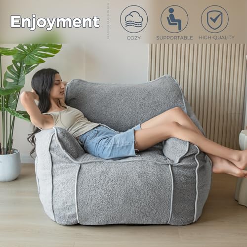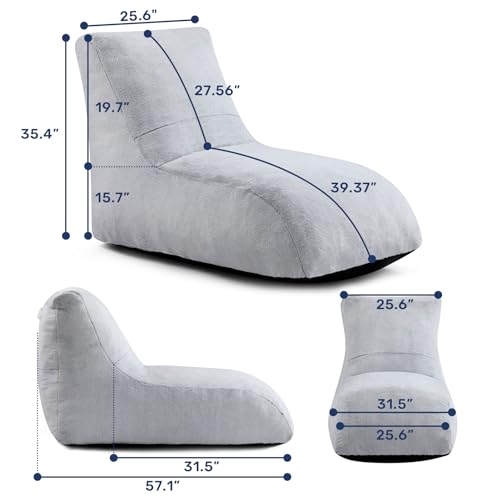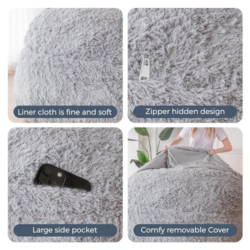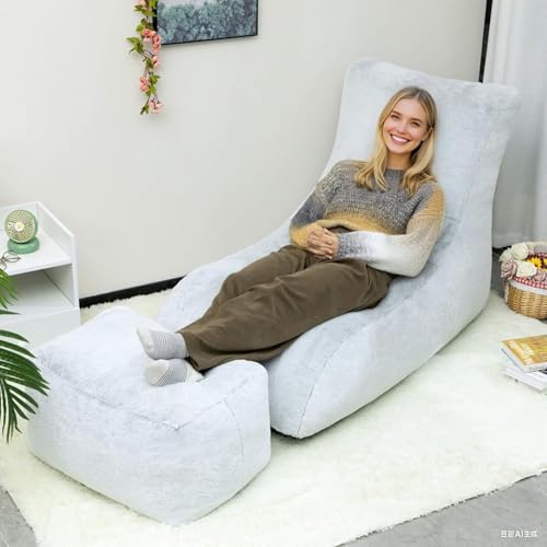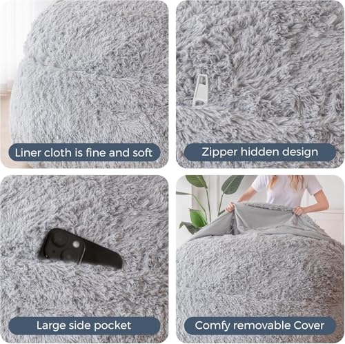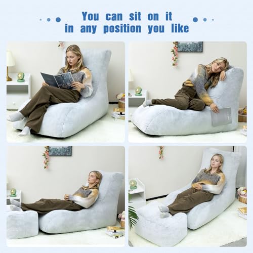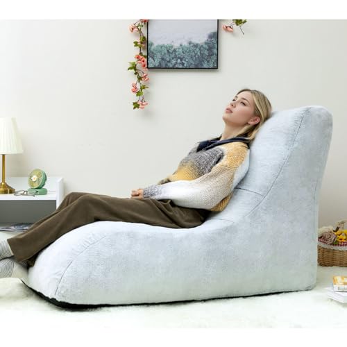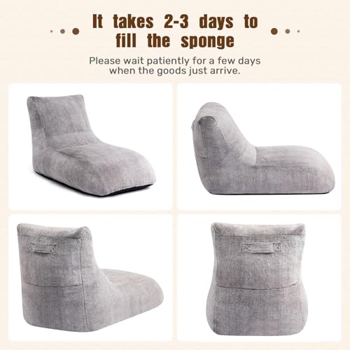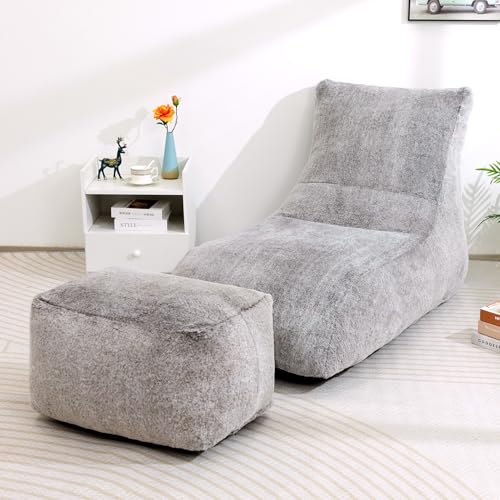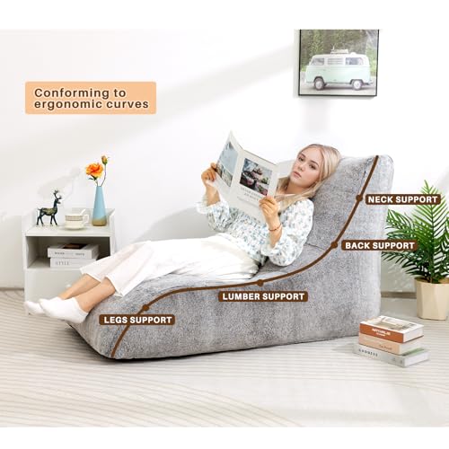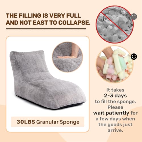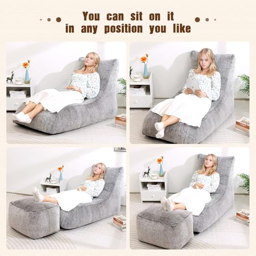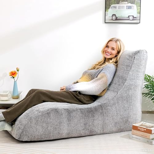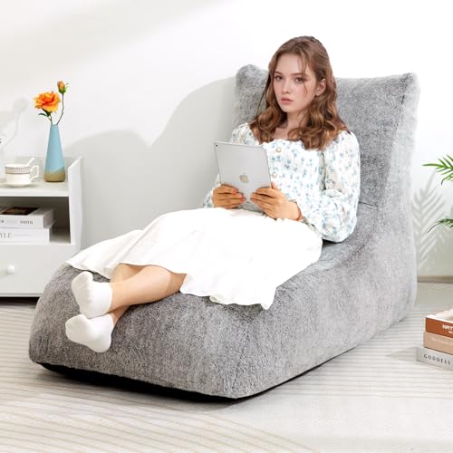 HollyHOME Accent Furry Bean Bag Chair, Extra-Large Zero-Gravity Chaise Lounge Chair for Adults, 30LB Memory Foam Bean Bag Sofa, Reading Lazy Chair for Living Room, Bedroom, Grey