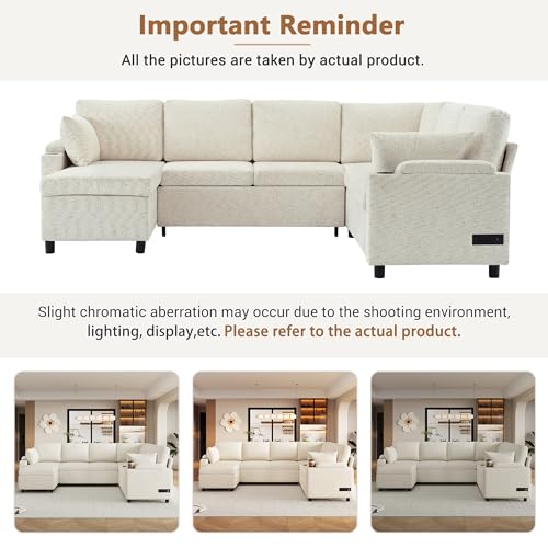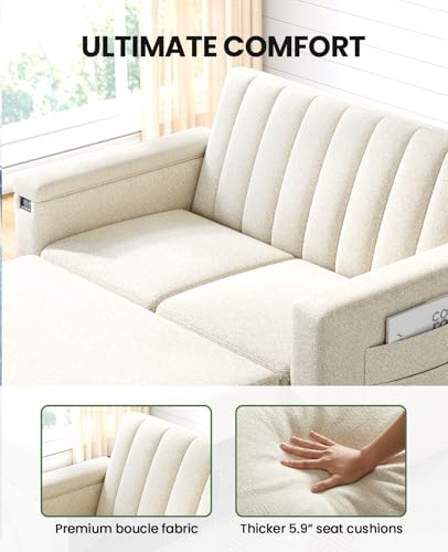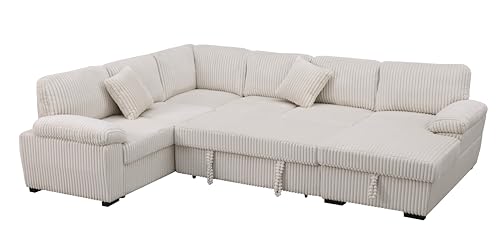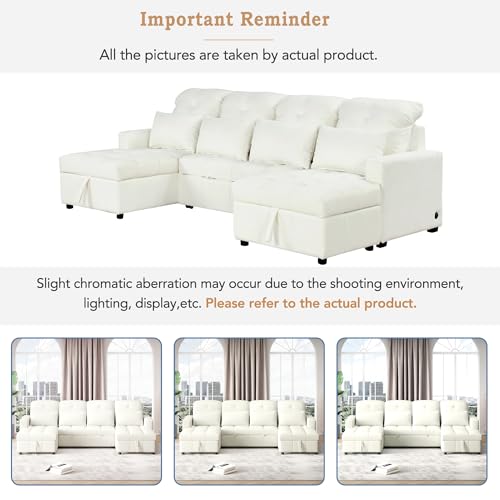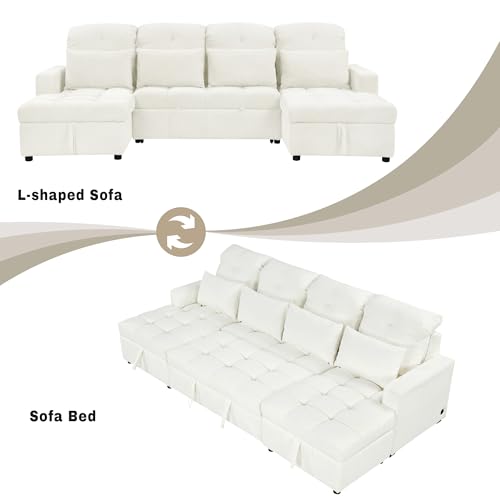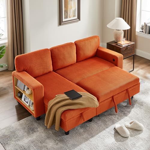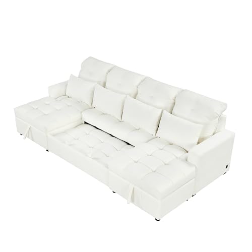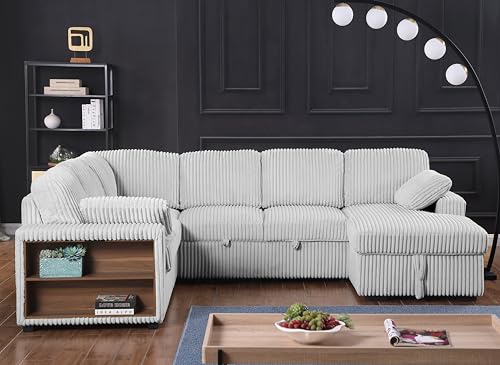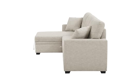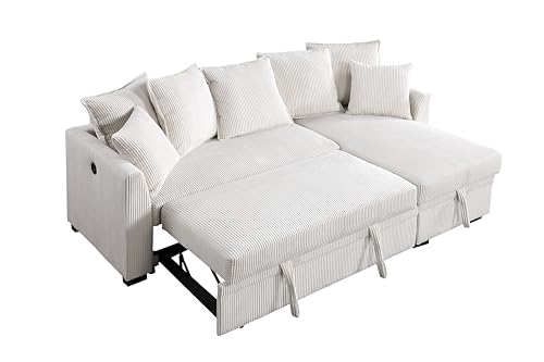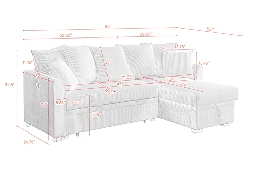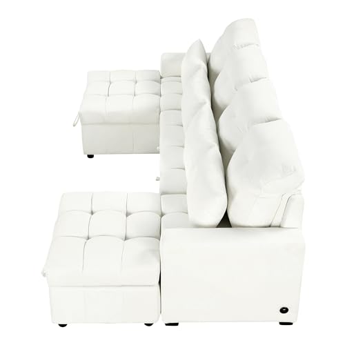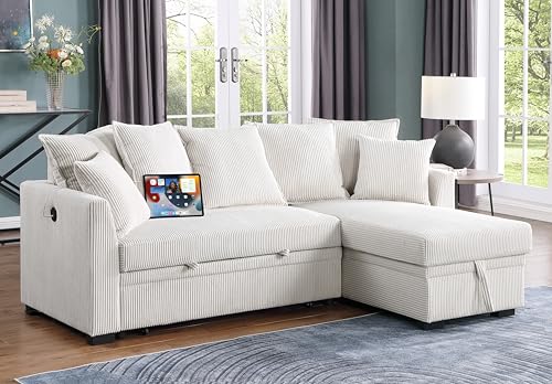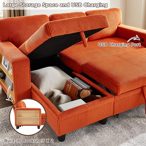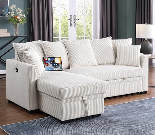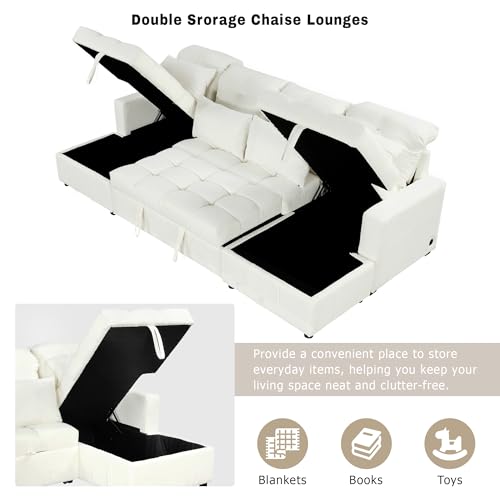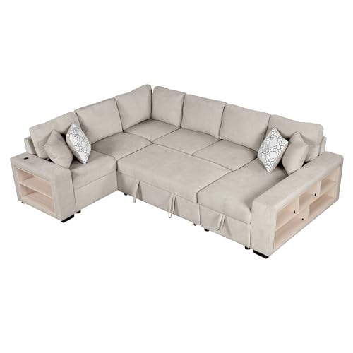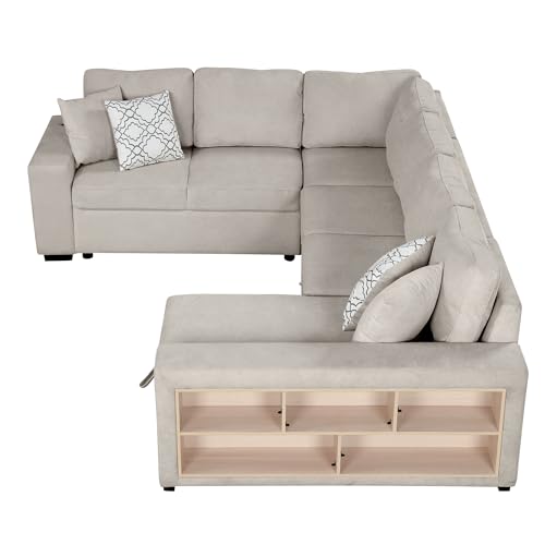 RedLemon 80” Sleeper Sofa Bed,L-Shaped Convertible Sectional Couch with Storage Chaise,2 Built-in Bookshelves and USB Charging Port - Comfy Sofa for Living Room, Apartment, Beige