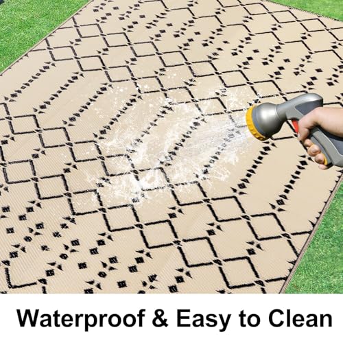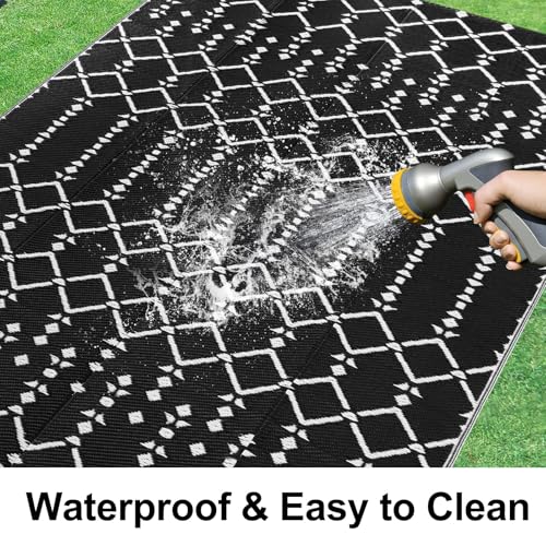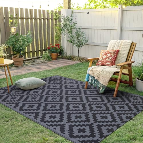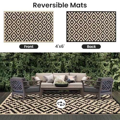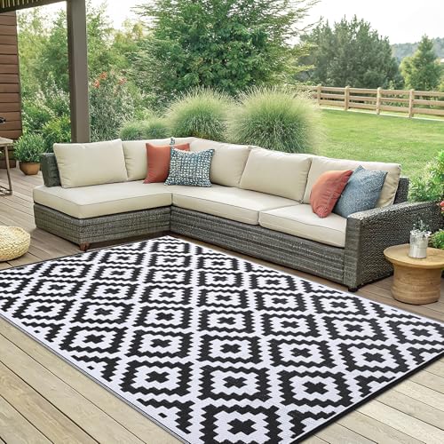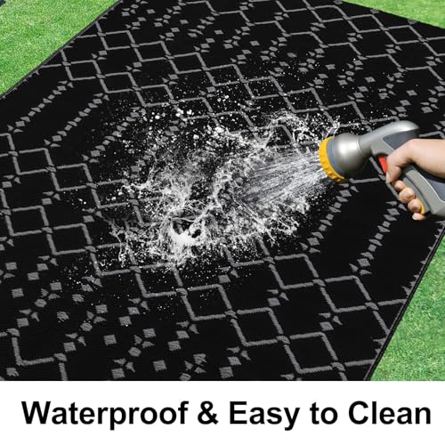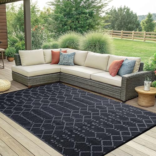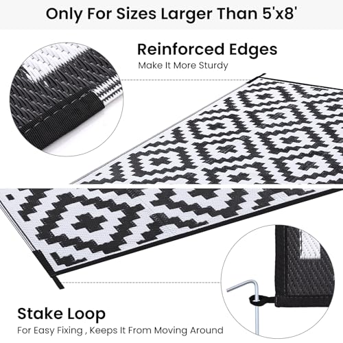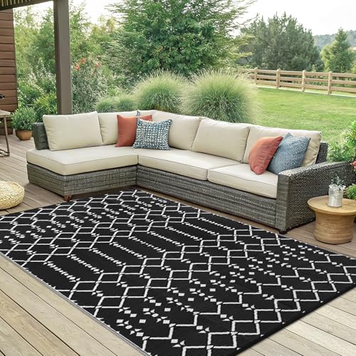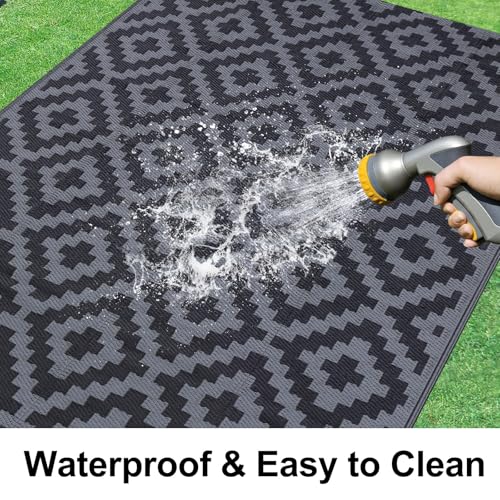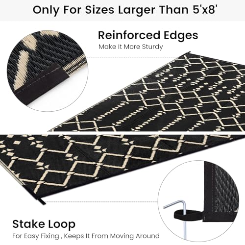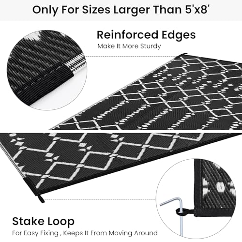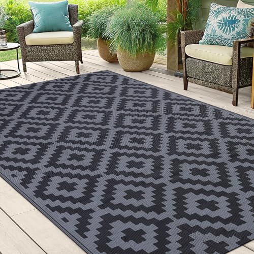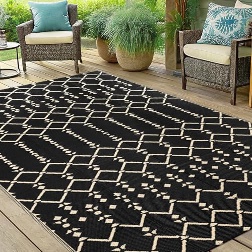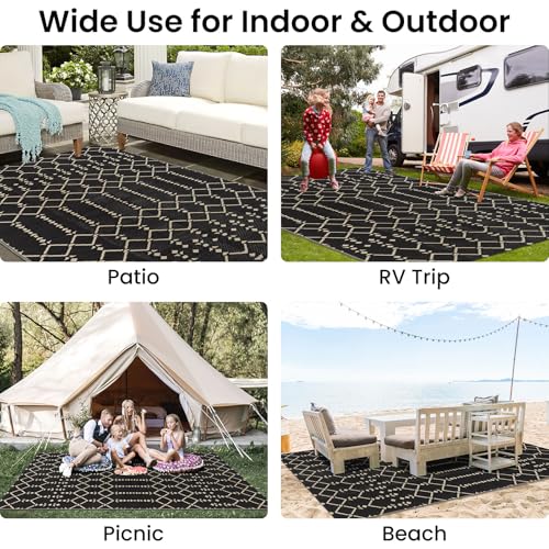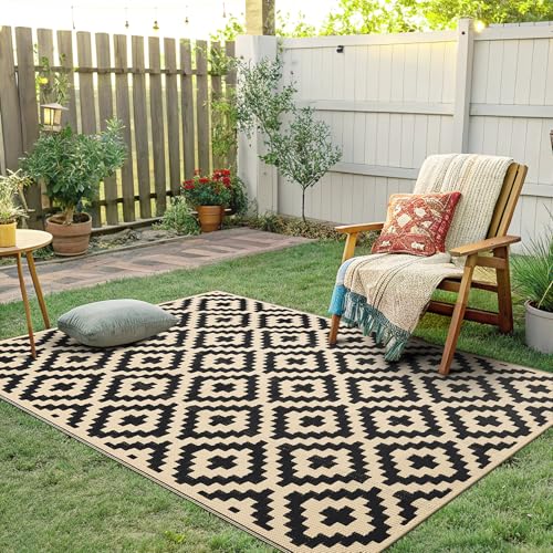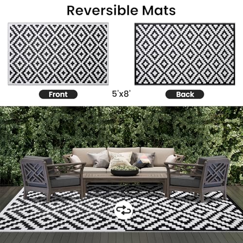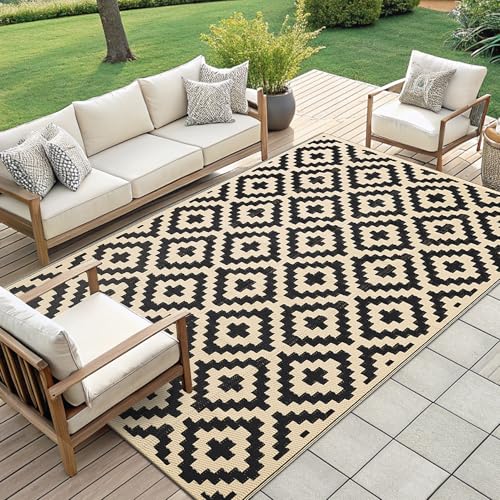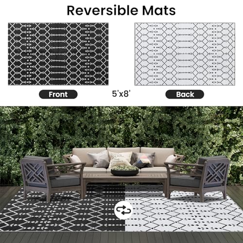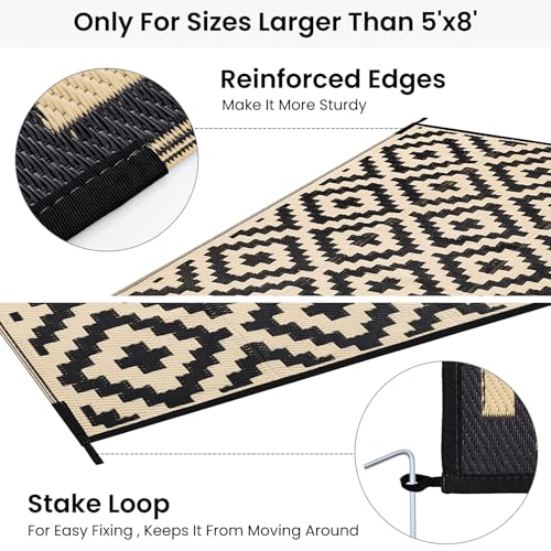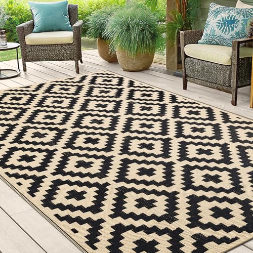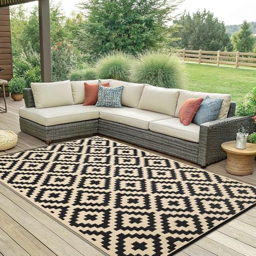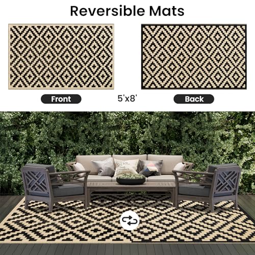 Smiry Waterproof Outdoor Rug 5x8 ft, Reversible Plastic Straw Patio Camping Rugs, Outdoor Indoor RV Mat Carpet for Patio, Outside Entry, Backyard, Deck, Bench, Picnic, Camper, Black & Beige