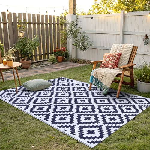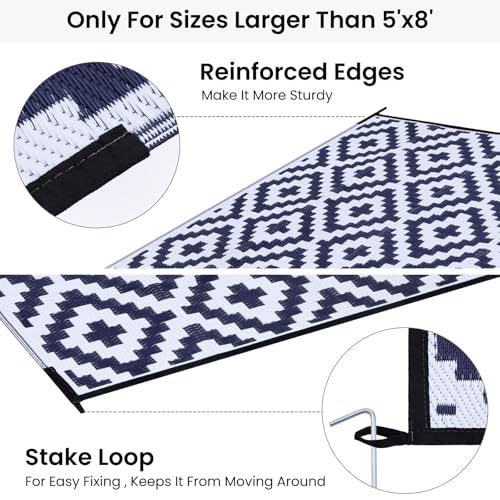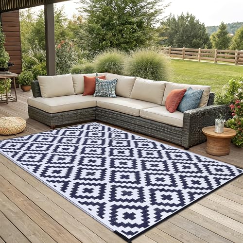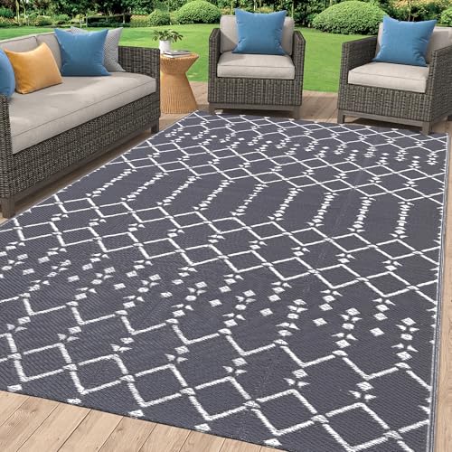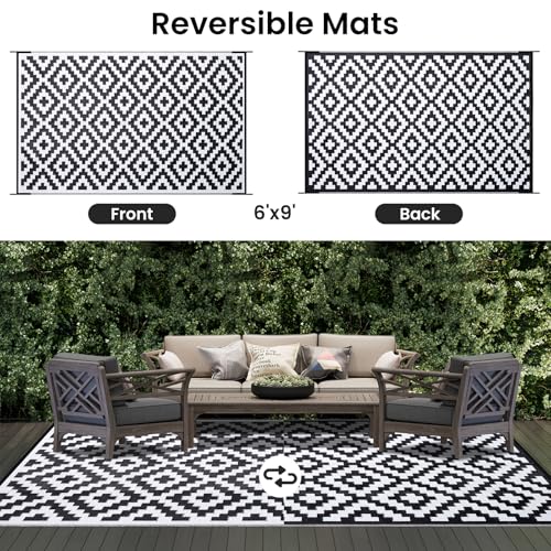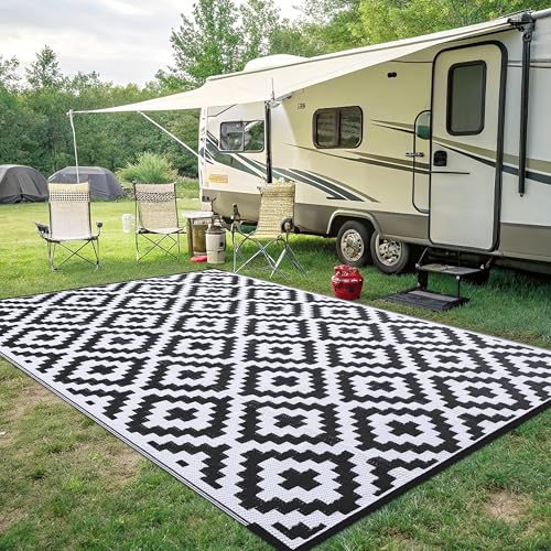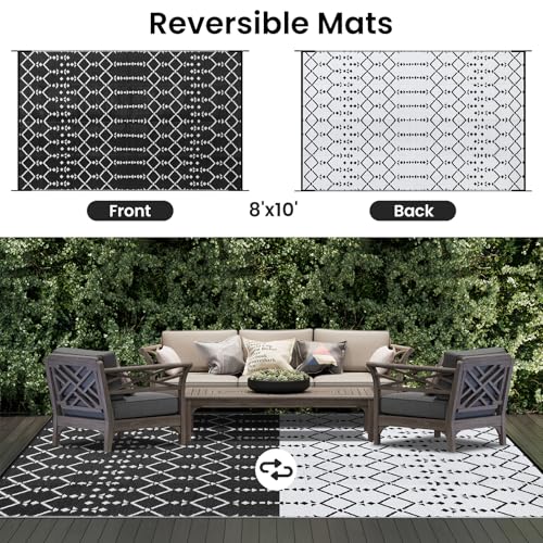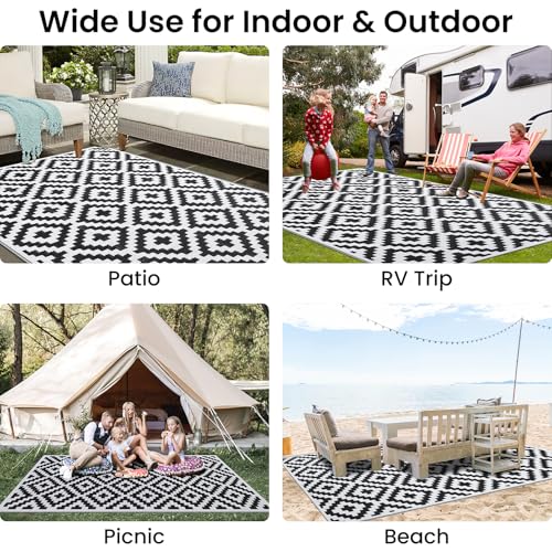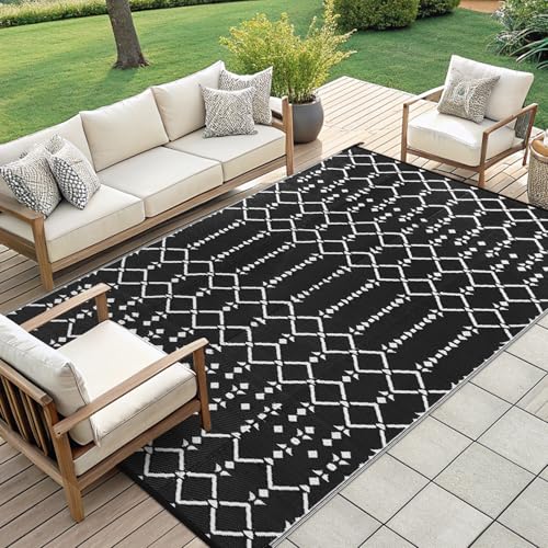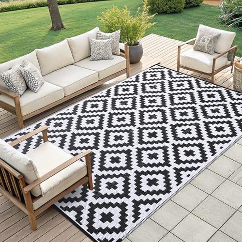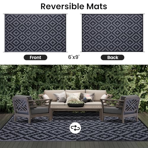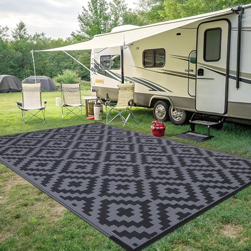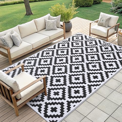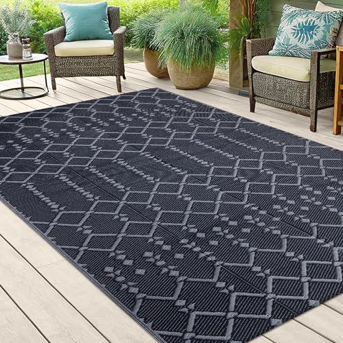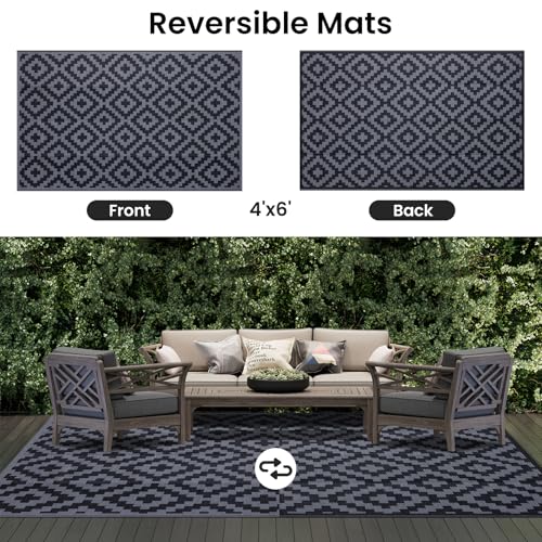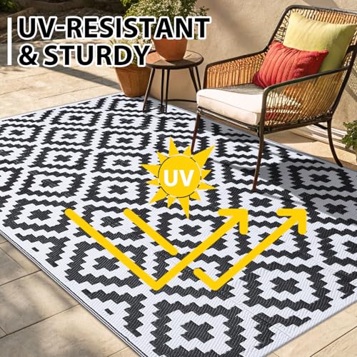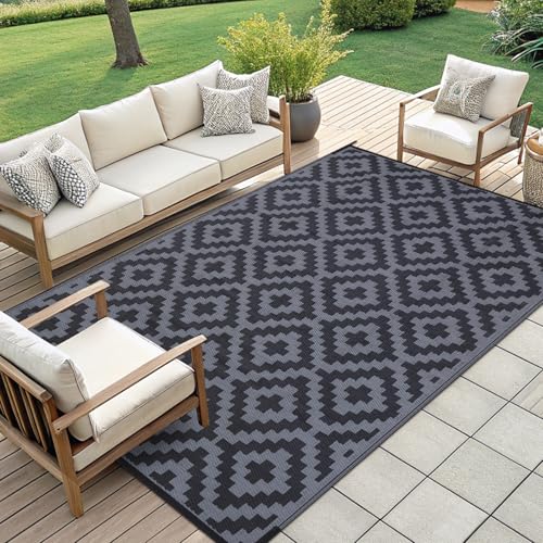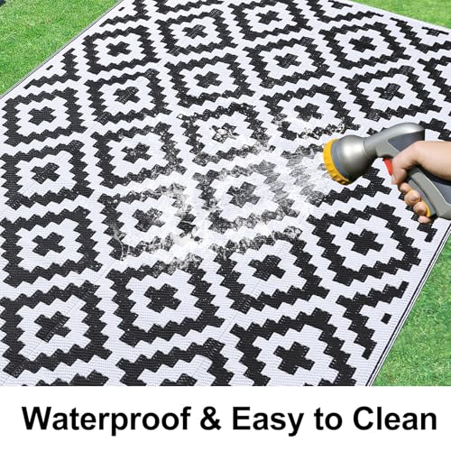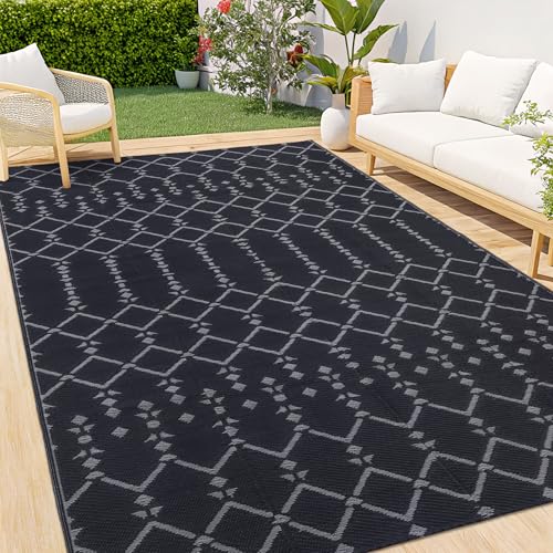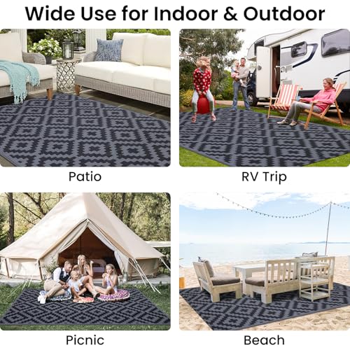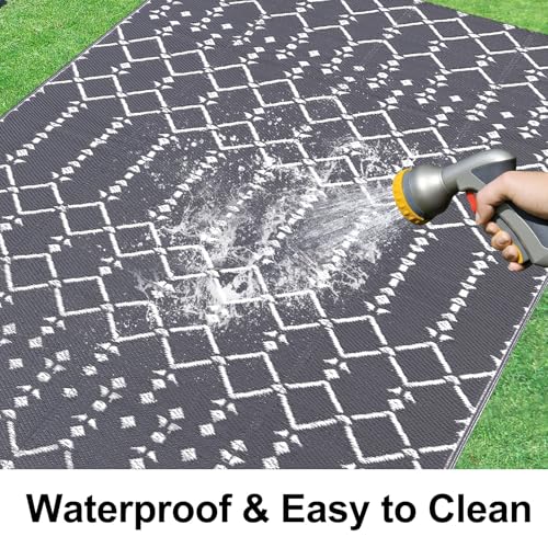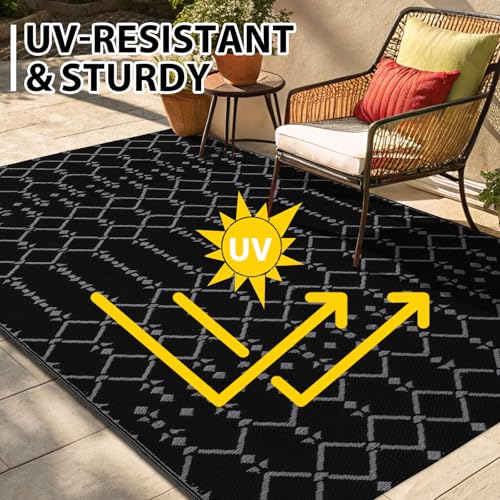Smiry Waterproof Outdoor Rug 5x8 ft, Reversible Plastic Straw Patio Camping Rugs, Outdoor Indoor RV Mat Carpet for Patio, Outside Entry, Backyard, Deck, Bench, Picnic, Camper, Black & Beige