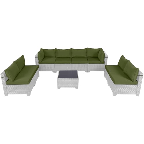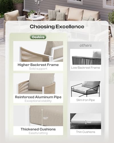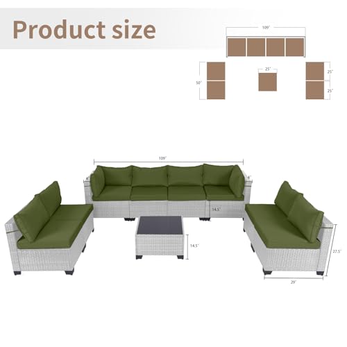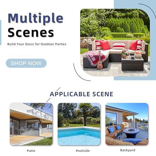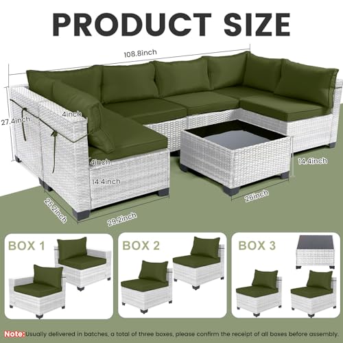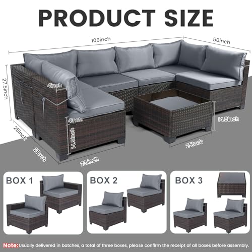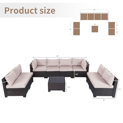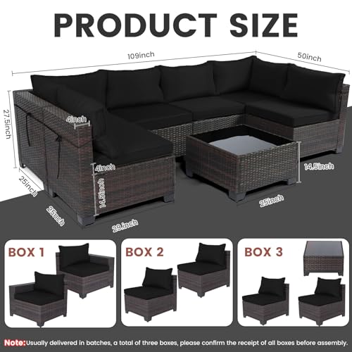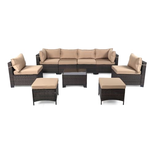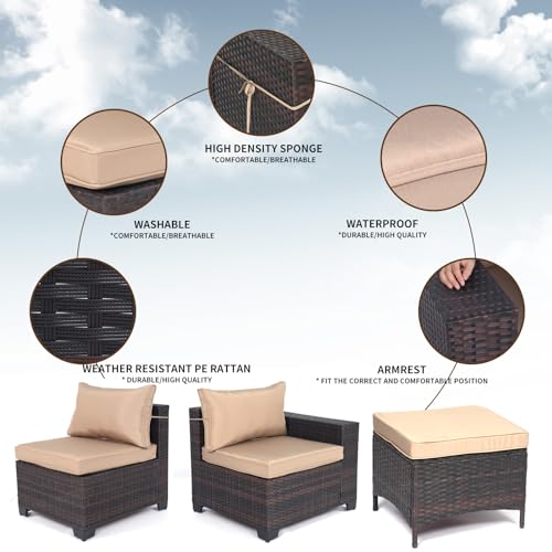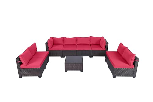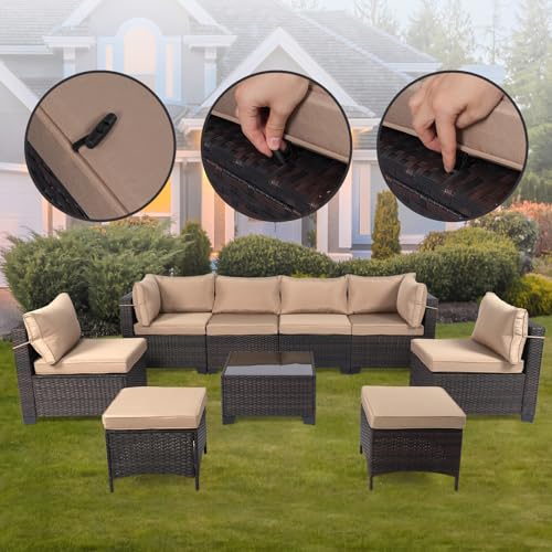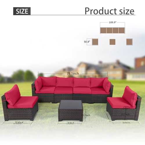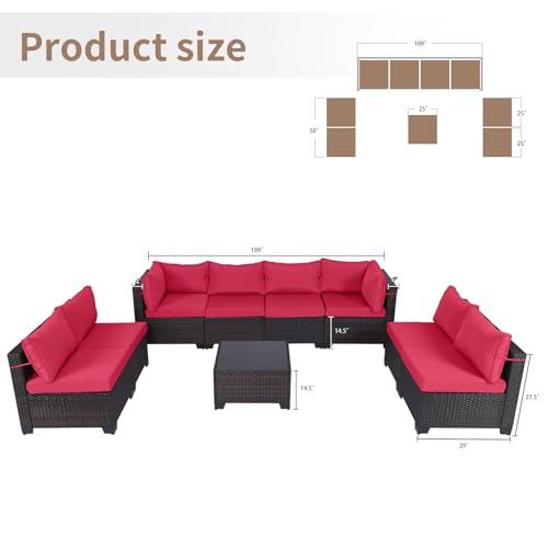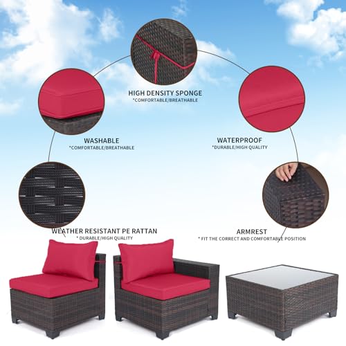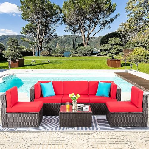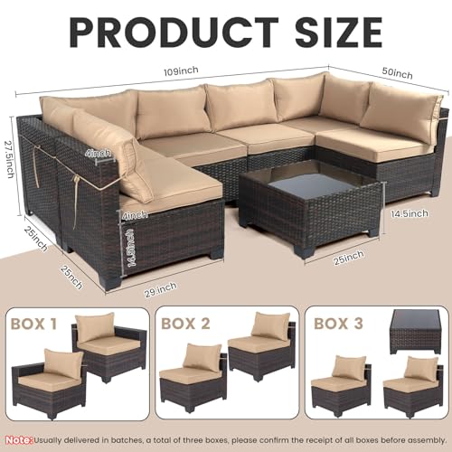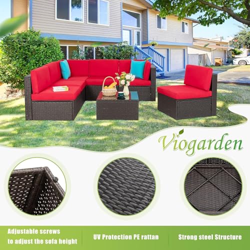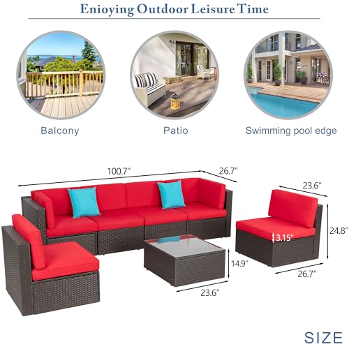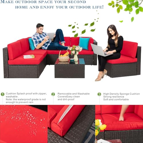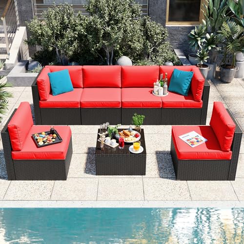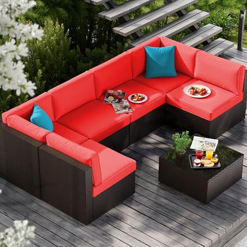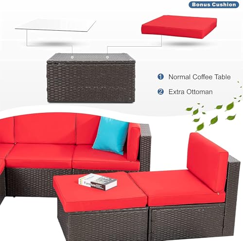 Shintenchi 7 Pieces Patio Furniture Sets Outdoor All-Weather Sectional Patio Sofa Set PE Rattan Manual Weaving Wicker Patio Conversation Set with Glass Table&Ottoman Cushion and Red Pillows, Beige