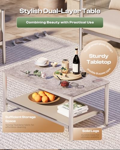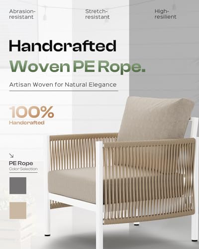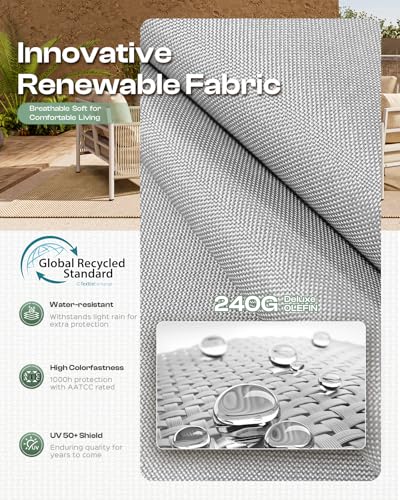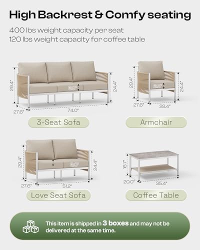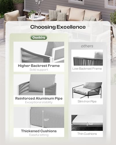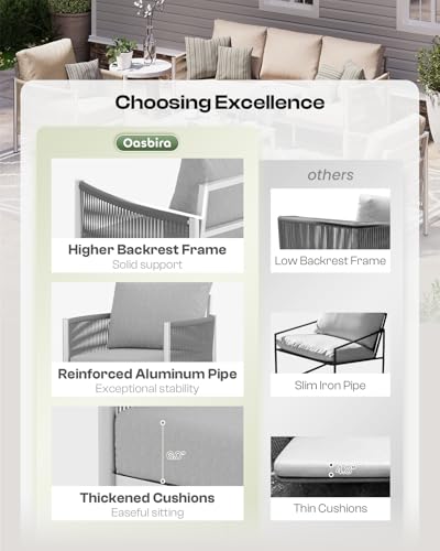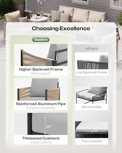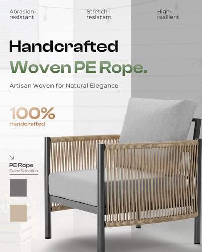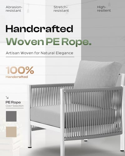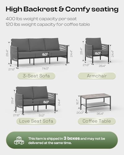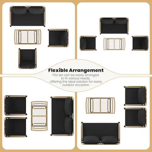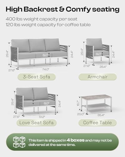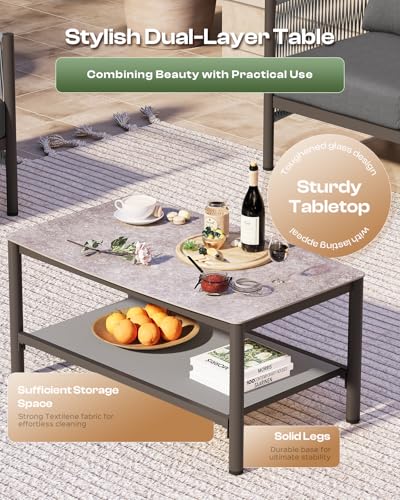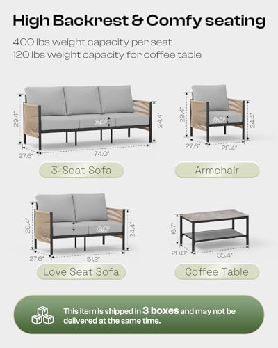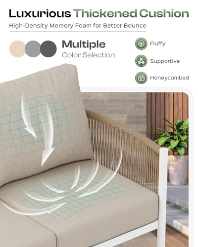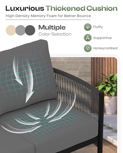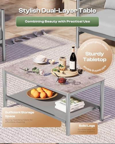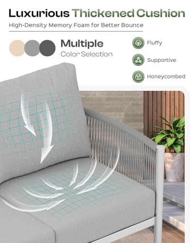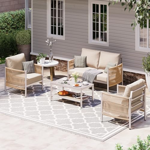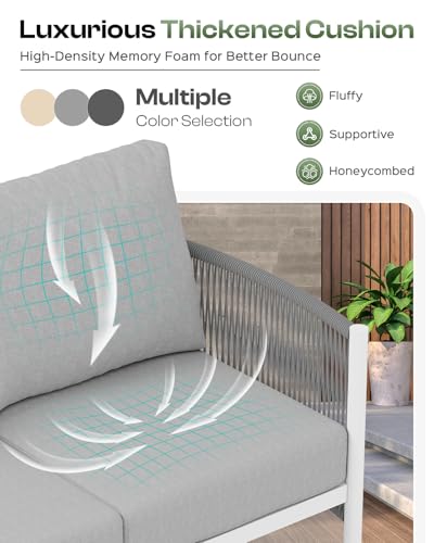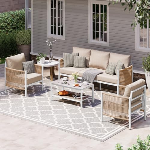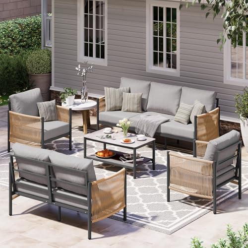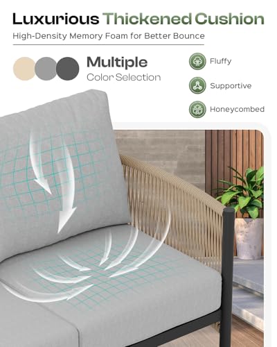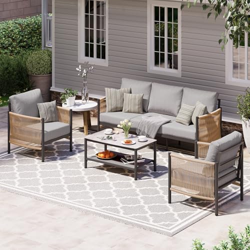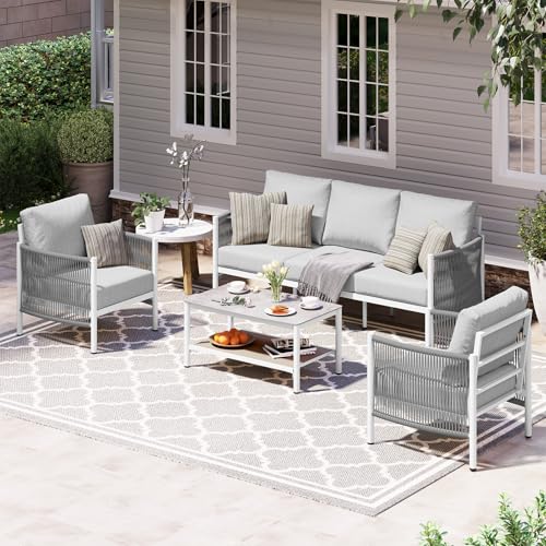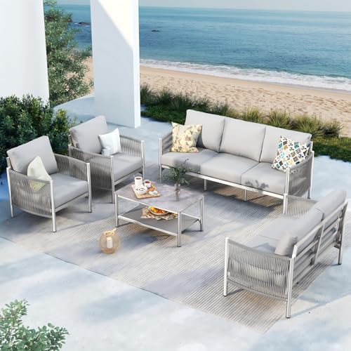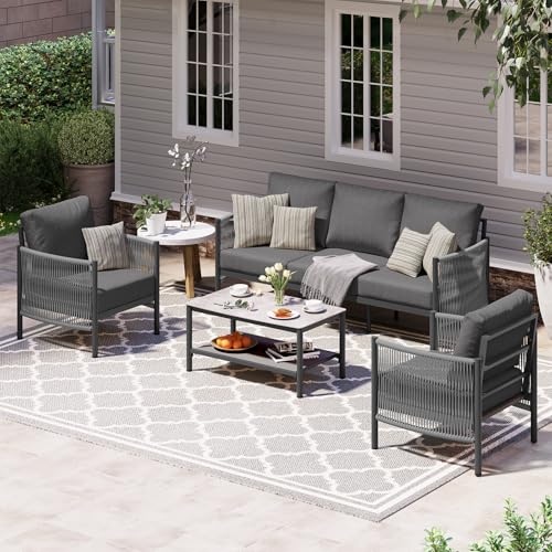 Aluminum Outdoor Patio Furniture Set, HDPE Rope 5 Piece Modern Sectional Conversation Sets with Dual-Layer Coffee Table, All Weather Patio Couch Sofa with Thick Cushions, Gray Frame, Gray