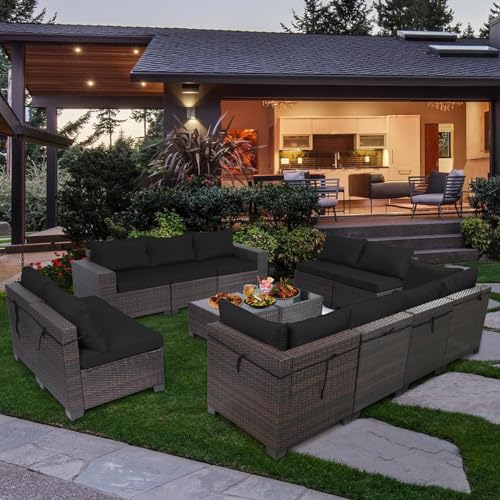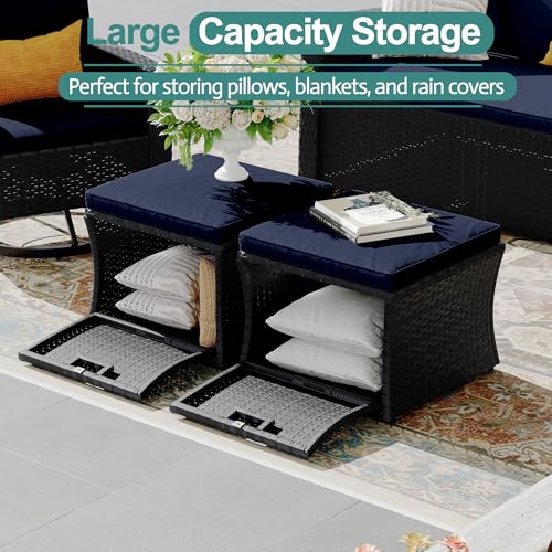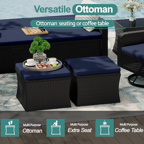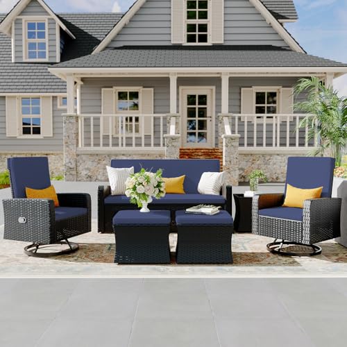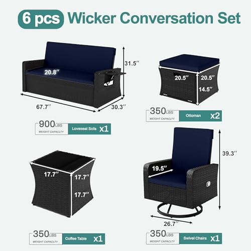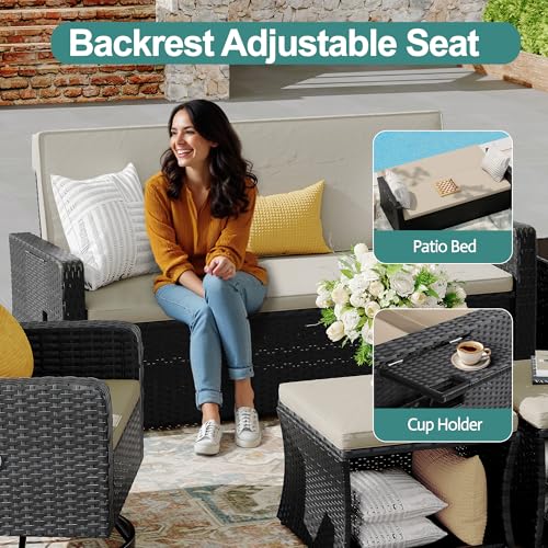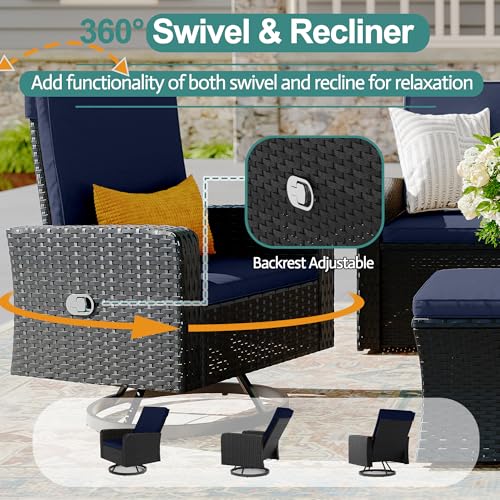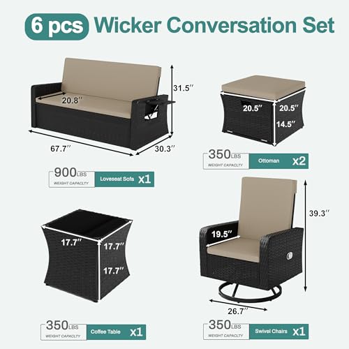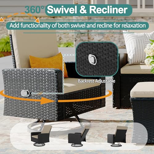 6 Piece Patio Furniture Set, Wicker Patio Conversation Sets with Swivel & Recline Chairs, Outdoor Sectional Sofa Sets with 2 Storage Ottoman, Outdoor Patio Recline Set for Backyard