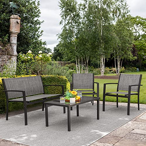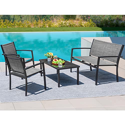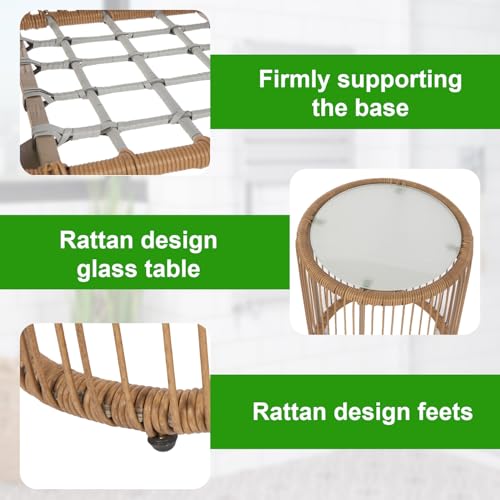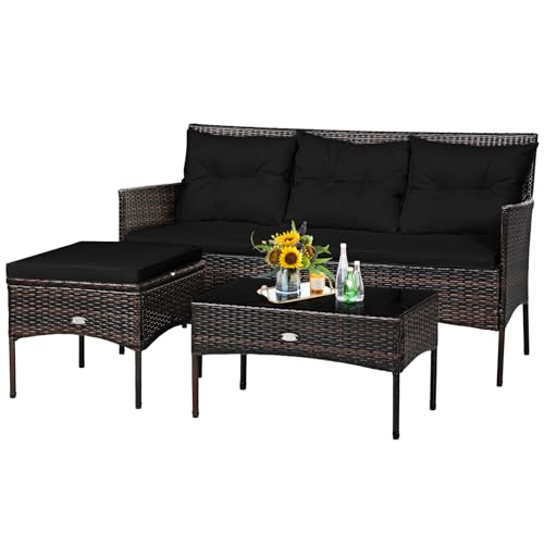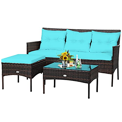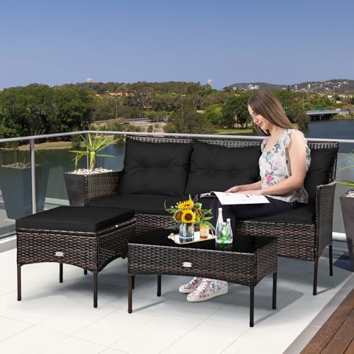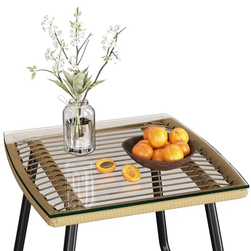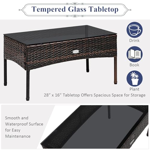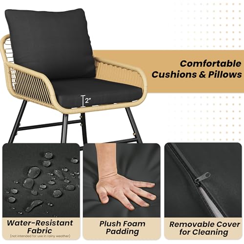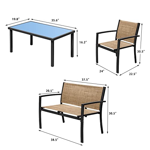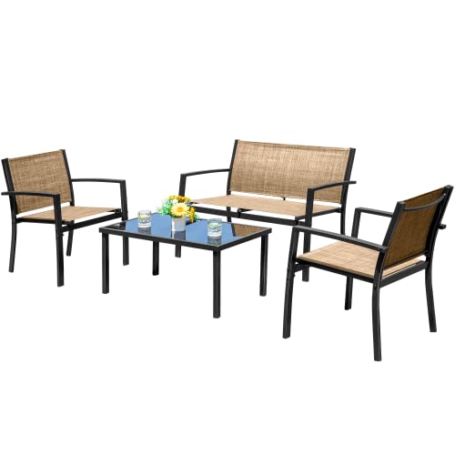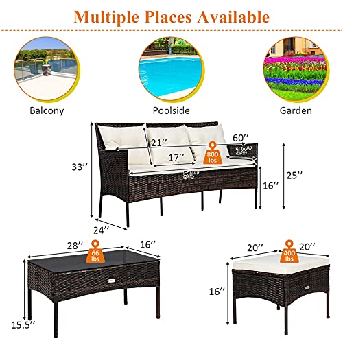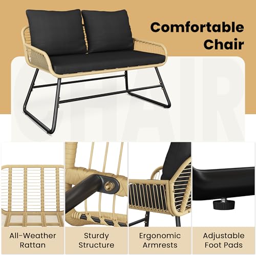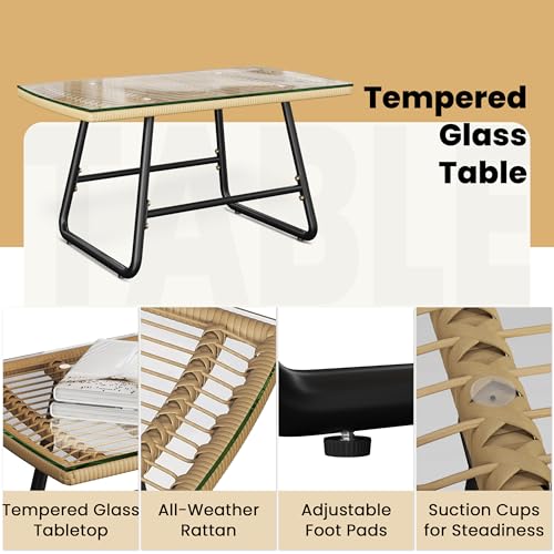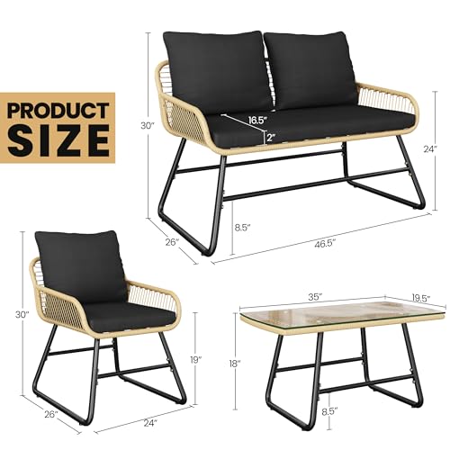 Yaheetech 4 Piece Patio Furniture Set, Outdoor Wicker Conversation Sets, Boho Loveseat & 2 Armchairs with Cushion and Pillow, Glass Top Table for Backyard, Porch, Balcony, Deck - Tan/Cream