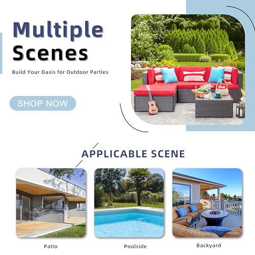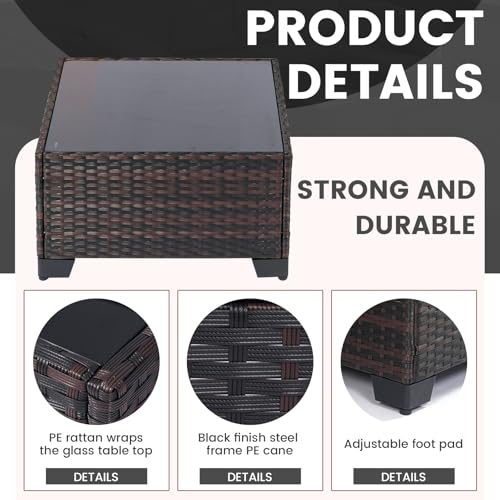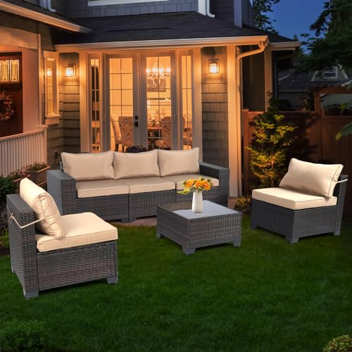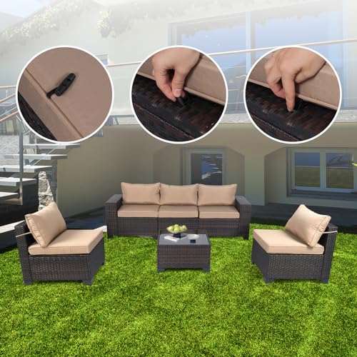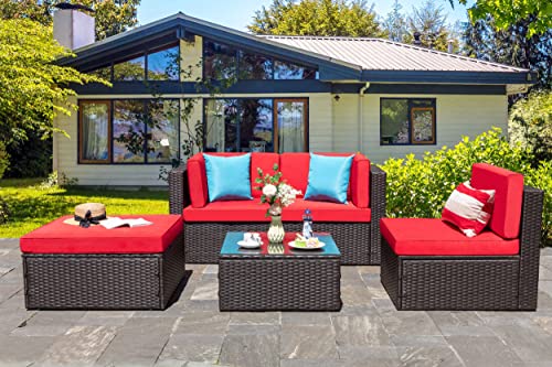 Vongrasig 5 Piece Patio Furniture Sets, All-Weather Brown PE Wicker Outdoor Couch Sectional Set, Small Conversation Set for Garden/Patio w/Ottoman, Glass Table, Red Pillow, Beige