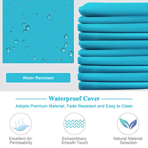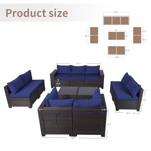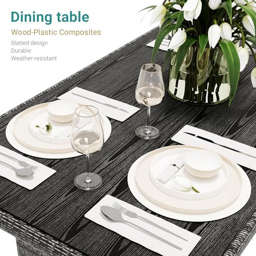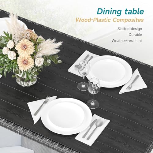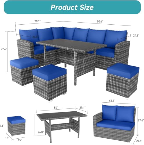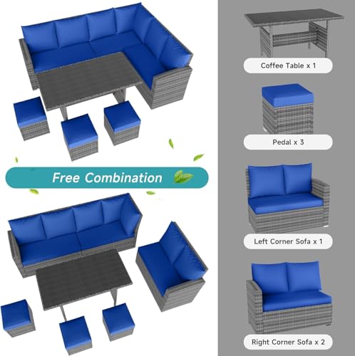 7 Piece Outdoor Patio Furniture Set with Plastic Wooden Table, Patio Rattan Conversationr Sofa Set, All Weather Sectional Rattan Sofa and Chairs, Garden, Porch, Poolside, Blue