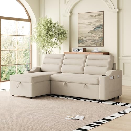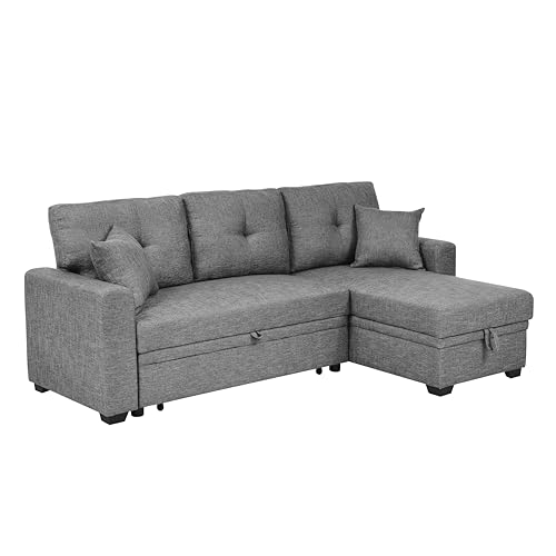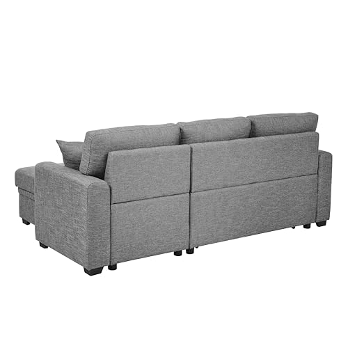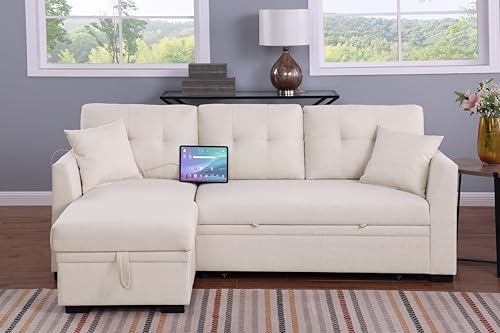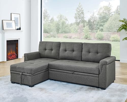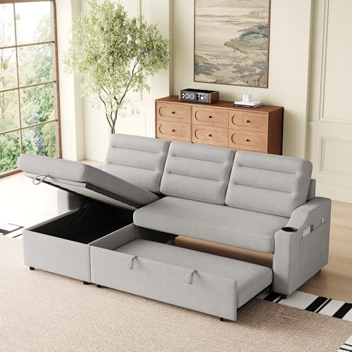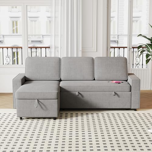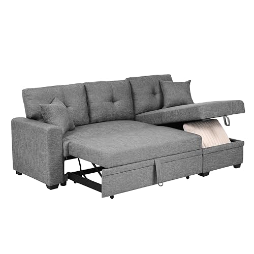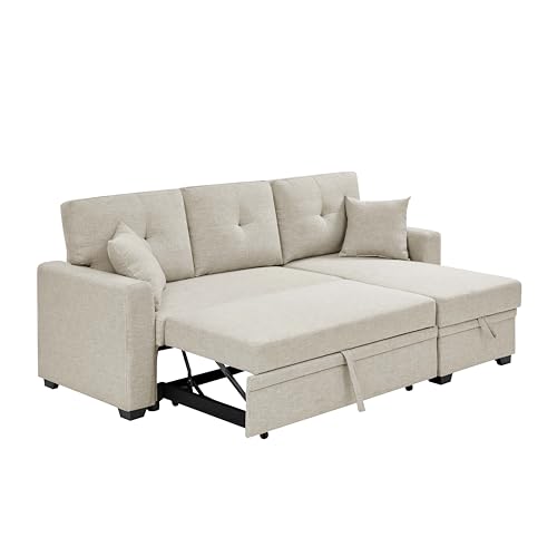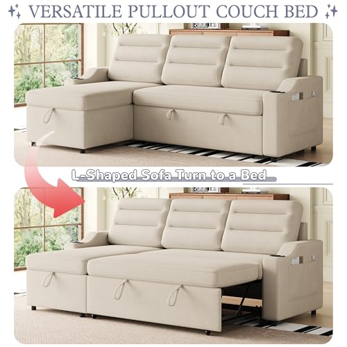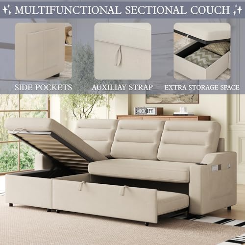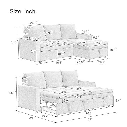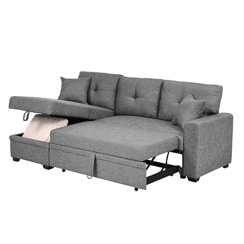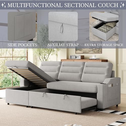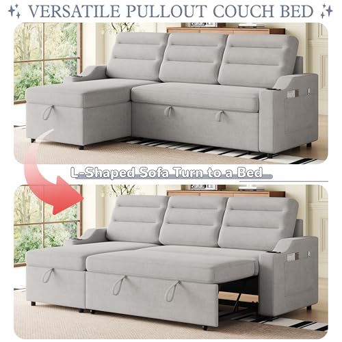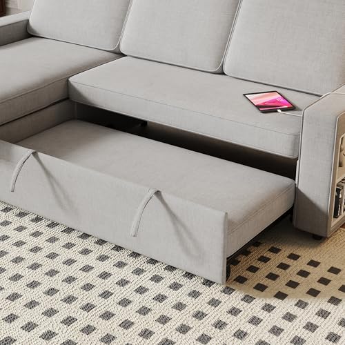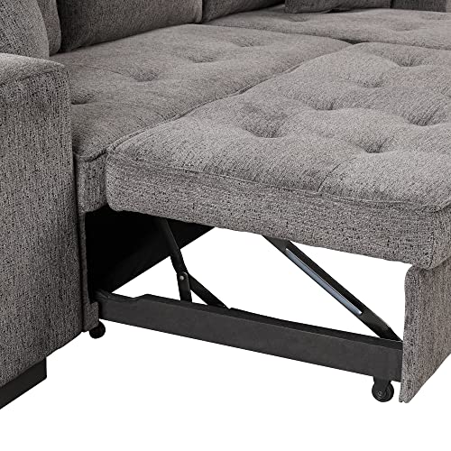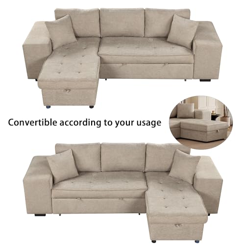 86 INCH L Shaped Convertible Sleeper Sectional Sofa Pull-Out Couch Bed, Tufted Linen Upholstered Reversible Corner Couch Pullout Sofabed w/Detachable Backrest and Storage Chaise for Living Room Office
