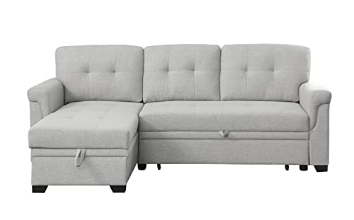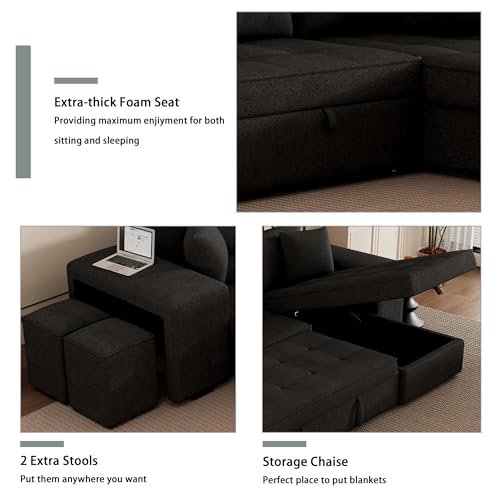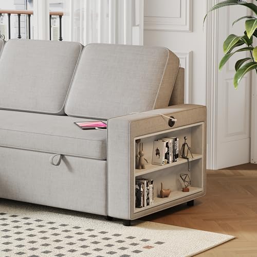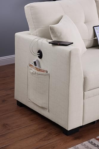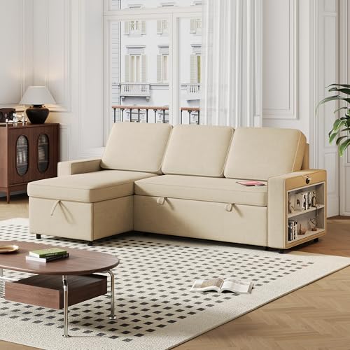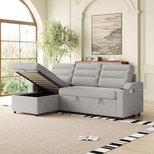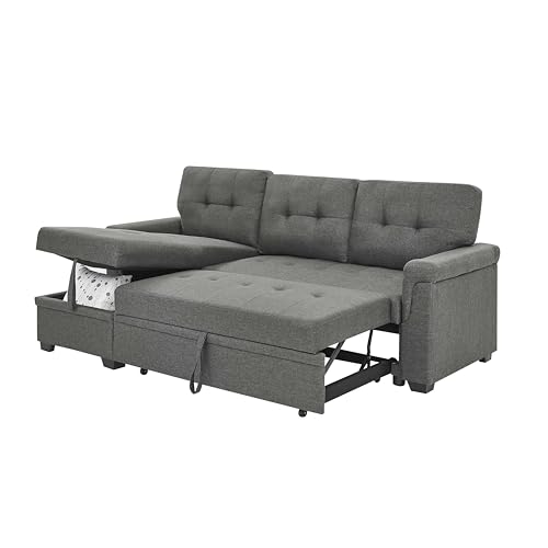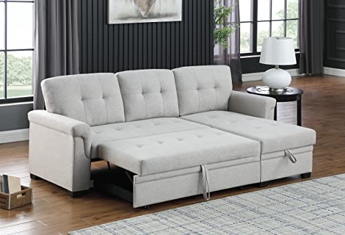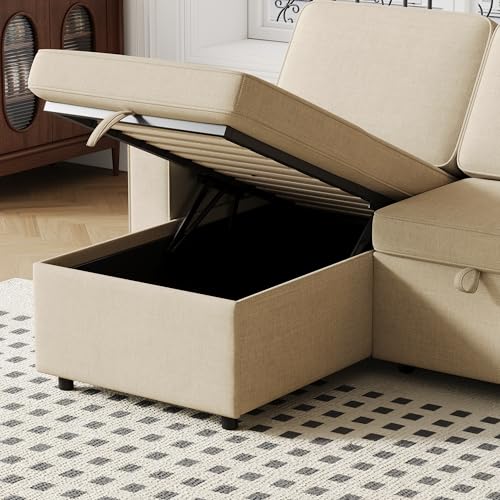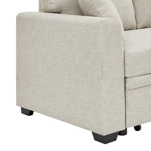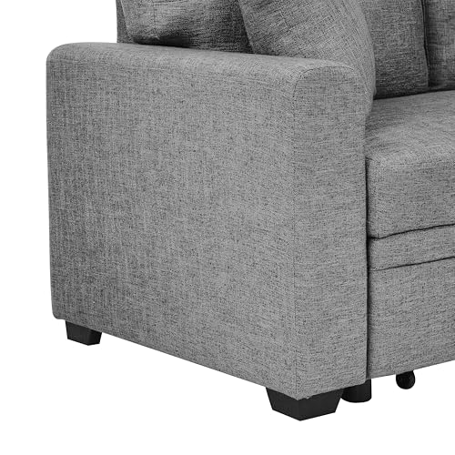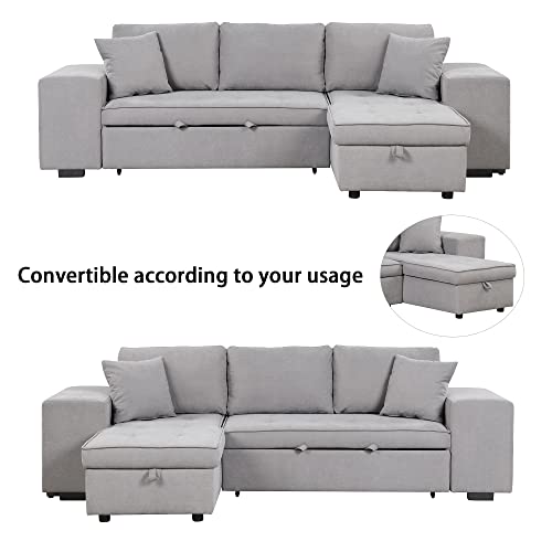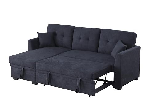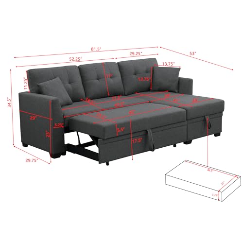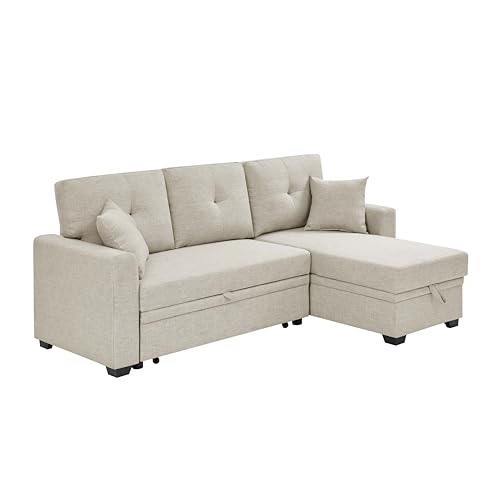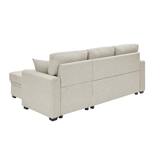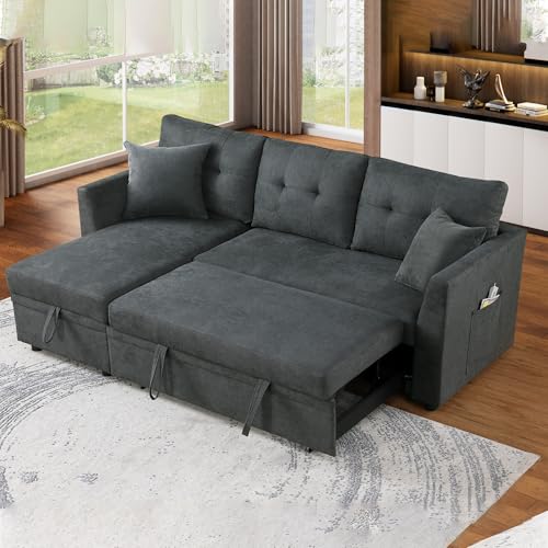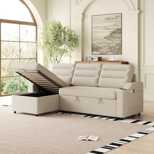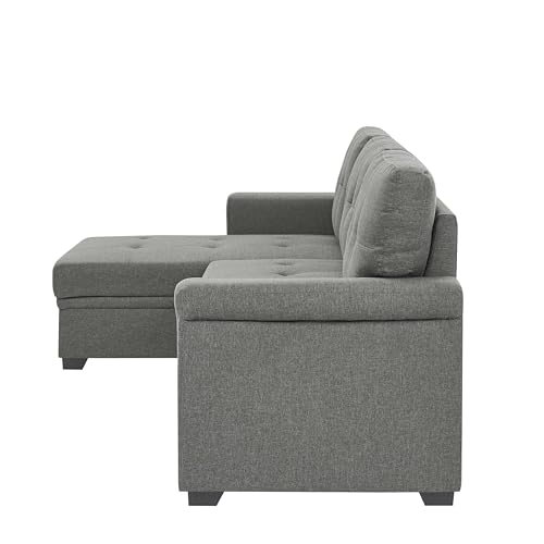 86 INCH L Shaped Convertible Sleeper Sectional Sofa Pull-Out Couch Bed, Tufted Linen Upholstered Reversible Corner Couch Pullout Sofabed w/Detachable Backrest and Storage Chaise for Living Room Office