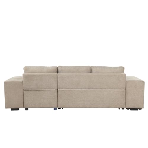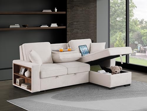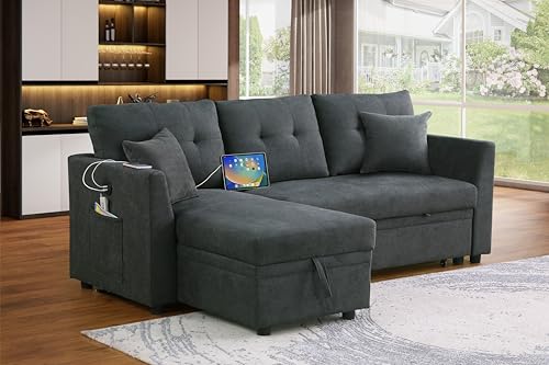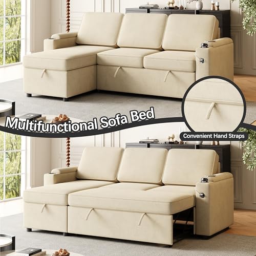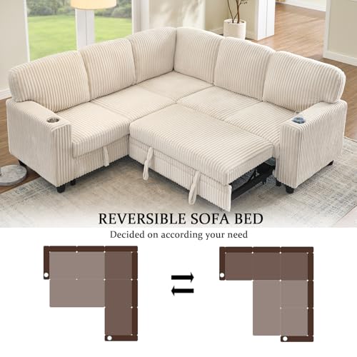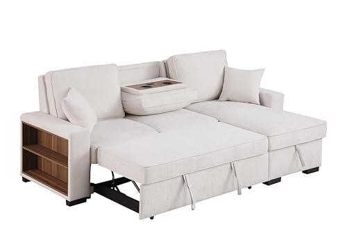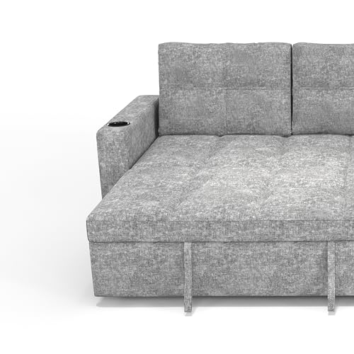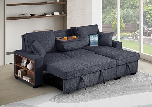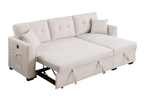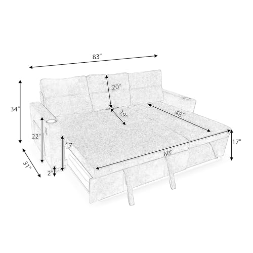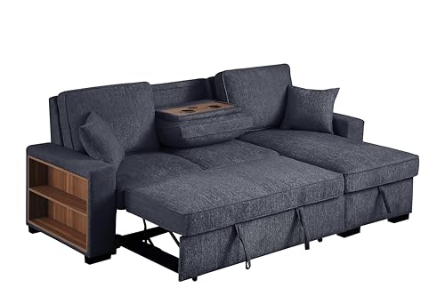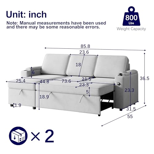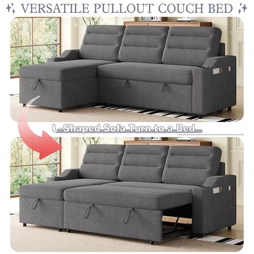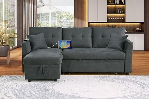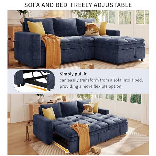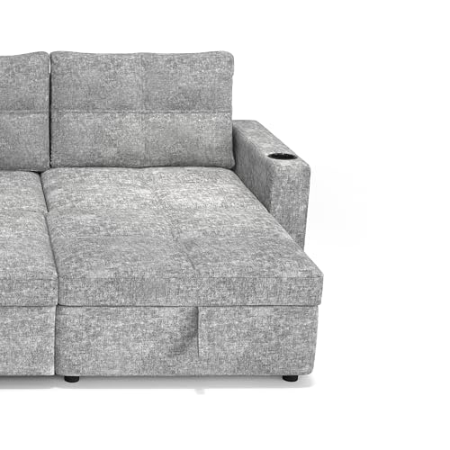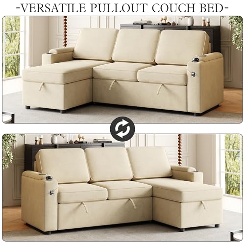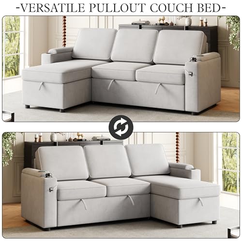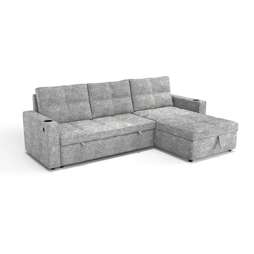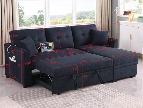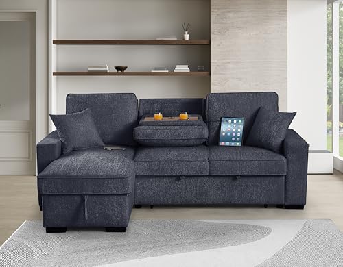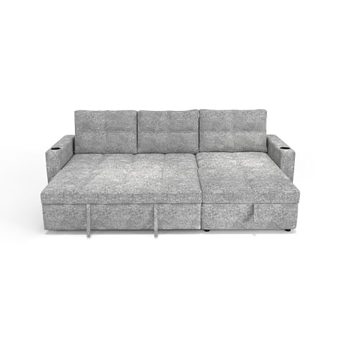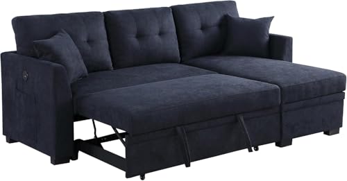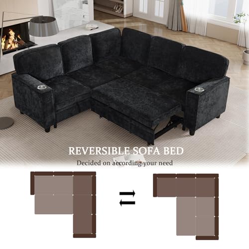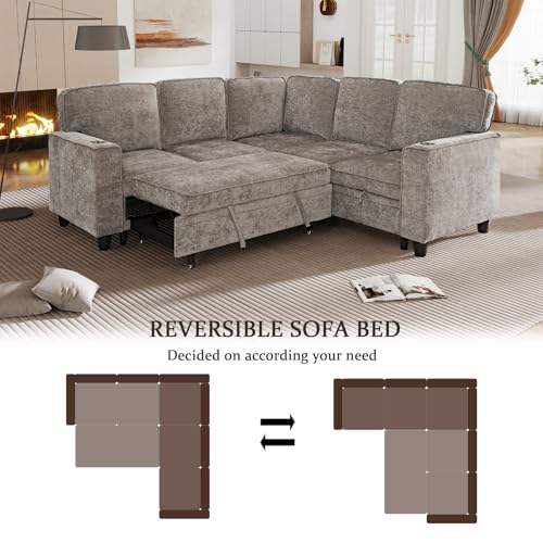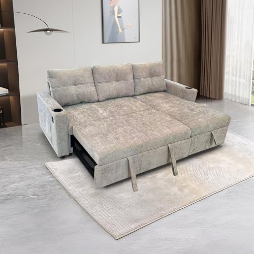 86 INCH Reversible Sleeper Sectional Sofa with Pull Out Couch Bed , Convertible L Shaped Corner Sofa ,Chenille Upholstered Pullout Lounge Sofabed with Chaise ,Cupholders, USB Charging for Living Room