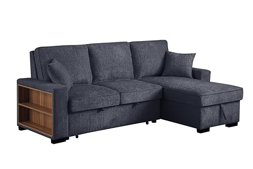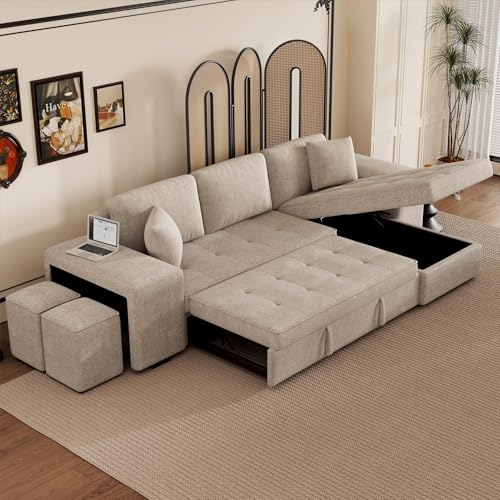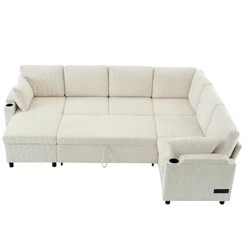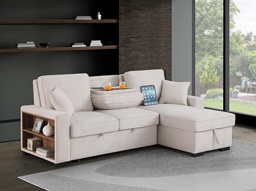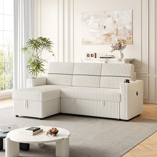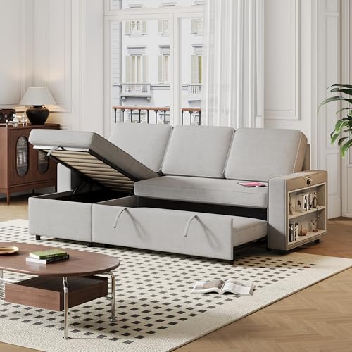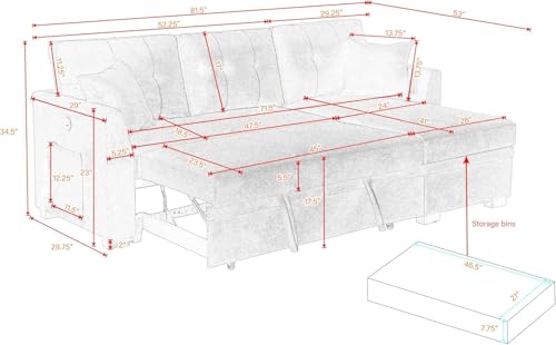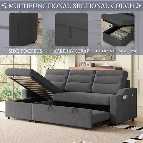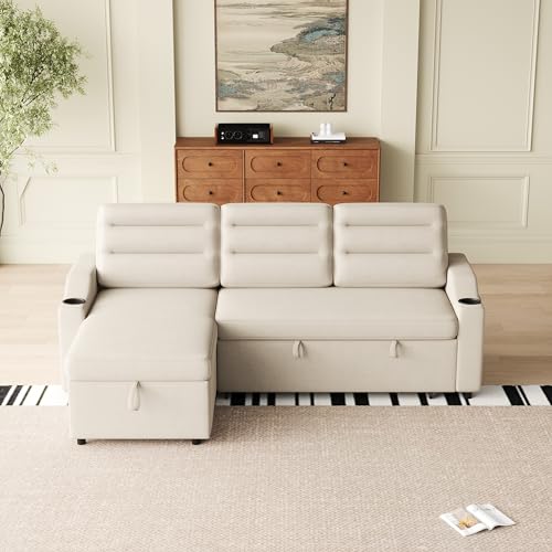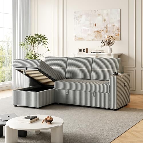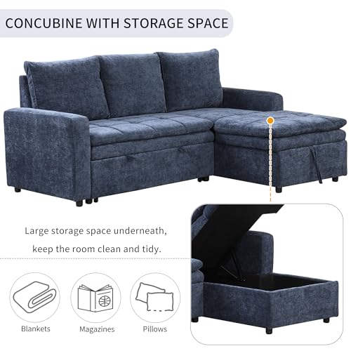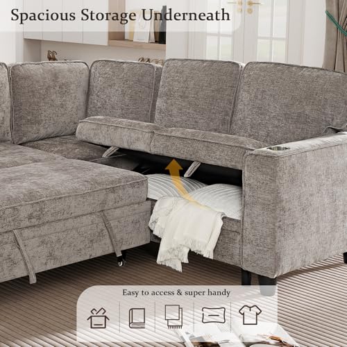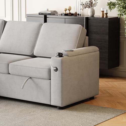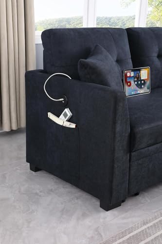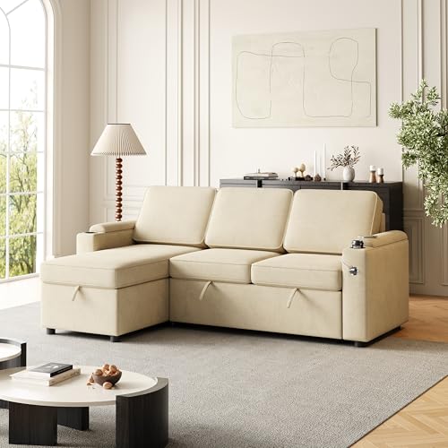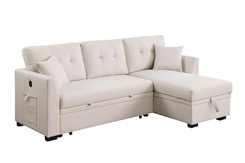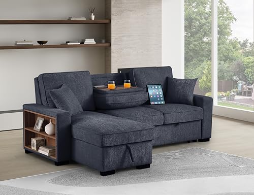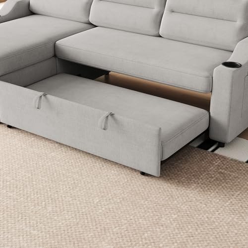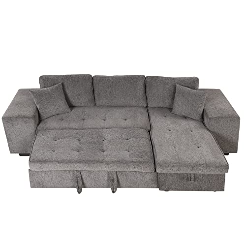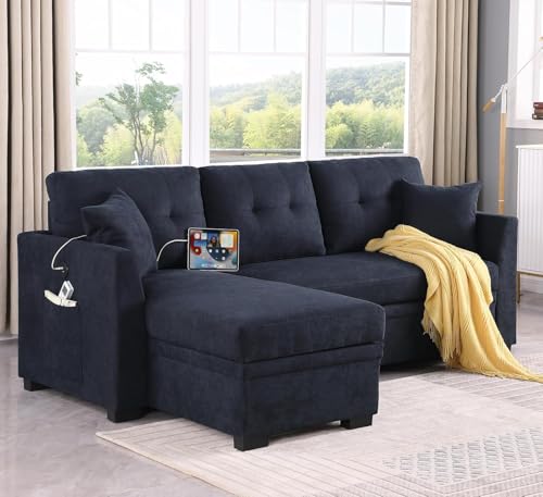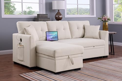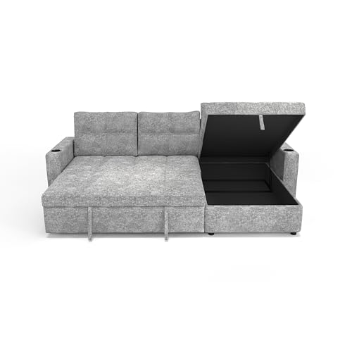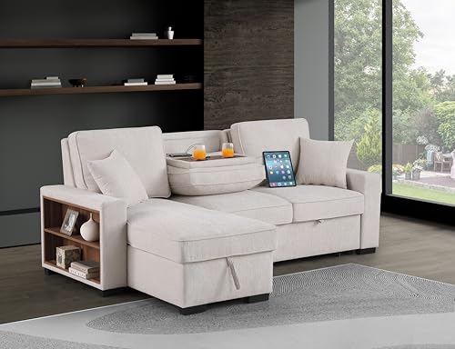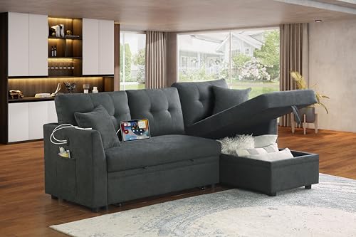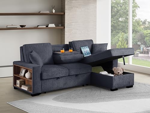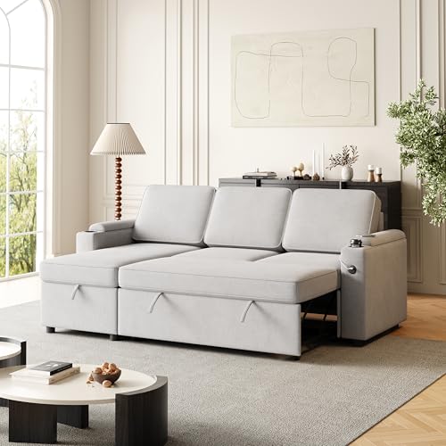 86 INCH Reversible Sleeper Sectional Sofa with Pull Out Couch Bed , Convertible L Shaped Corner Sofa ,Chenille Upholstered Pullout Lounge Sofabed with Chaise ,Cupholders, USB Charging for Living Room