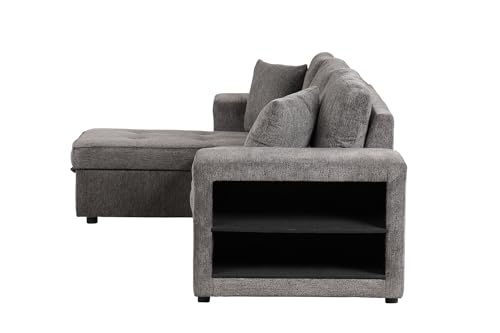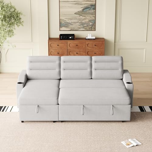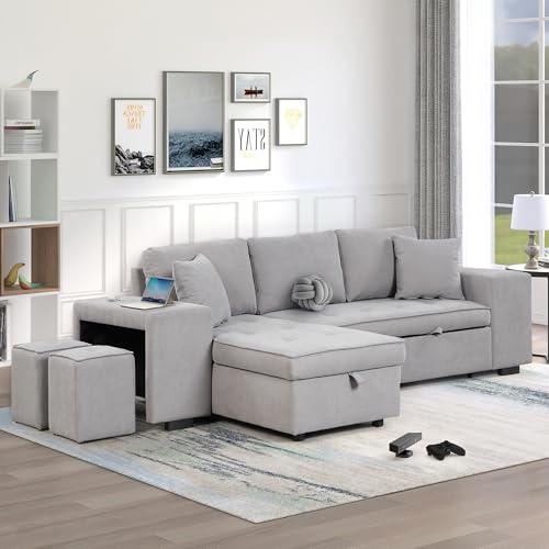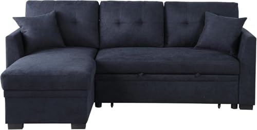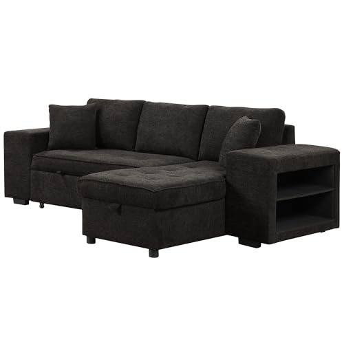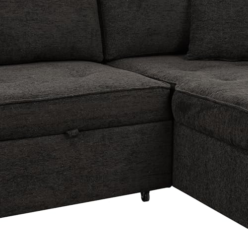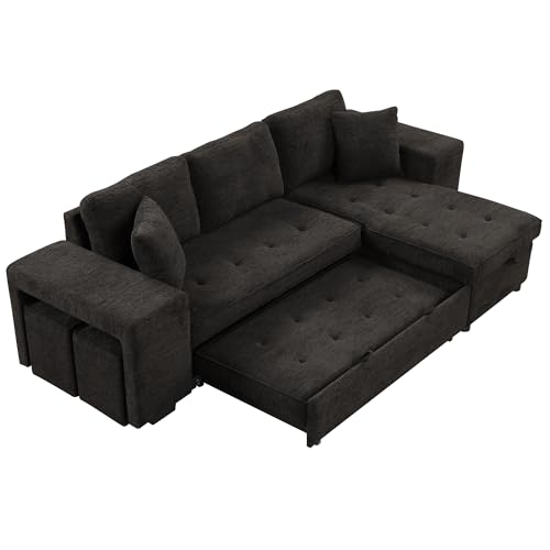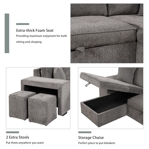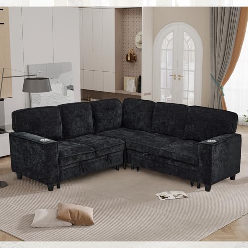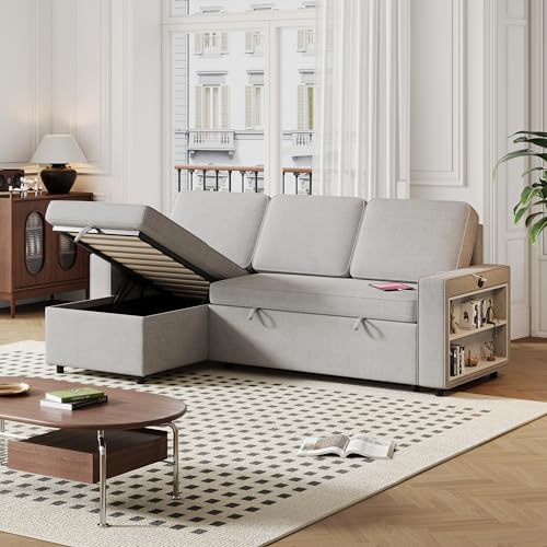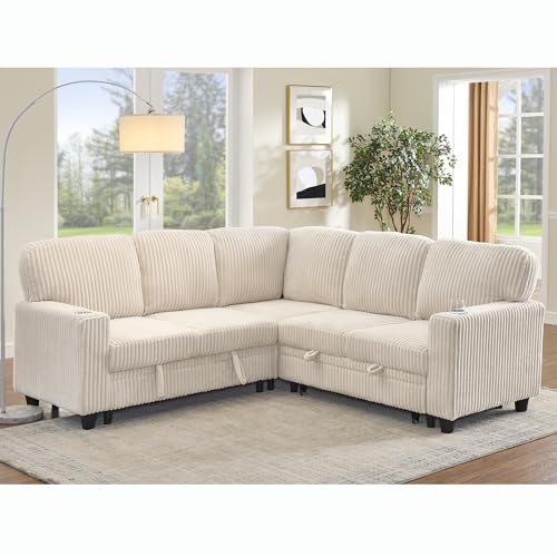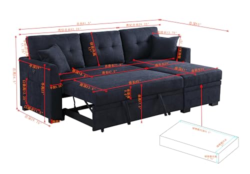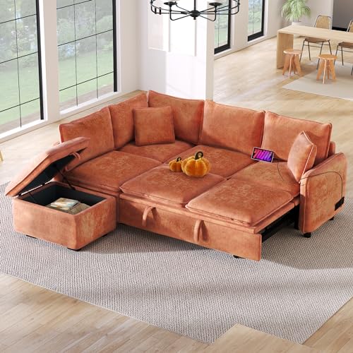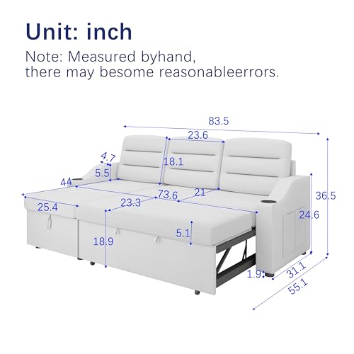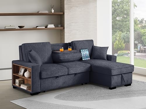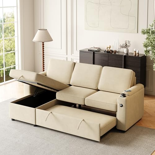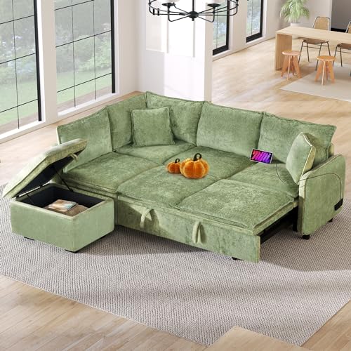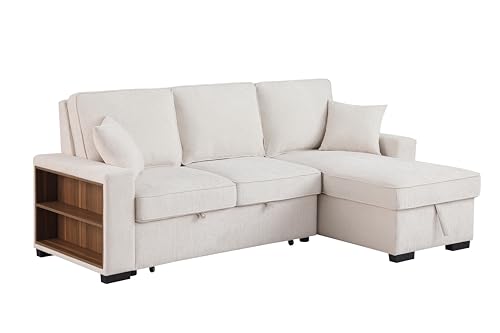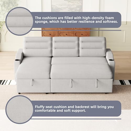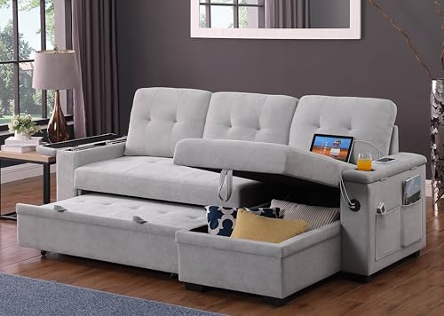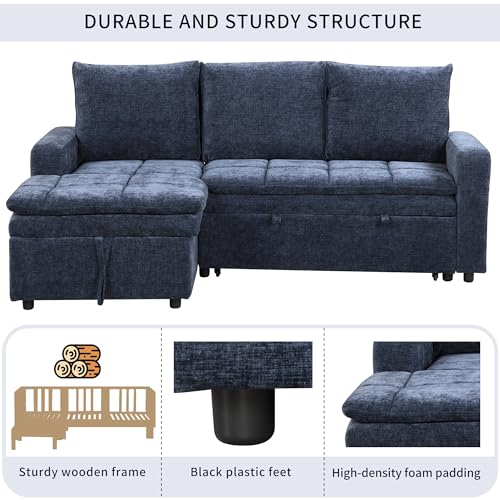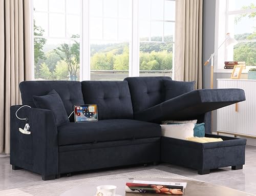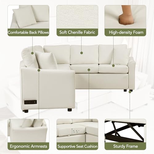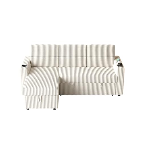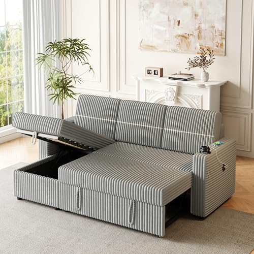 86 INCH Reversible Sleeper Sectional Sofa with Pull Out Couch Bed , Convertible L Shaped Corner Sofa ,Chenille Upholstered Pullout Lounge Sofabed with Chaise ,Cupholders, USB Charging for Living Room