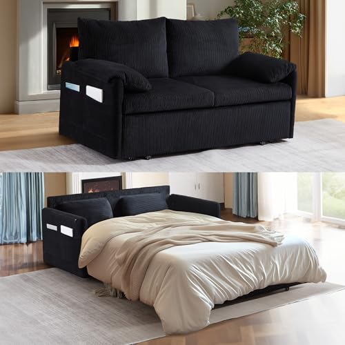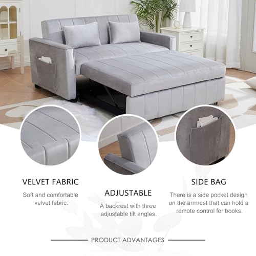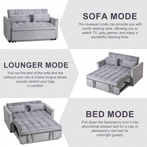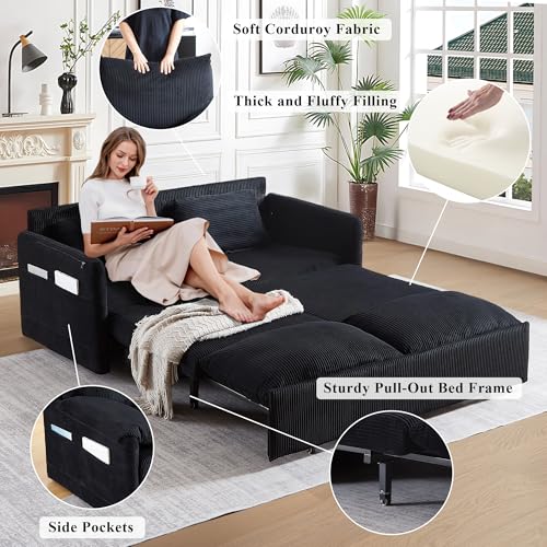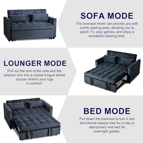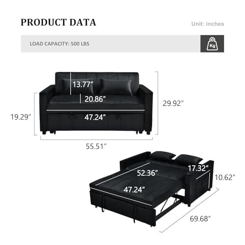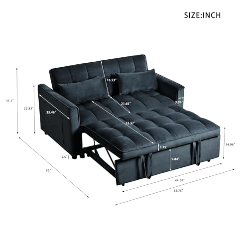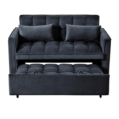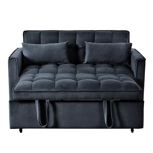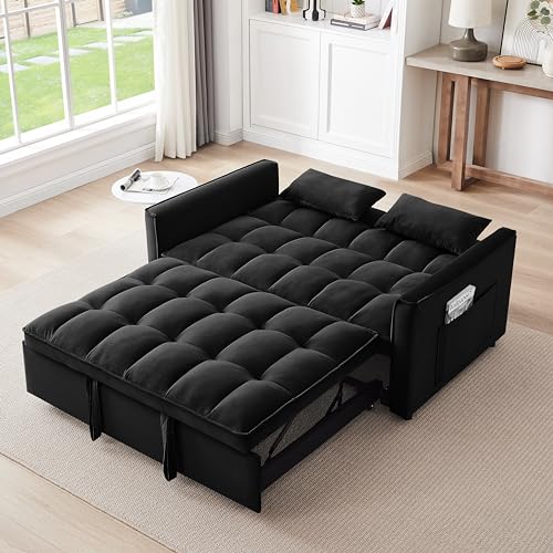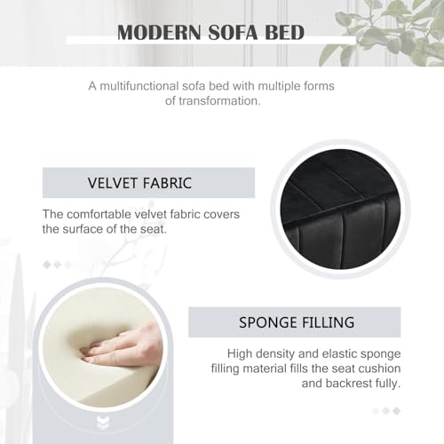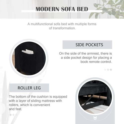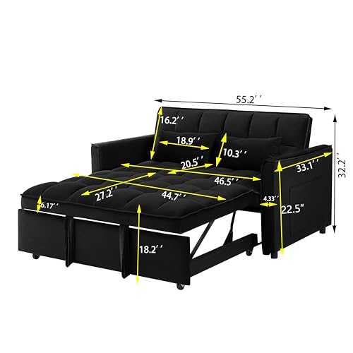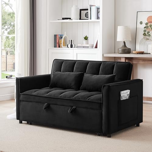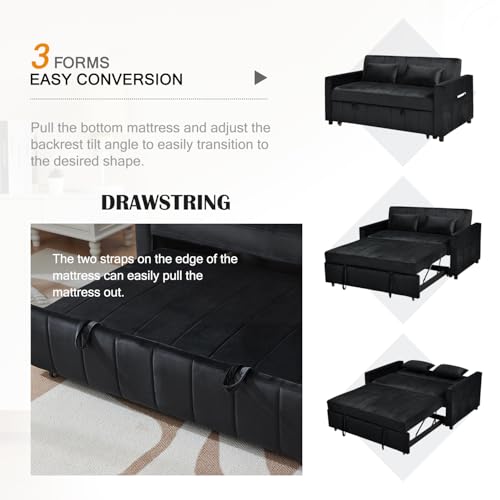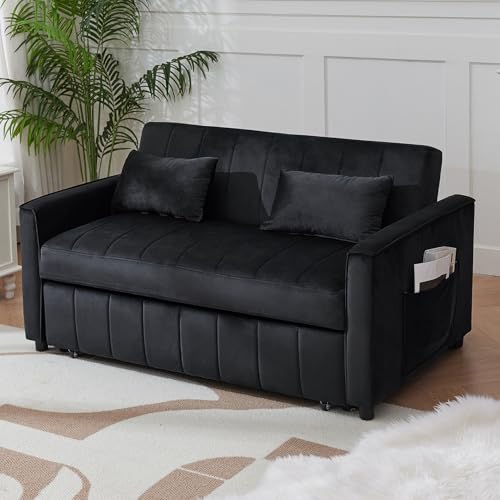 Convertible Sleeper Sofa Bed, 55.51" Modern Velvet 3-in-1 Futon Couch, Pullout Bed with Adjustable Backrest, Storage Pockets and Toss Pillows for Living Room, Bedroom (Black)