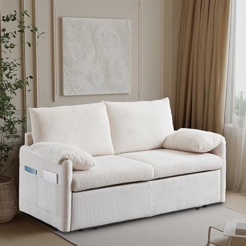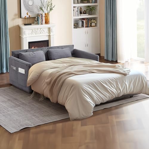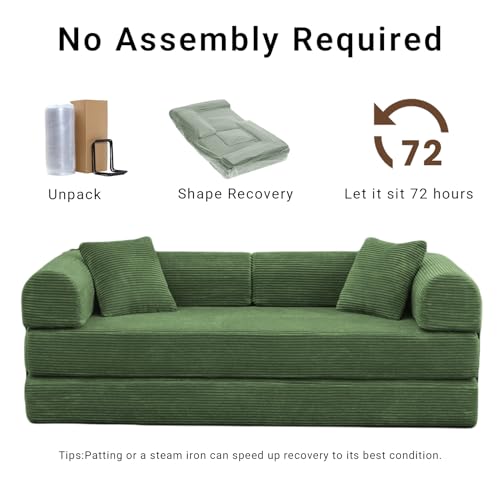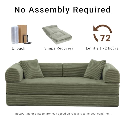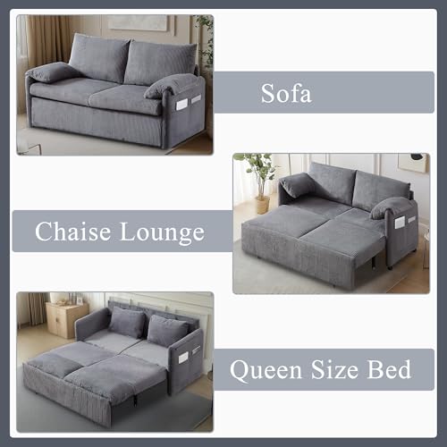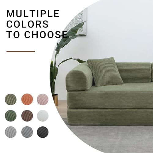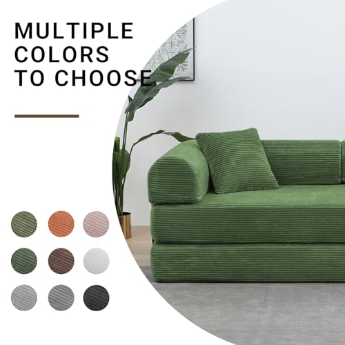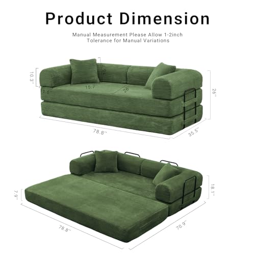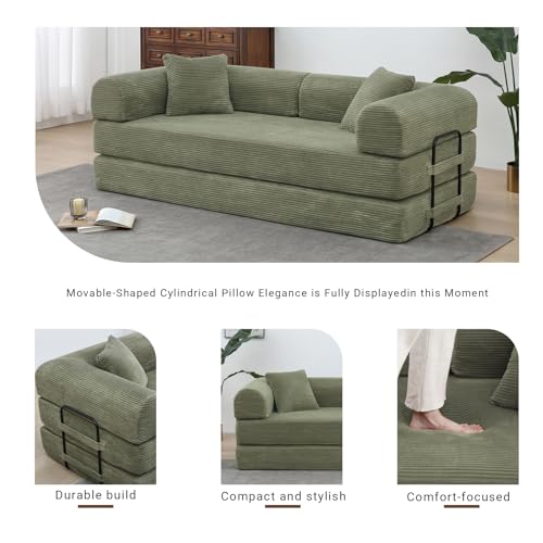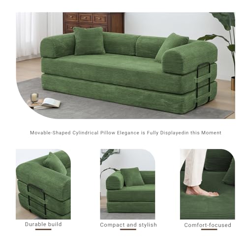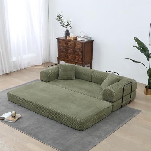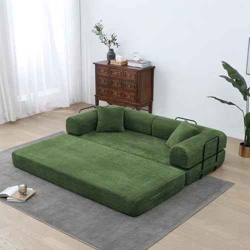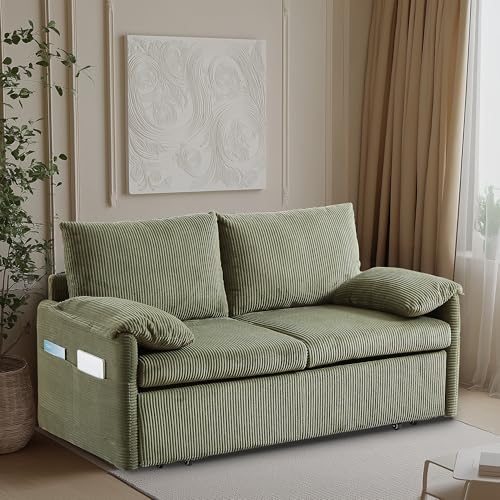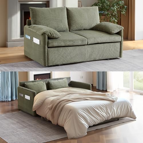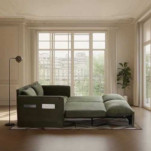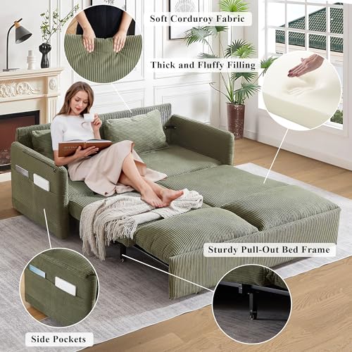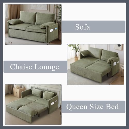 Queen Size Pull Out Couch Sleeper Sofa Bed, 3-in-1 Convertible Futon Couch for Living Room with Storage Pockets & Arm Pillows, Modern Corduroy Sofa Bed(Green)