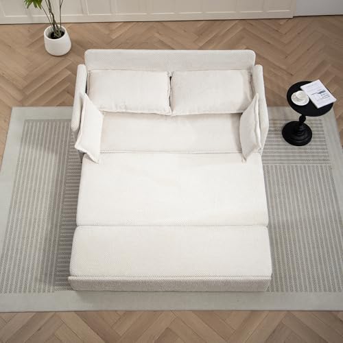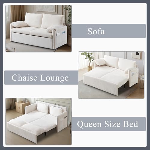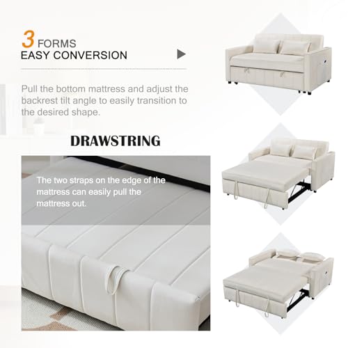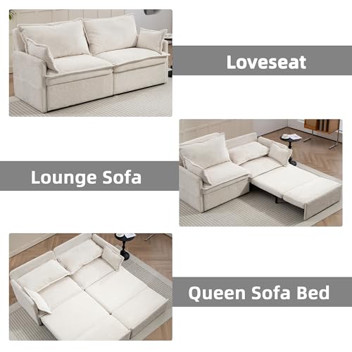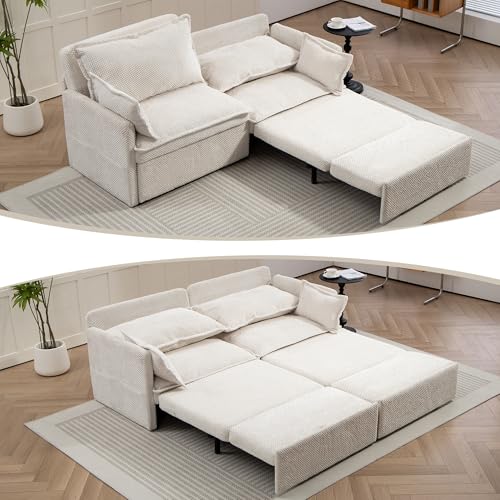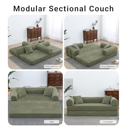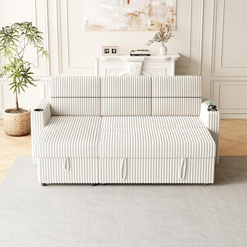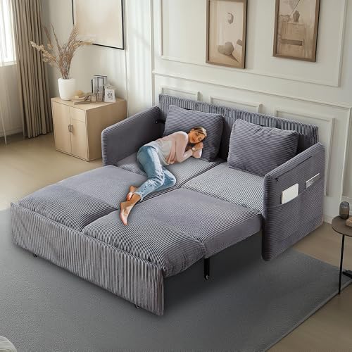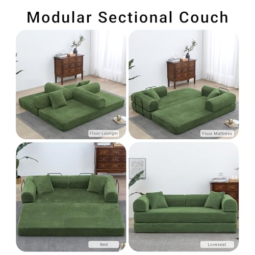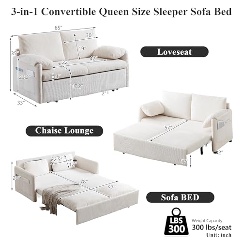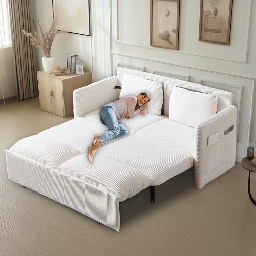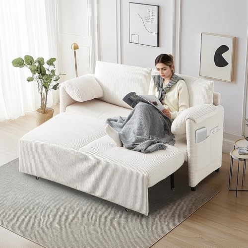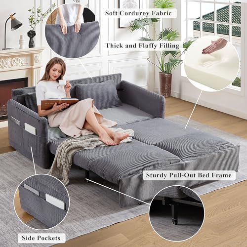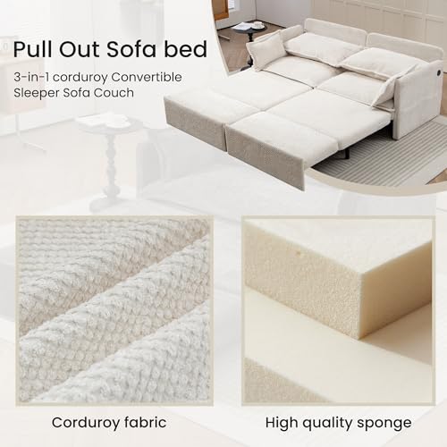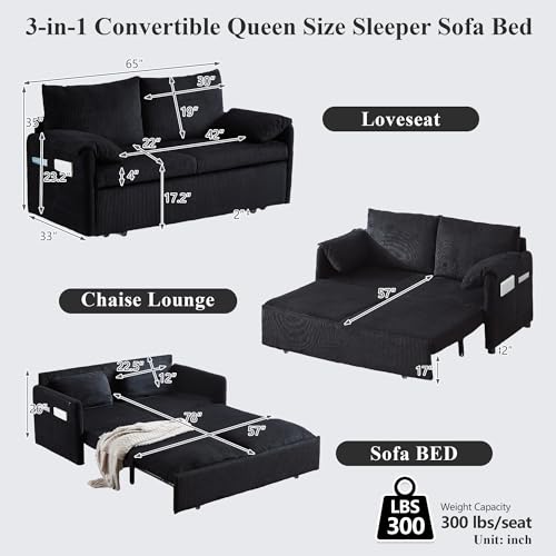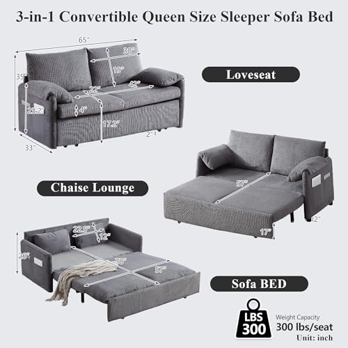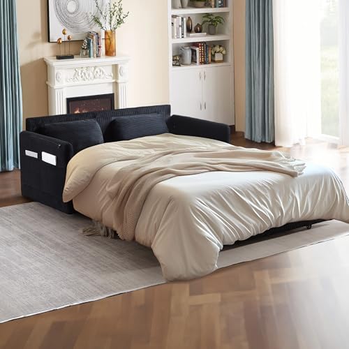 Queen Size Pull Out Couch Sleeper Sofa Bed, 3-in-1 Convertible Futon Couch for Living Room with Storage Pockets & Arm Pillows, Modern Corduroy Sofa Bed(Green)