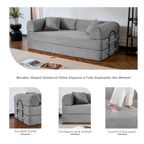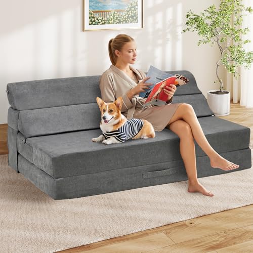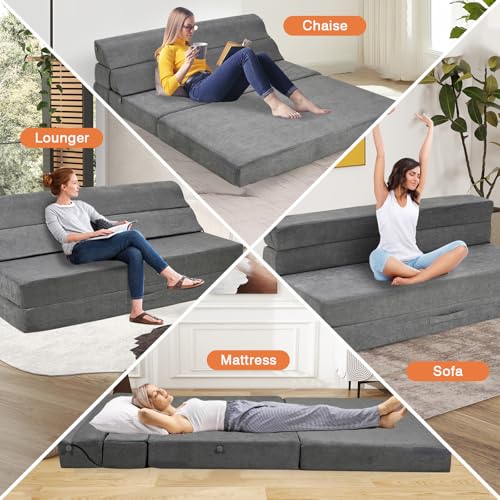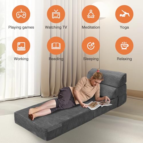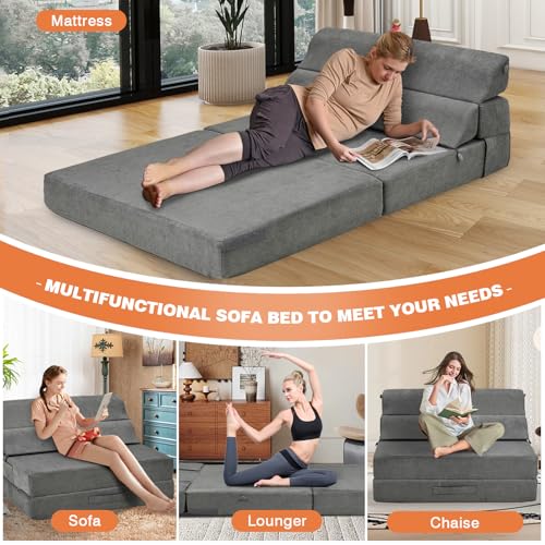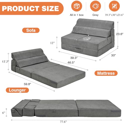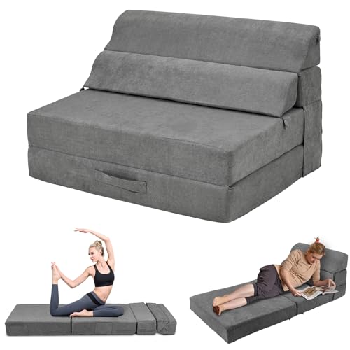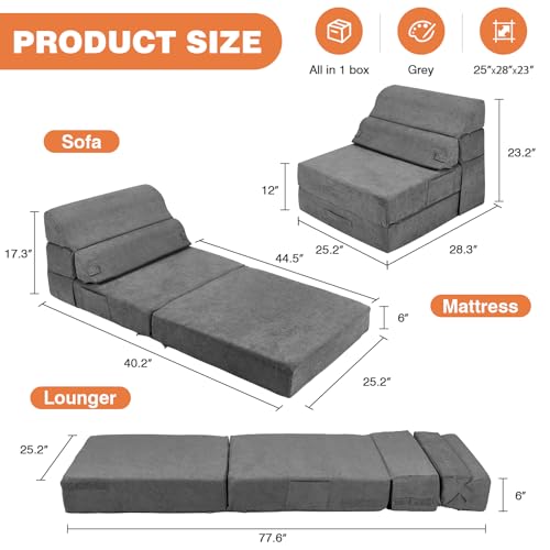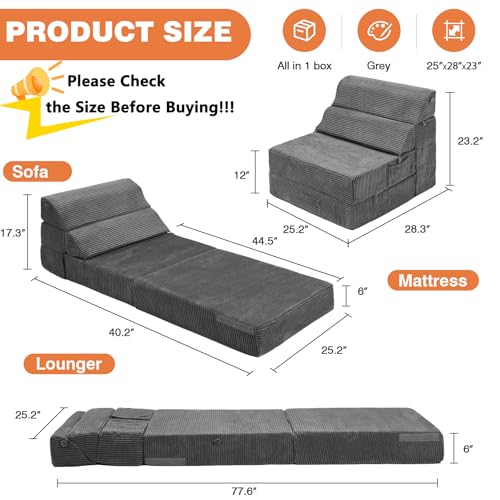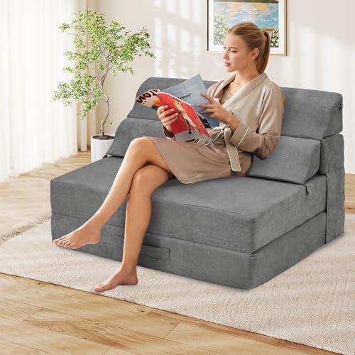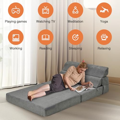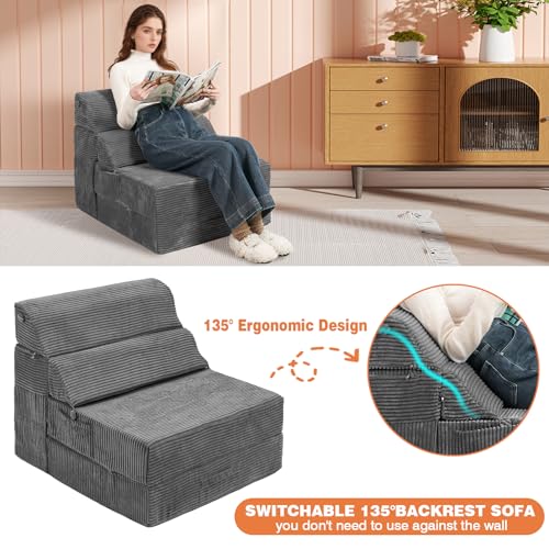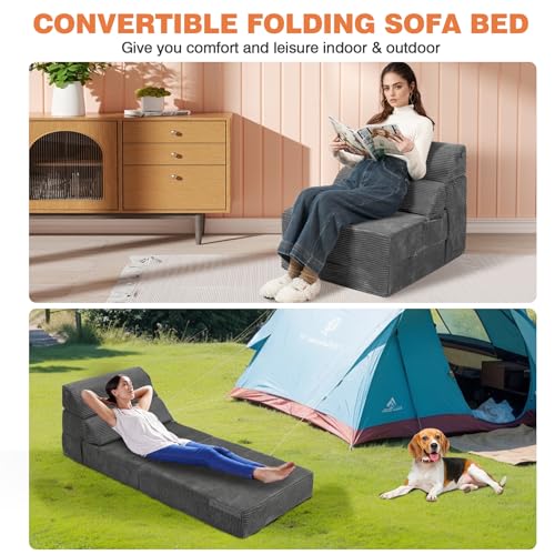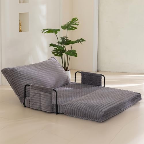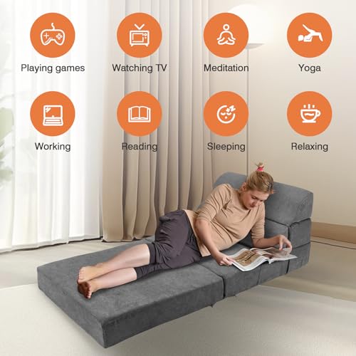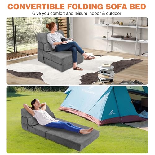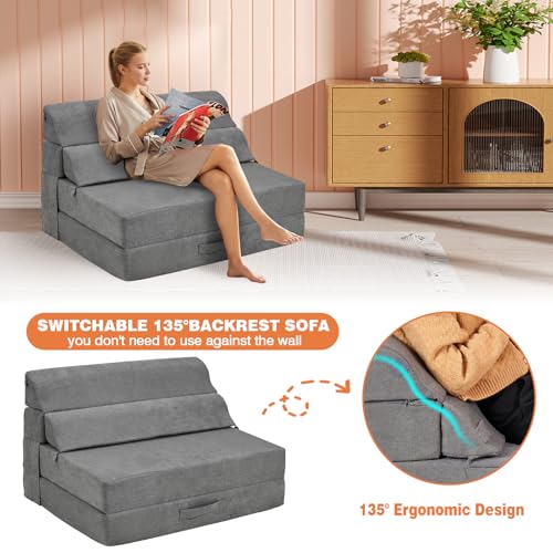Comfy Folding Sofa Bed - Grey Convertible Sleeper Sofa Fold Out Sleeper Chair Couch for Living Room Bedroom Guest, Foldable Floor Chair Lounger Mattress with Back Support for Travel, Camping