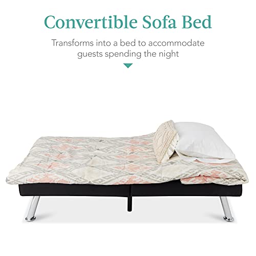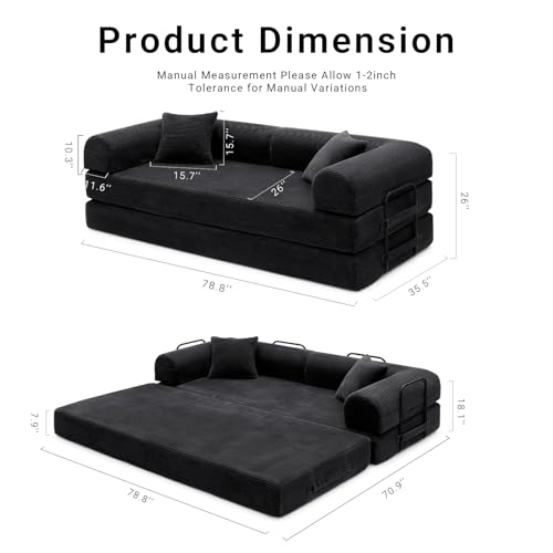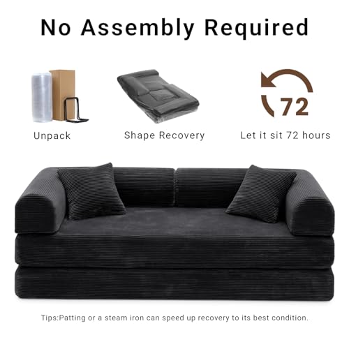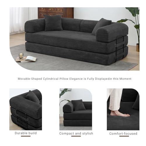 Convertible Sleeper Sofa Bed with Cylindrical Pillow, Comfy Foldable Sofa Bed Compressed Sofa in Box, Floor Sofa Lounge Couch for Living Room Bedroom Lounge Studio, Tool-Free Assembly (Black)