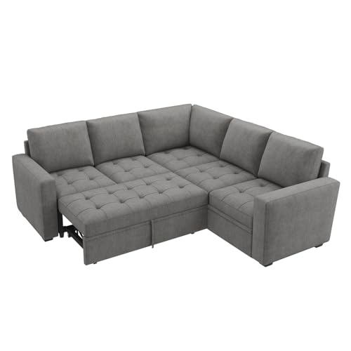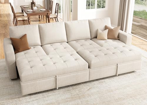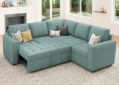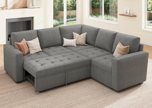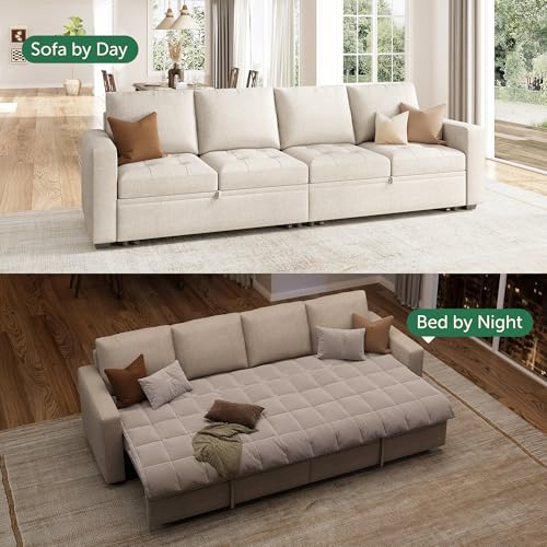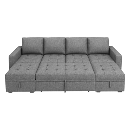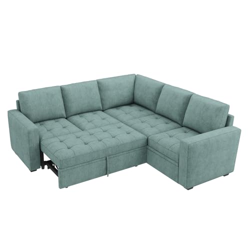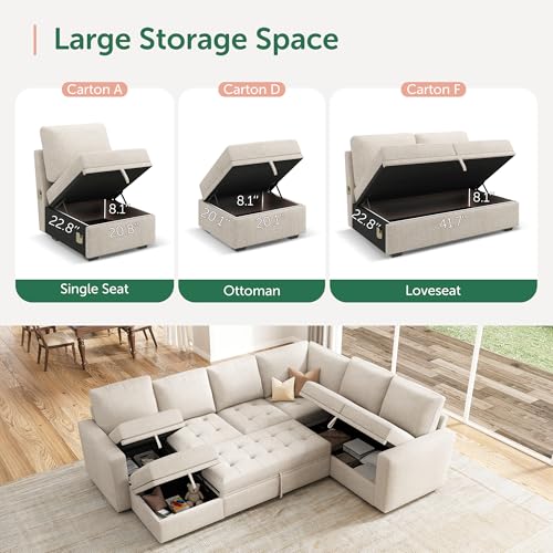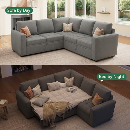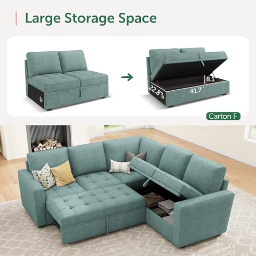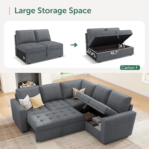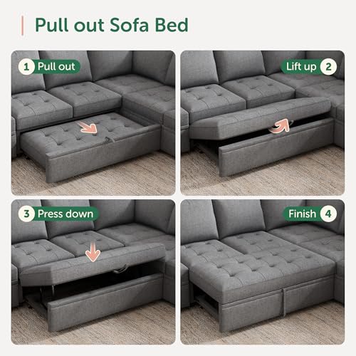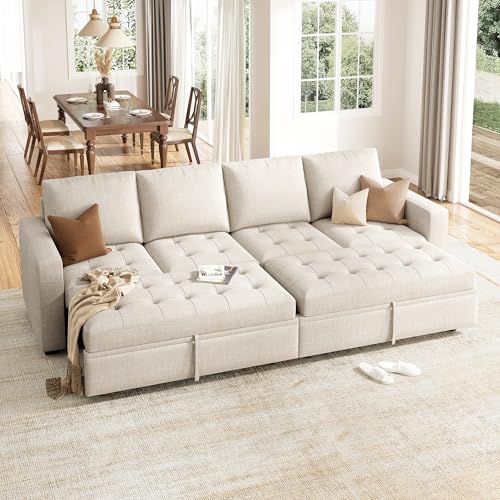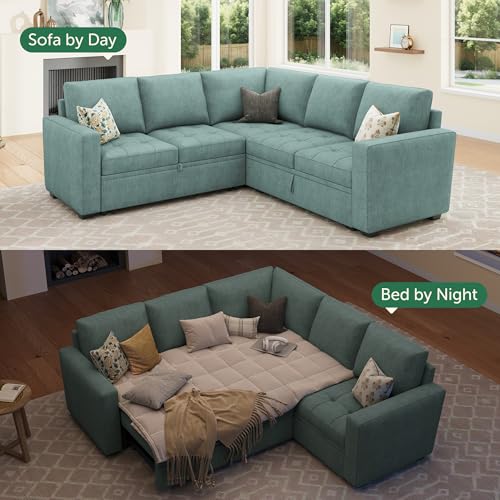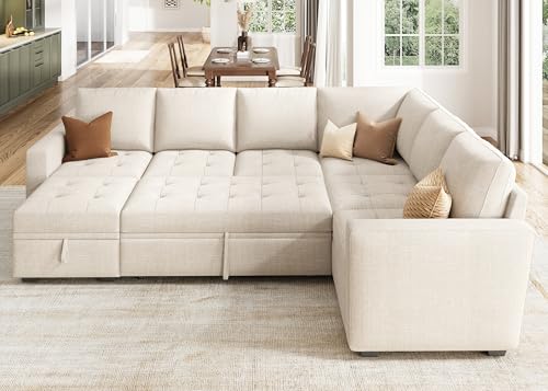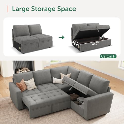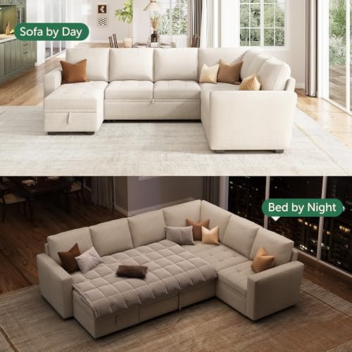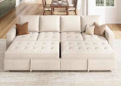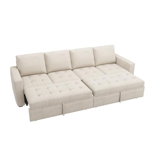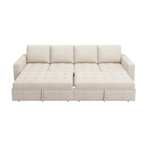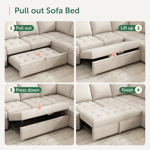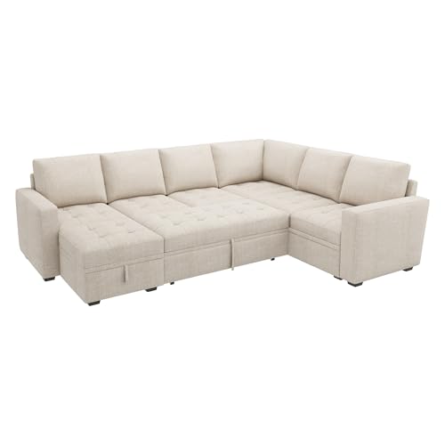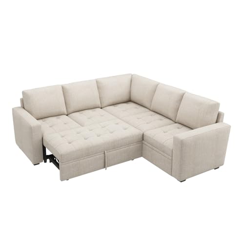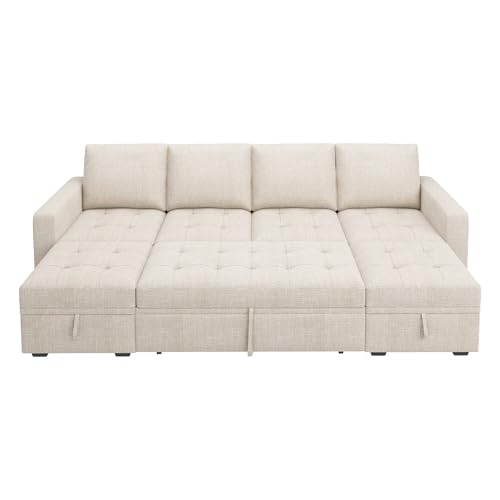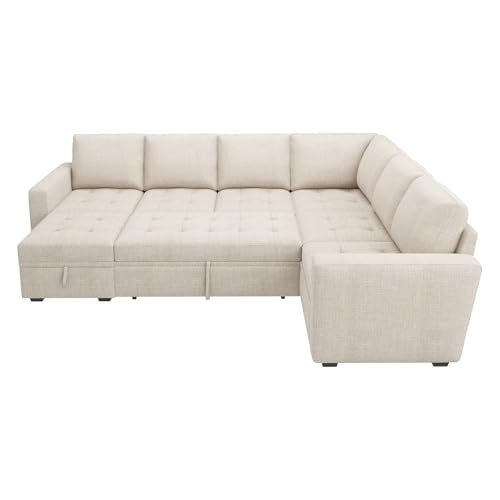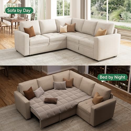 HONBAY Sectional Sleeper Sofa Couch with Pull Out Bed, Convertible L Shaped Couch with Storage, Sleeper Sectional Sofa Bed for Living Room, Beige