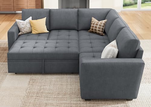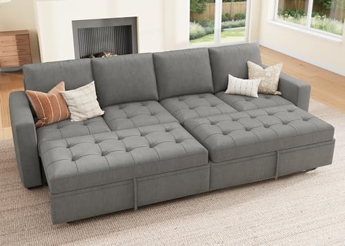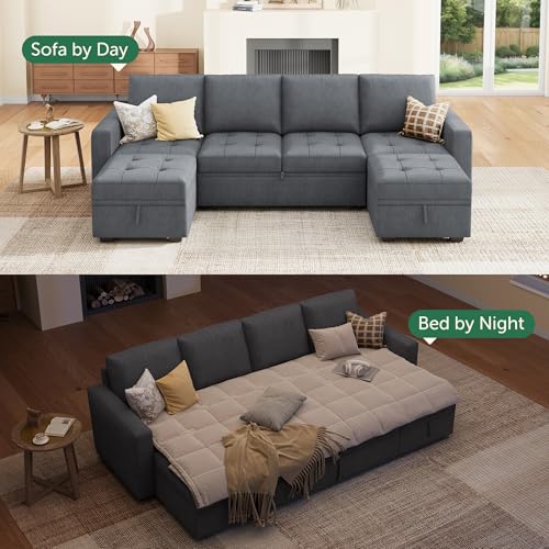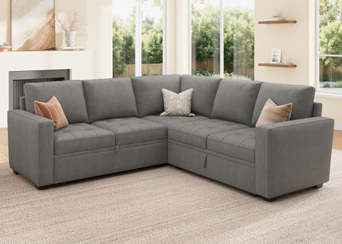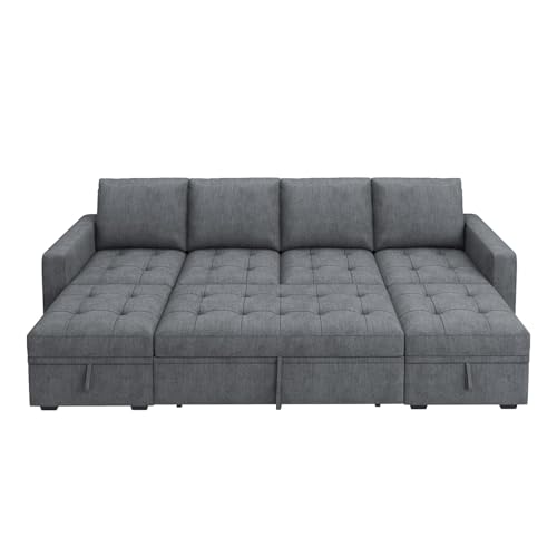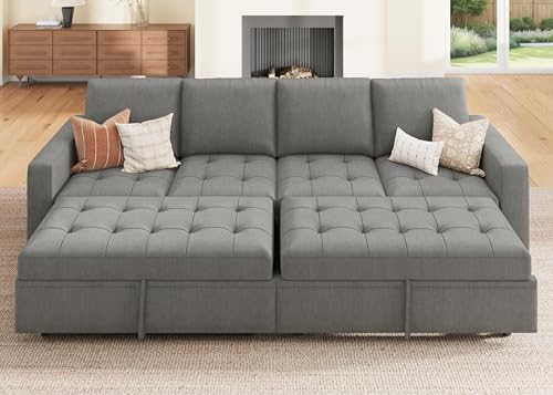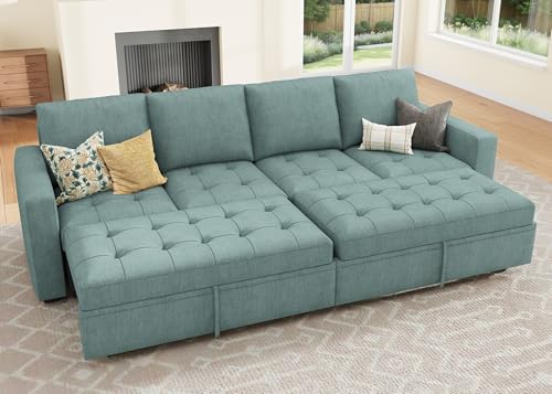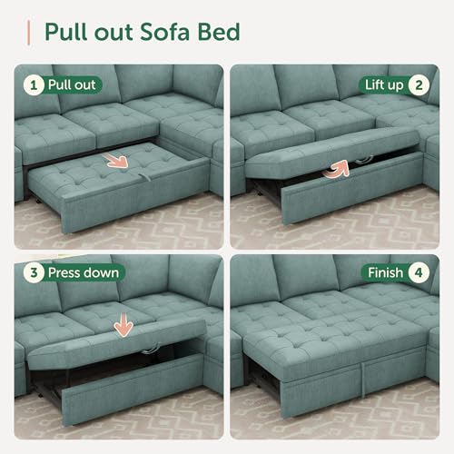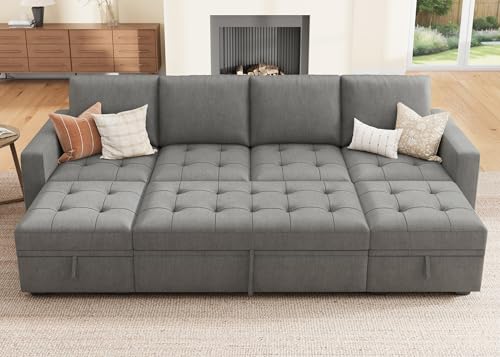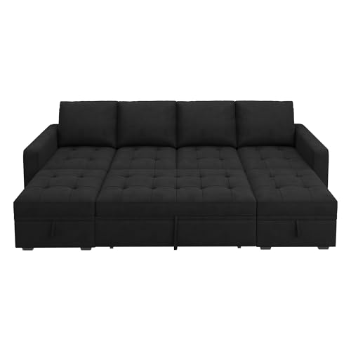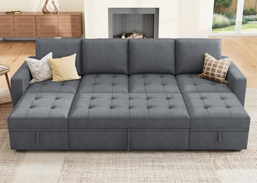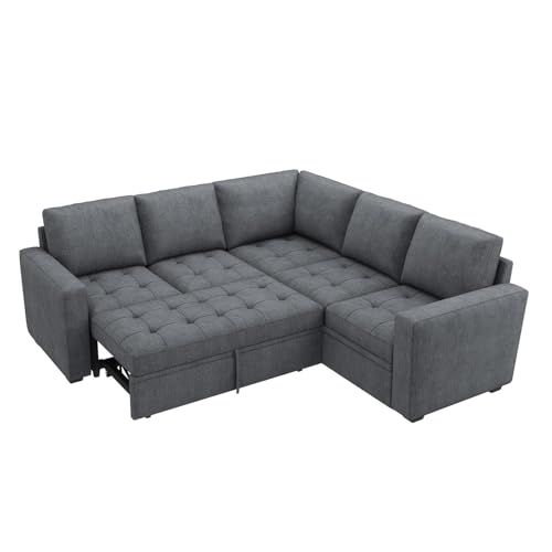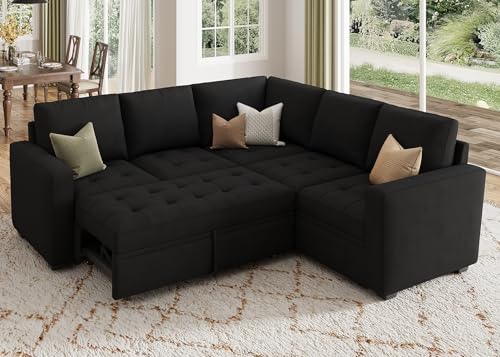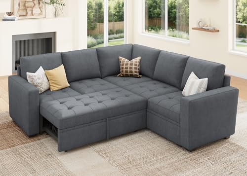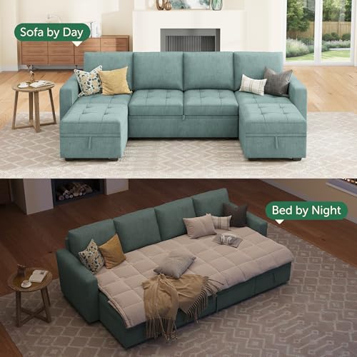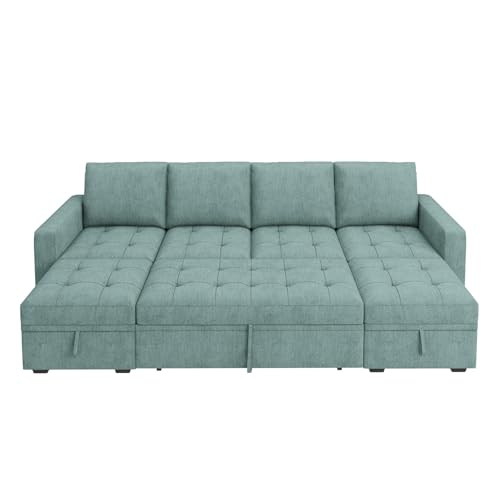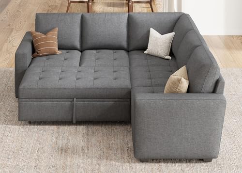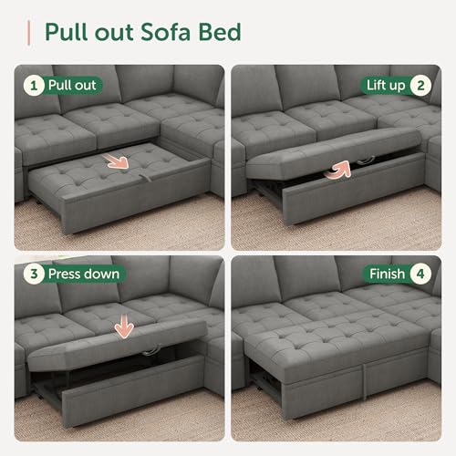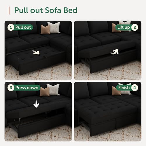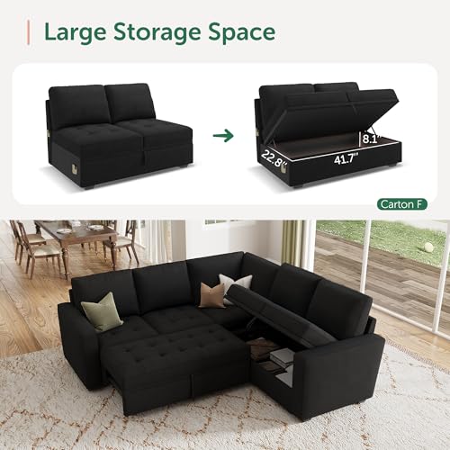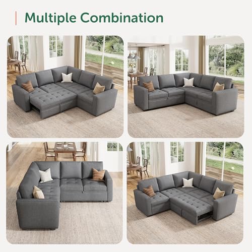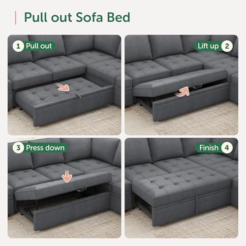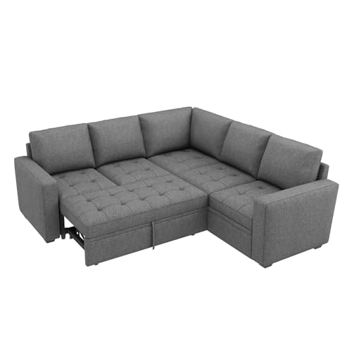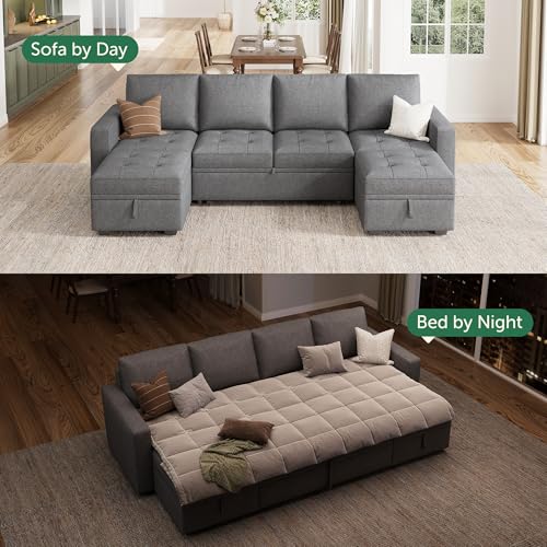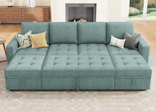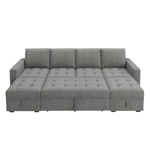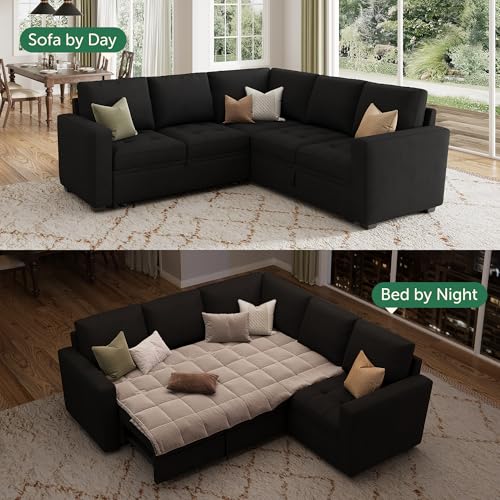 HONBAY Sectional Sleeper Sofa Couch with Pull Out Bed, Convertible L Shaped Couch with Storage, Sleeper Sectional Sofa Bed for Living Room, Beige