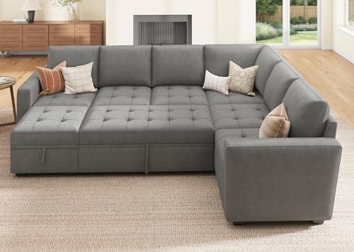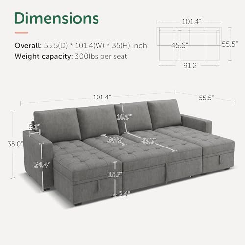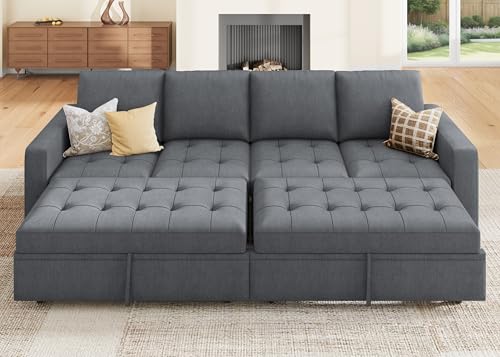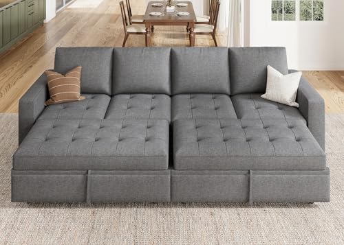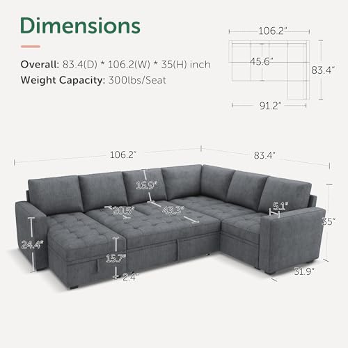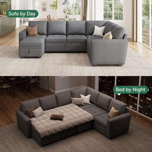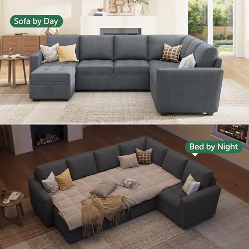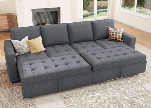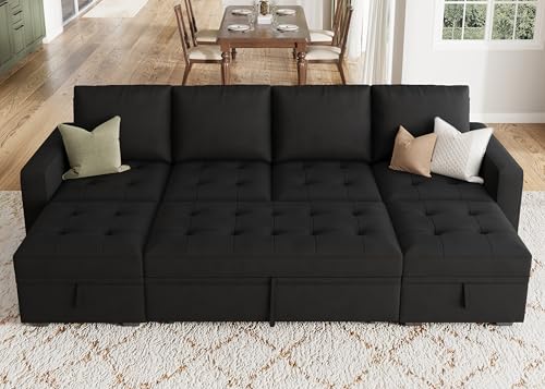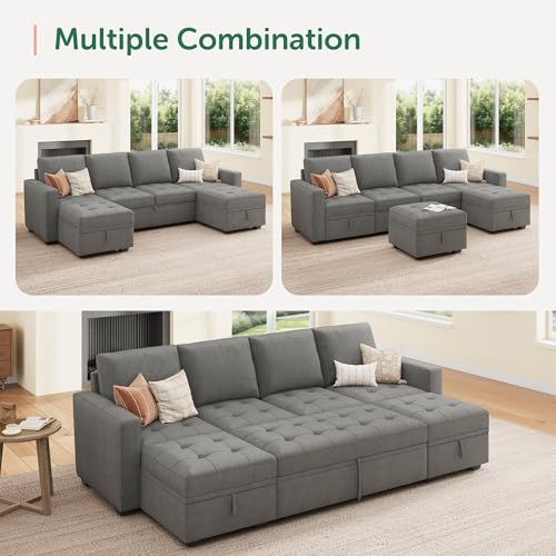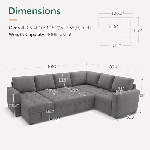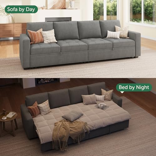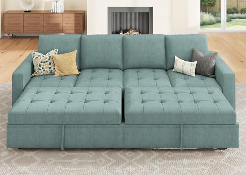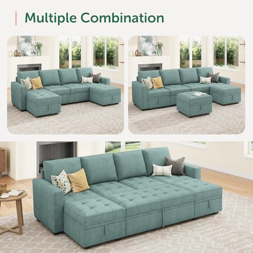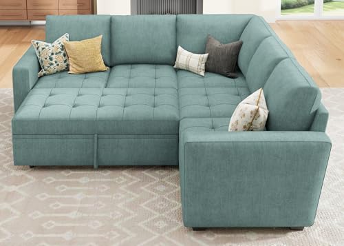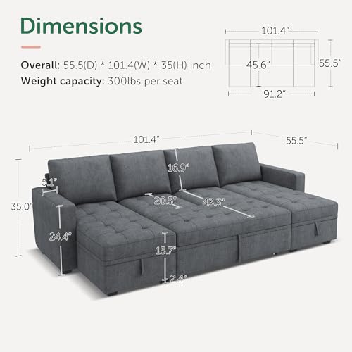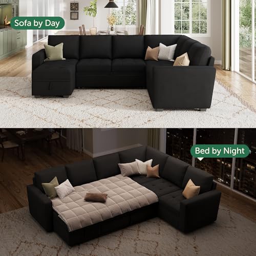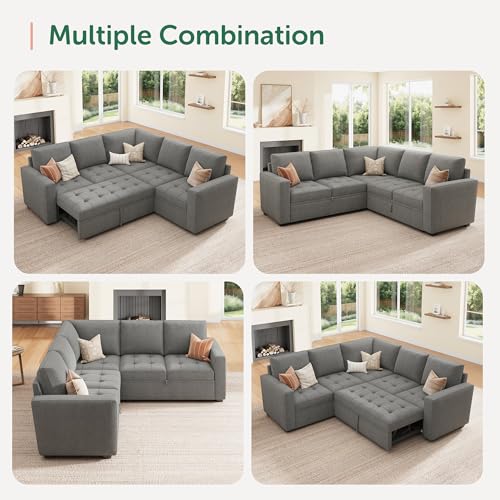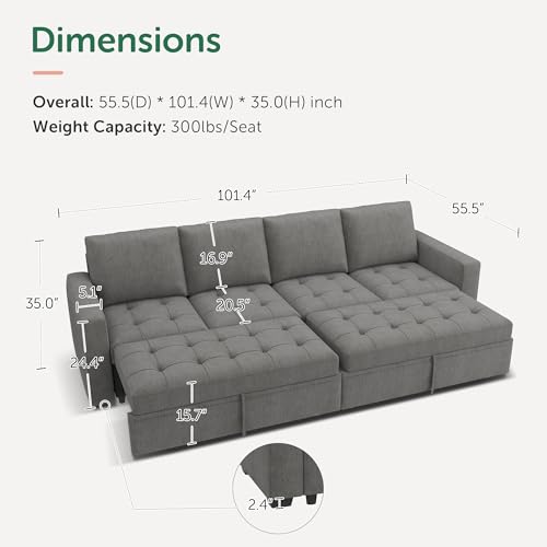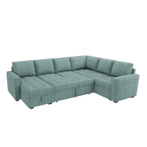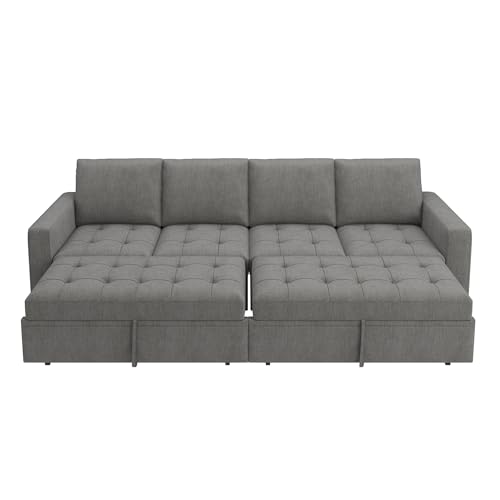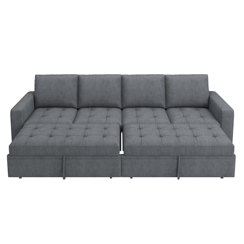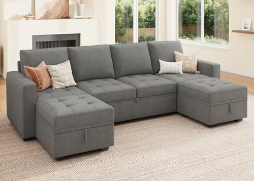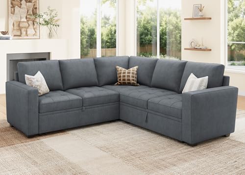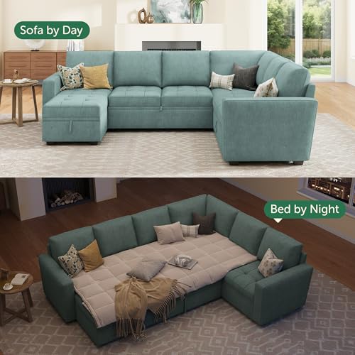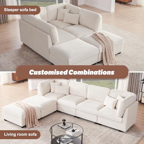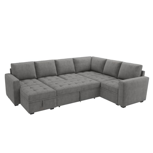 HONBAY Sectional Sleeper Sofa Couch with Pull Out Bed, Convertible L Shaped Couch with Storage, Sleeper Sectional Sofa Bed for Living Room, Beige