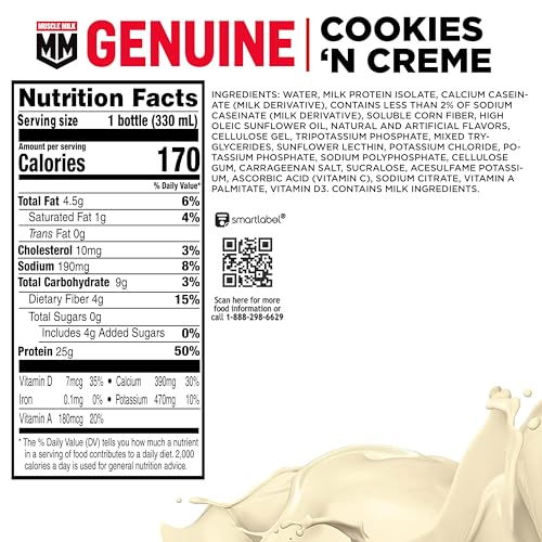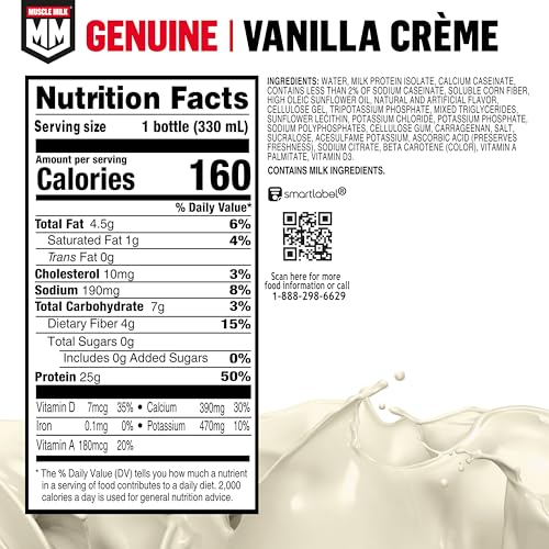 Muscle Milk Genuine Protein Shake, Vanilla Creme, 11.16 Fl Oz Bottle, 12 Pack, 25g Protein, Zero Sugar, Calcium, Vitamins A, C & D, 5g Fiber, Energizing Snack, Workout Recovery, Packaging May Vary