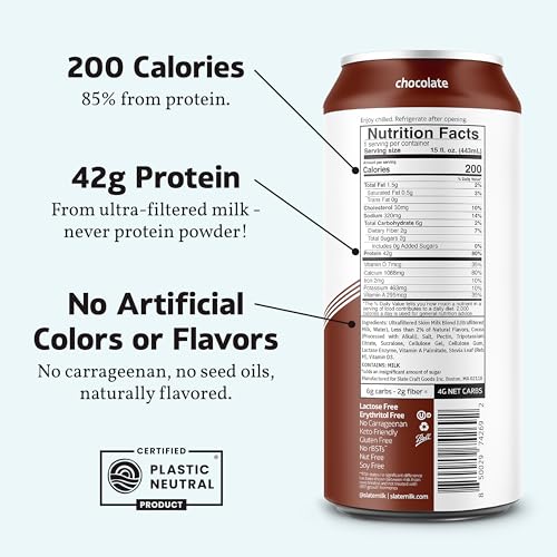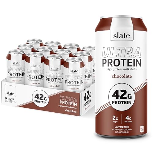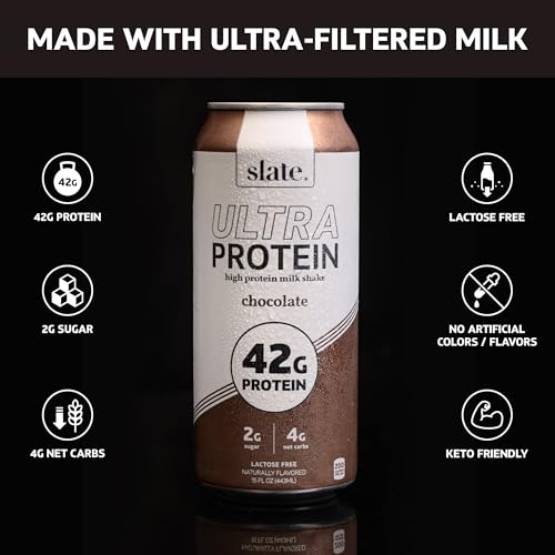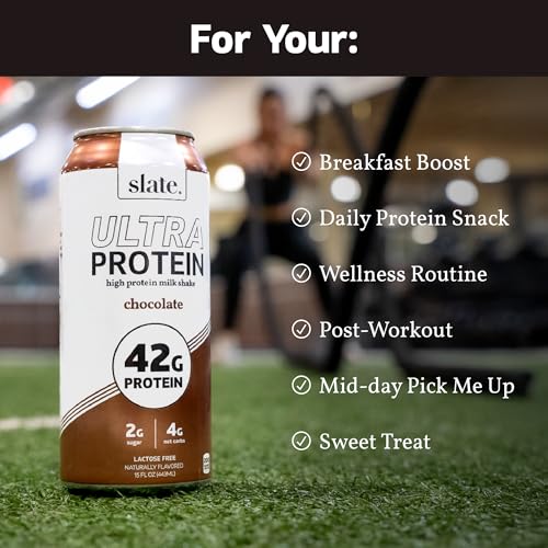 Slate Milk - Ultra High Protein Shake - Chocolate - 42g Protein, 2g Sugar, 200 Calories, 4g Net Carbs - Lactose Free - No Added Sugar, No Seed Oils - Breakfast Boost, Post Workout - 15 fl oz, 12 Cans