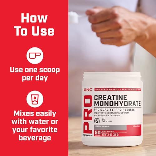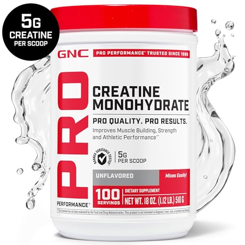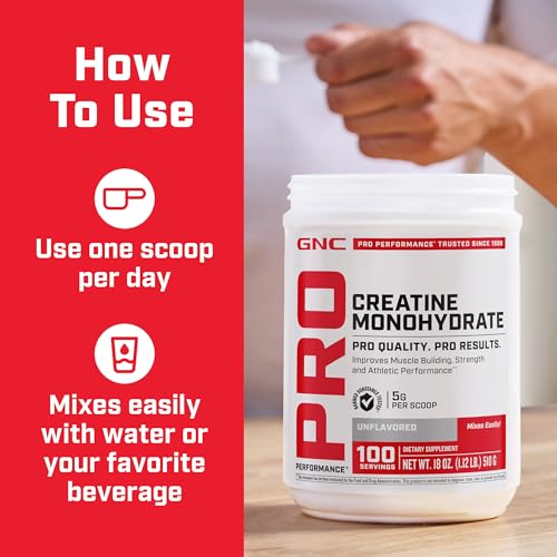 GNC Pro Performance Creatine Monohydrate Powder for Women & Men, 5g Creatine Per Serving, Muscle Building, Energy Production, Endurance, Performance, 50 Servings