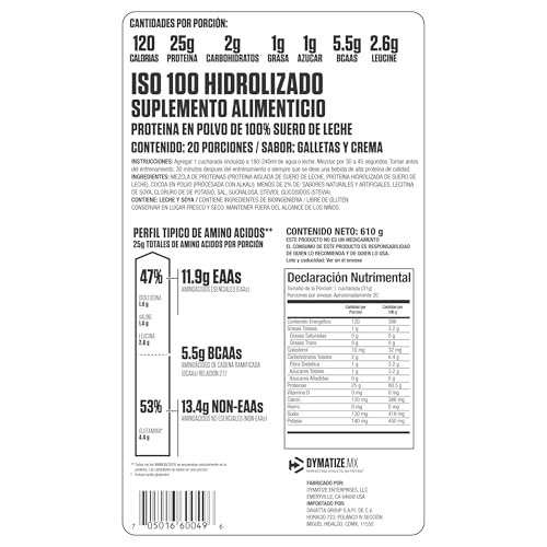 Dymatize ISO100 Whey Protein Powder Isolate, Cookies & Cream, 25g of Protein, 20 Servings, 5.5g BCAAs, Less Than 120 Cal., Gluten Free, 1g Fat, 1g Sugar, 2g Carb