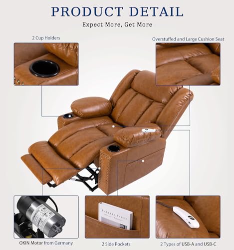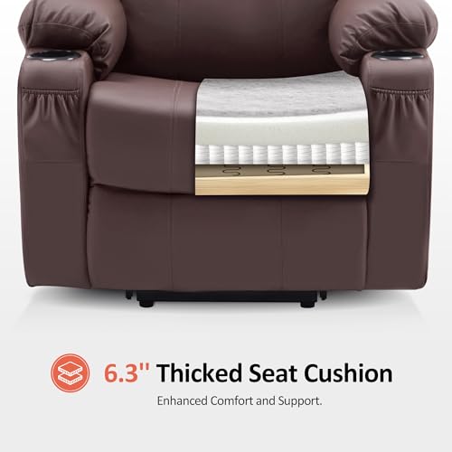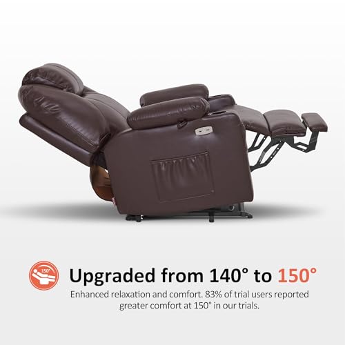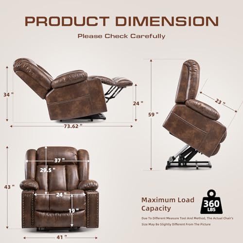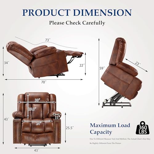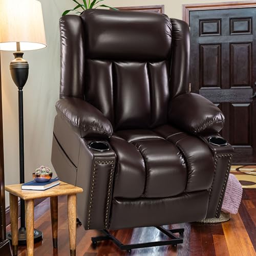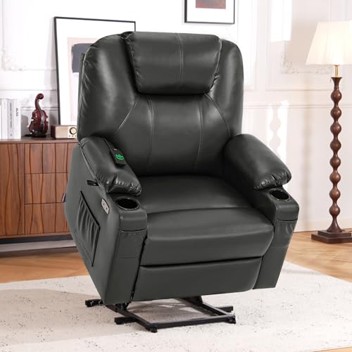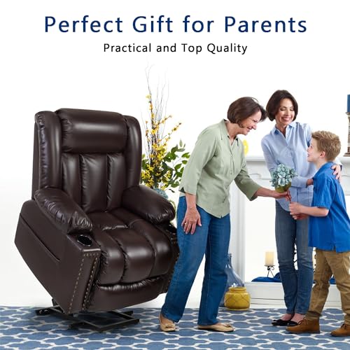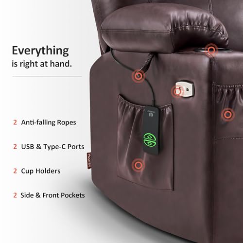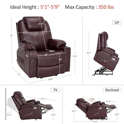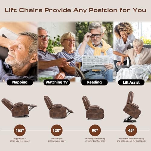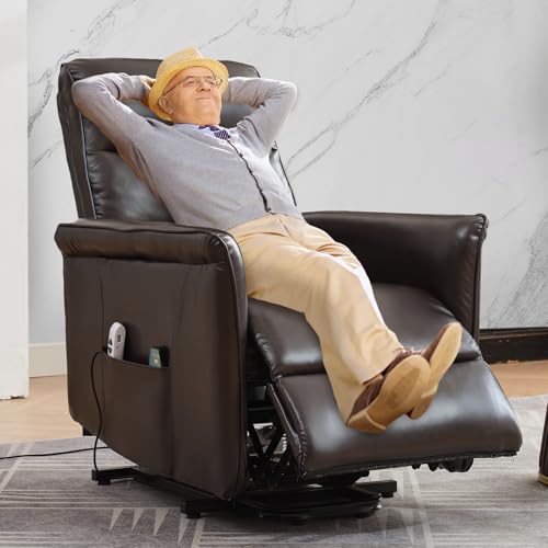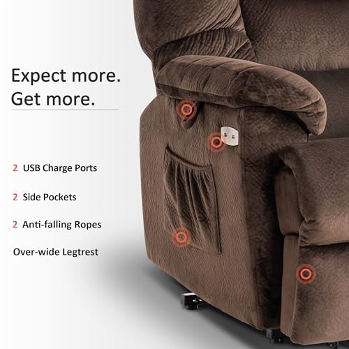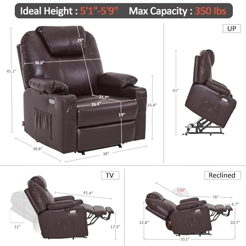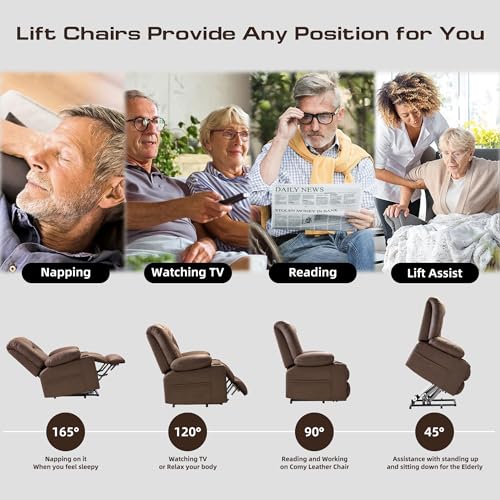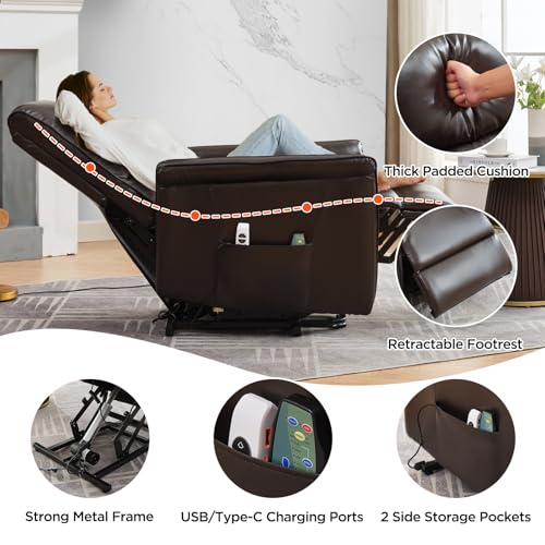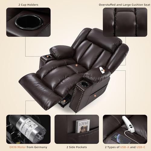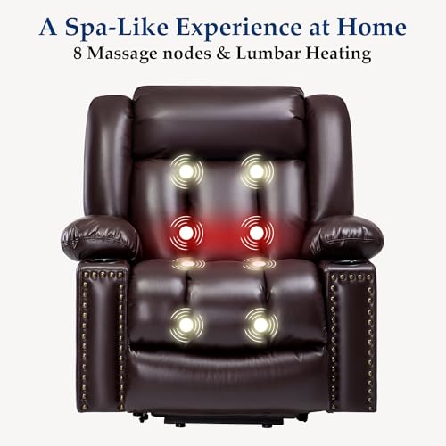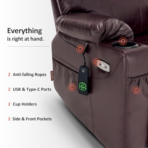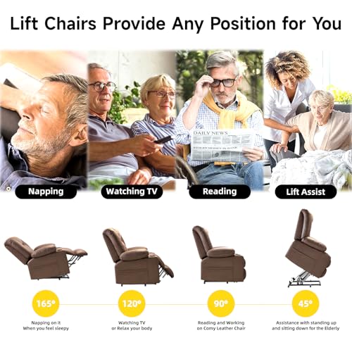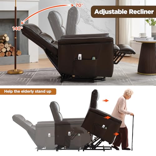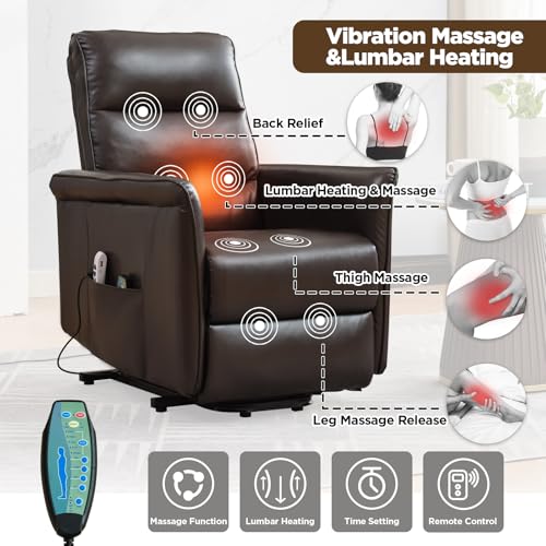 Large Power Lift Chairs Recliners for Elderly with Heated and Massage, Overstuffed Adjustable Lift Chairs, 3 Positions, Breathable Leather, USB-A and USB-C, Cup Holder, Side Pocket Dark Brown