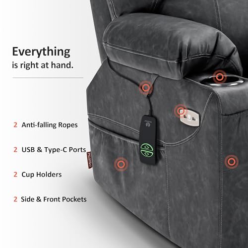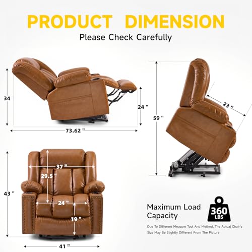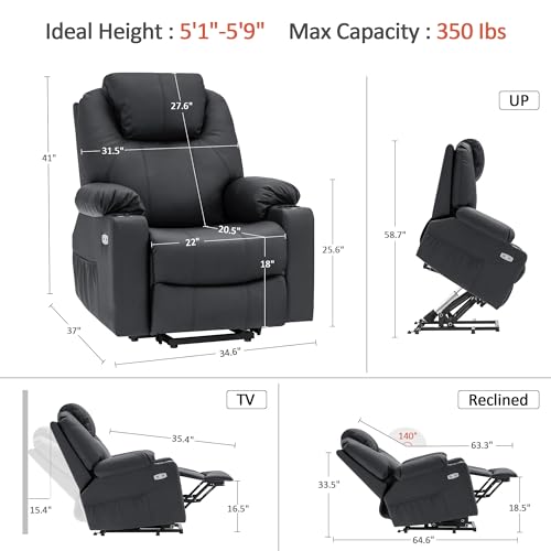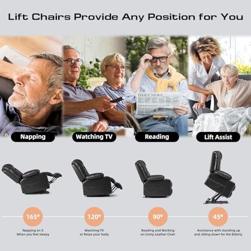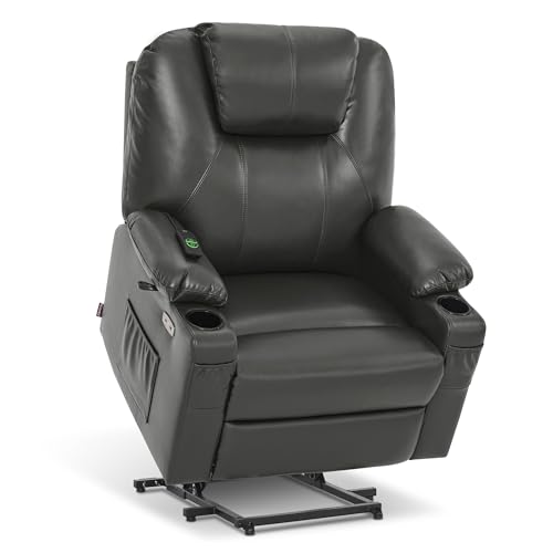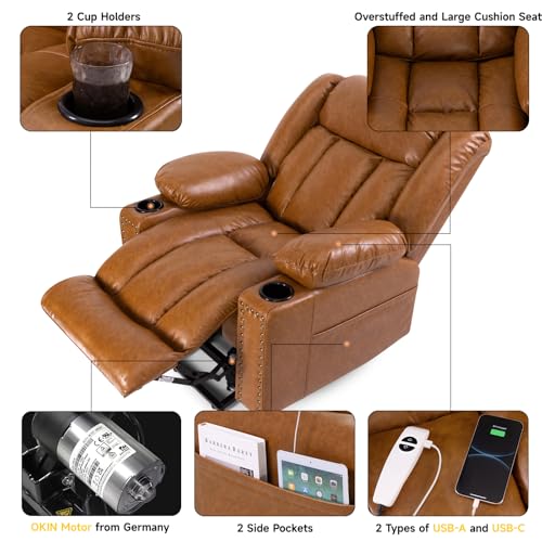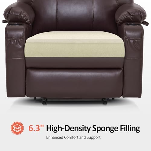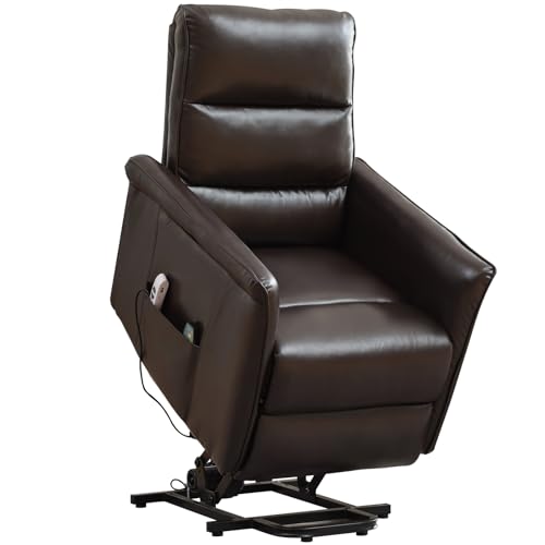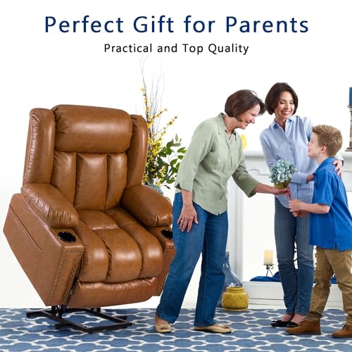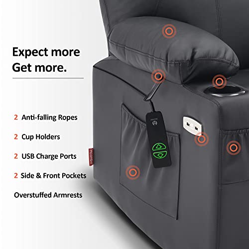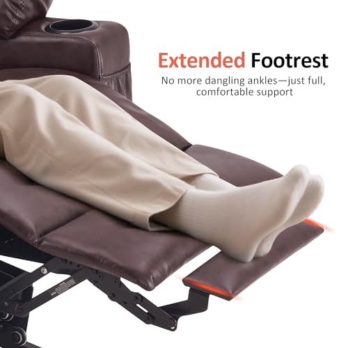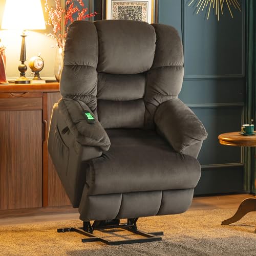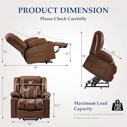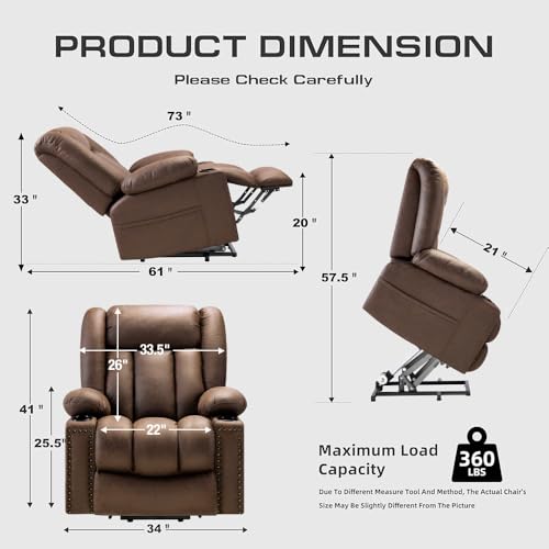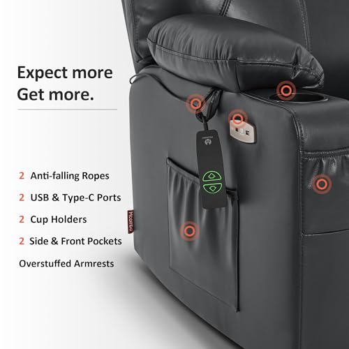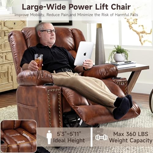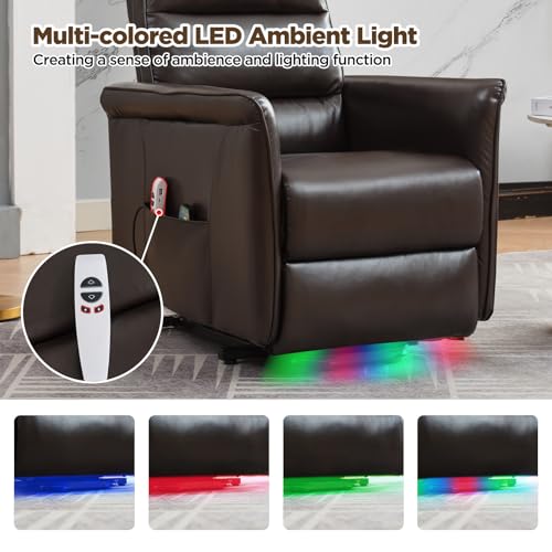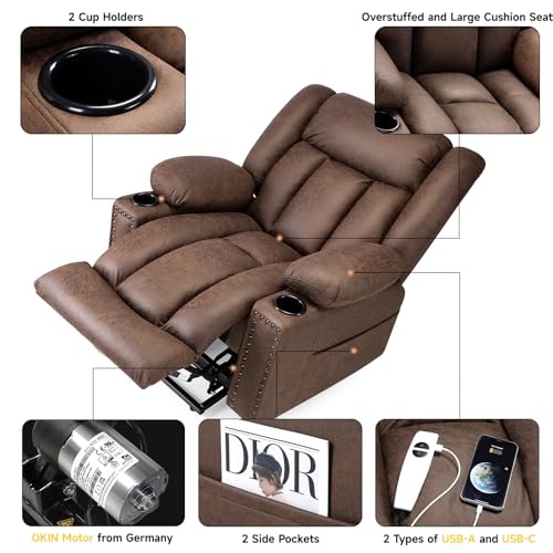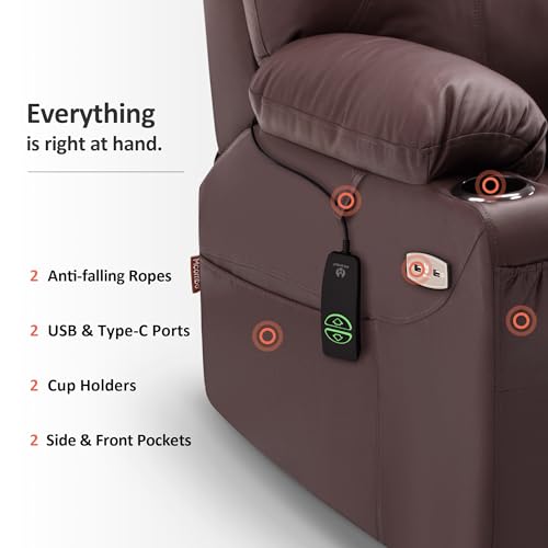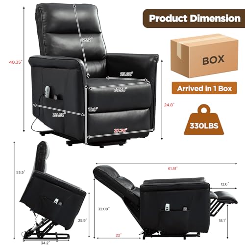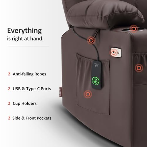 Large Power Lift Chairs Recliners for Elderly with Heated and Massage, Overstuffed Adjustable Lift Chairs, 3 Positions, Breathable Leather, USB-A and USB-C, Cup Holder, Side Pocket Dark Brown