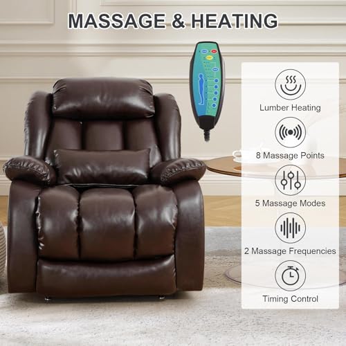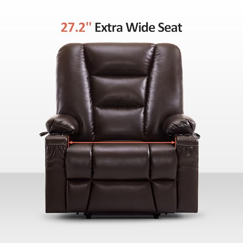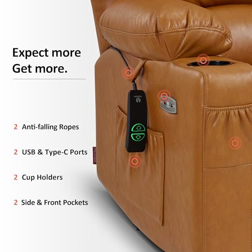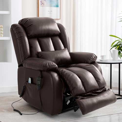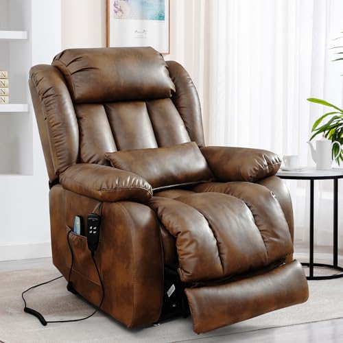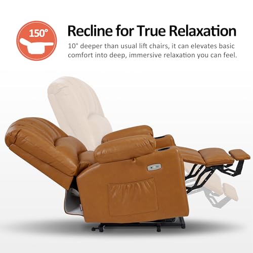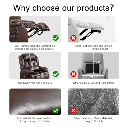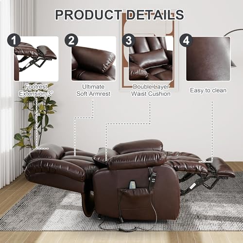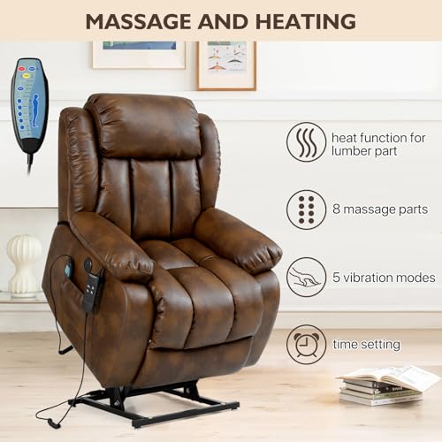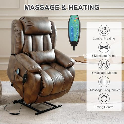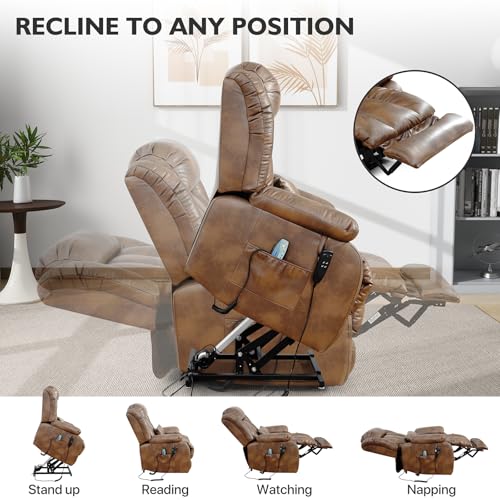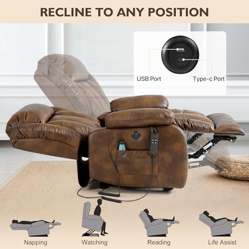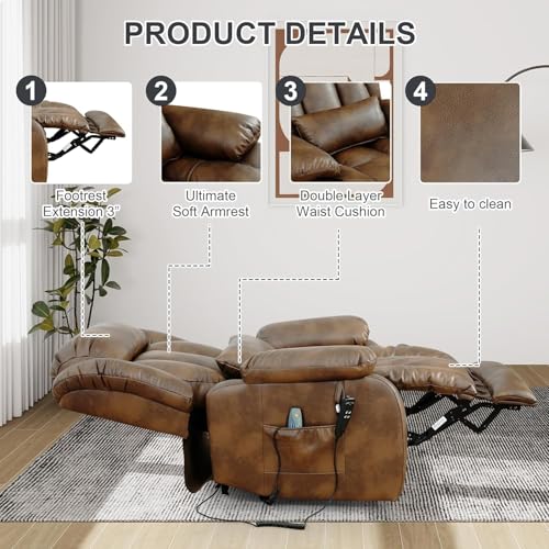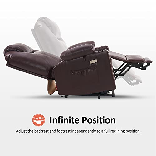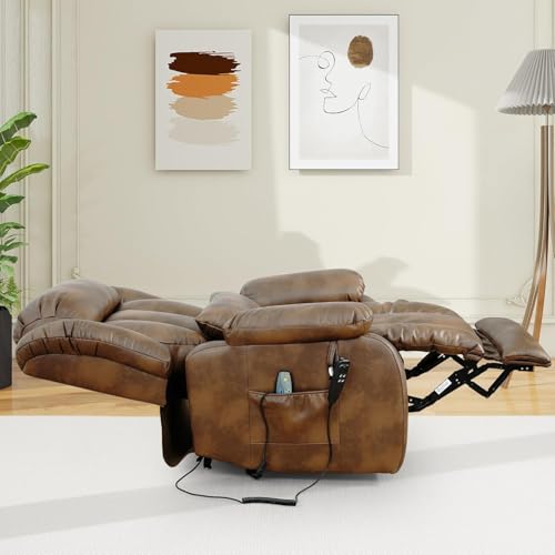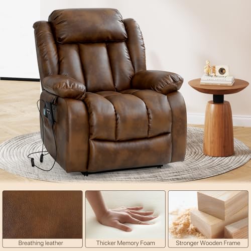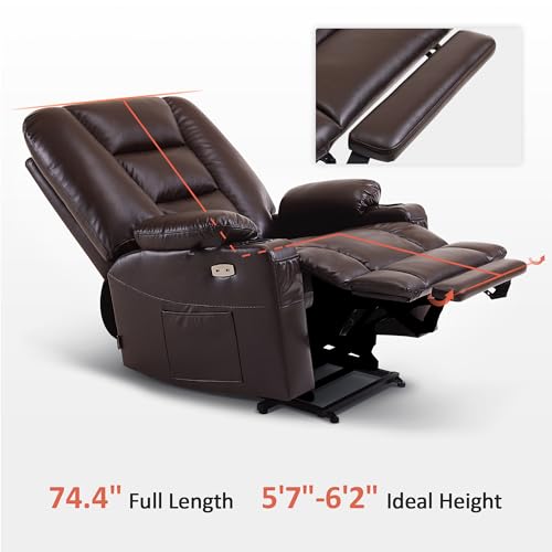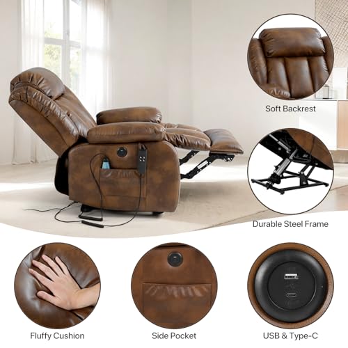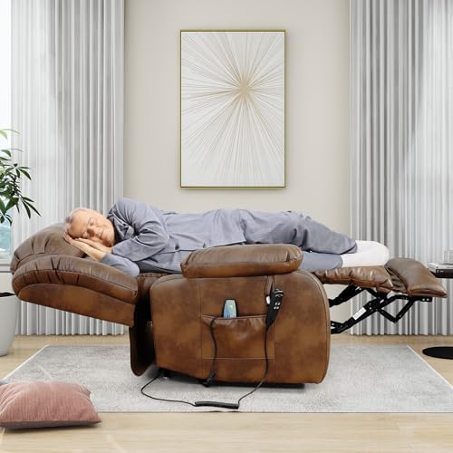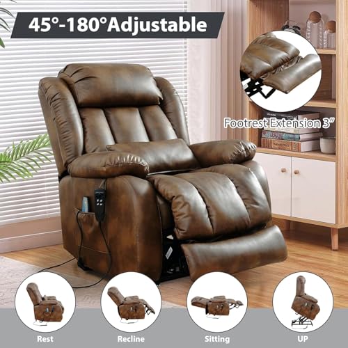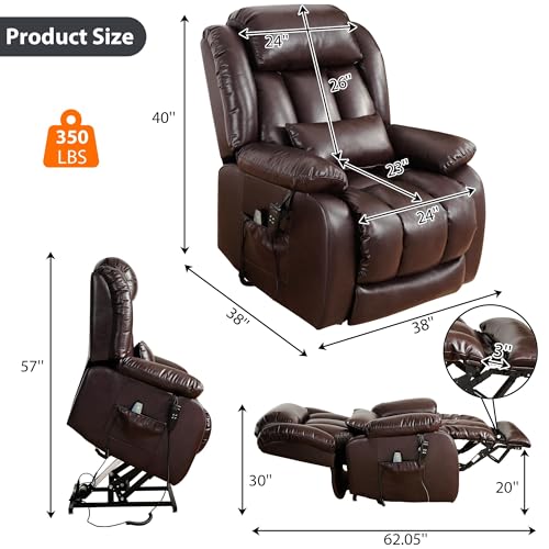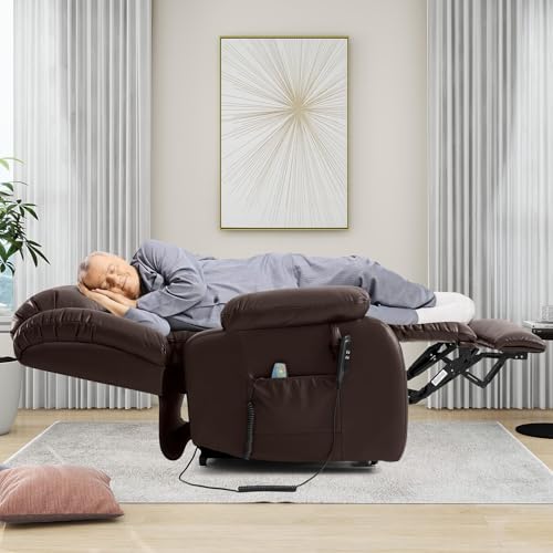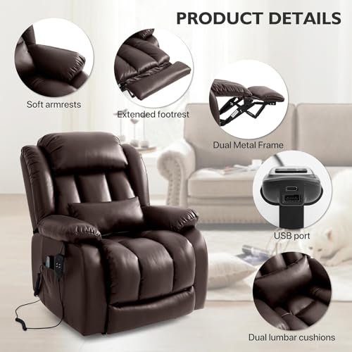 EDILLY Large Genuine Leather Power Lift Recliner Chairs for Elderly, Dual Motor with Massage and Heating,Double Lumbar Cushion and Extended Footrest,USB&Type-C Port and Remote(Brown)