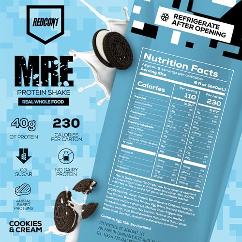 REDCON1 MRE Ready to Drink Protein Shakes, Cookies & Cream - Lactose + Whey Free RTD Protein Made with Real Whole Food Protein Blends - Keto-Friendly and Easy to Digest Nutritional Shake (12 Pack)