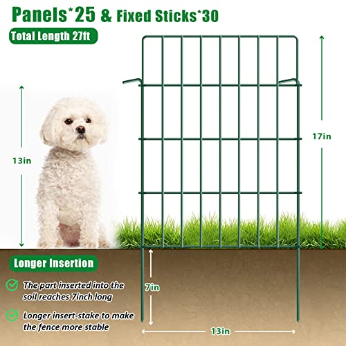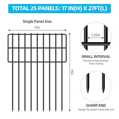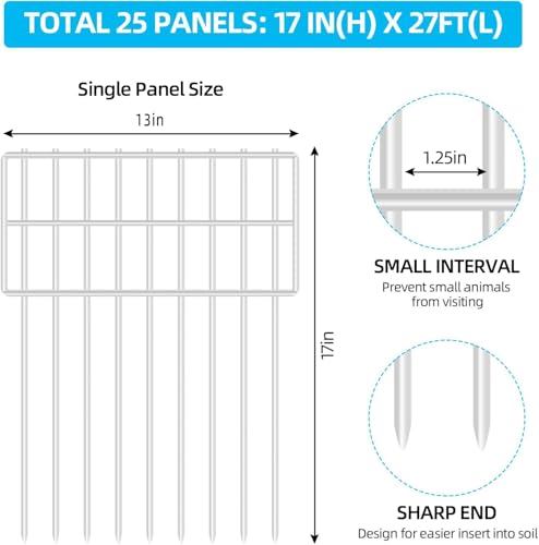 25 Panels Garden Fencing Animal Barrier, 17in (H) X 27ft (L) Dog Dig Fence Barrier, 1.25in Gap Rustproof Metal Stakes Decorative Garden Fence, Ground Defense Border Fence for Outdoor, Yard, Patio