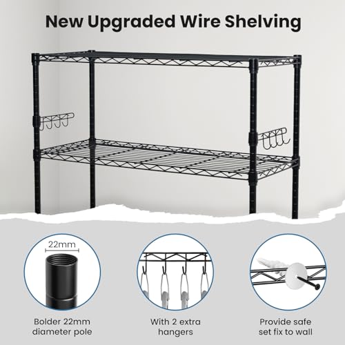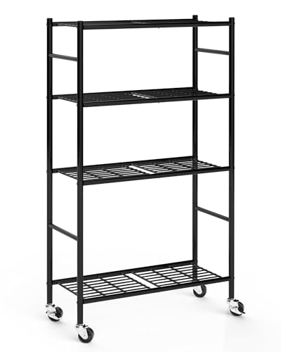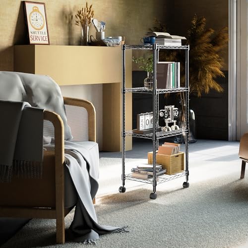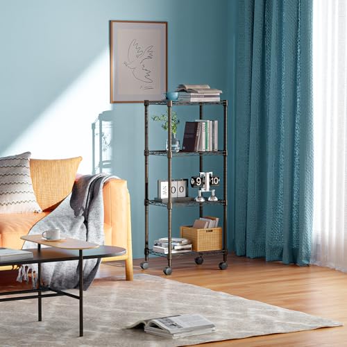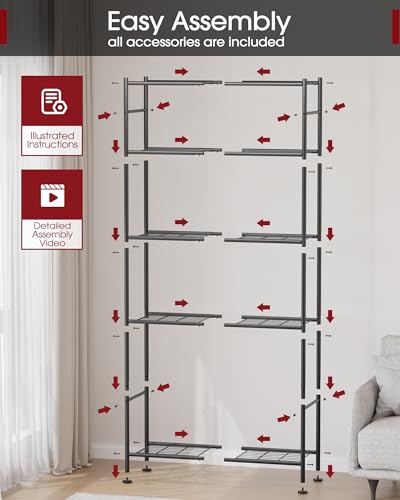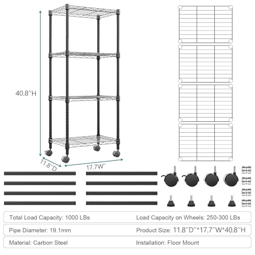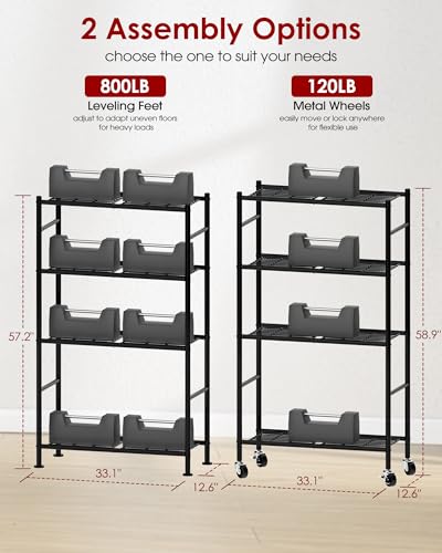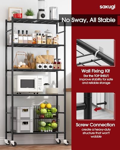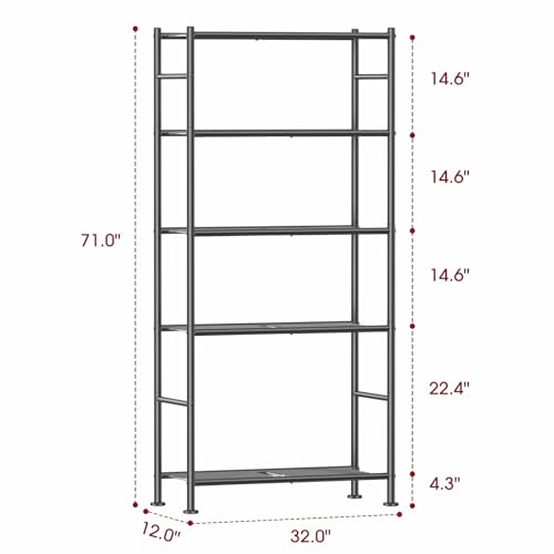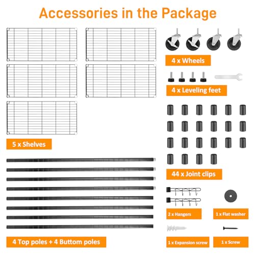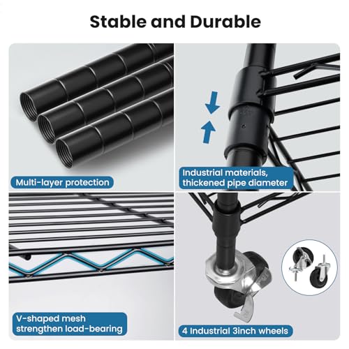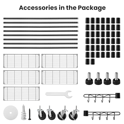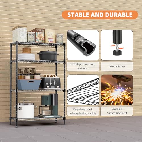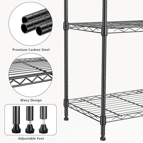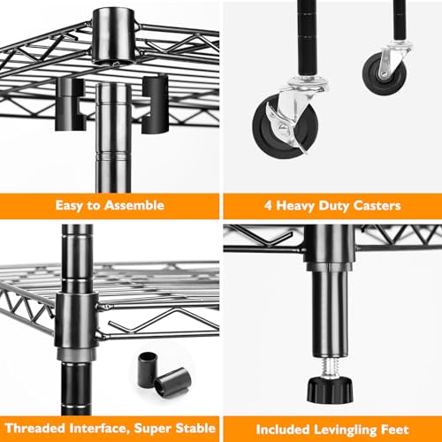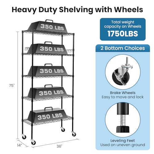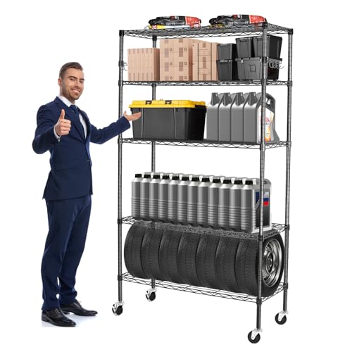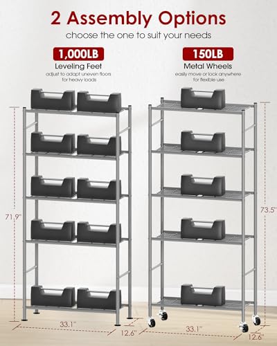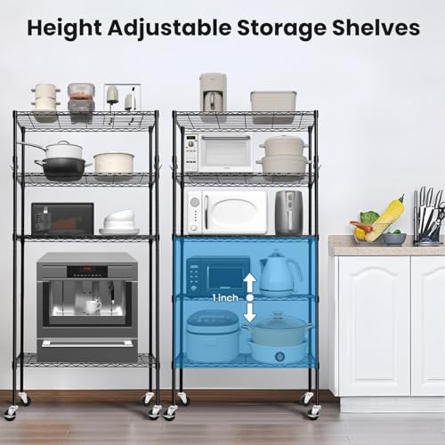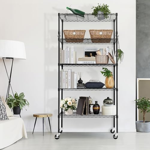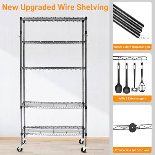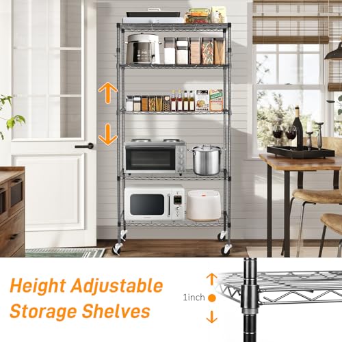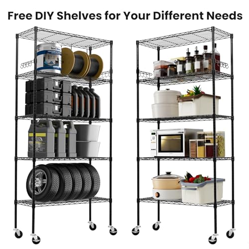 Storage Shelves Organizer - 5 Tier Metal Shelf Organizer with Metal Wheels and Adjustable Leveling Feet, Heavy Duty Garage Shelving for Kitchen, Pantry and Closet, 33.1"x12.6"x73.5", Black