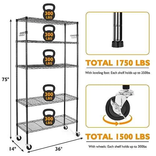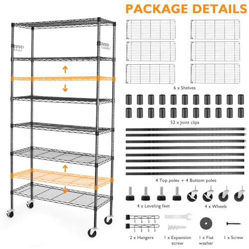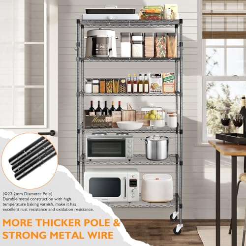6 Tier Storage Shelves with Wheels, 2100lbs Capacity Heavy Duty Shelving Units, 14x36x75inch Adjustable Metal Shelf Wire Shelving Rack for Garage, Kitchen, Office, Black