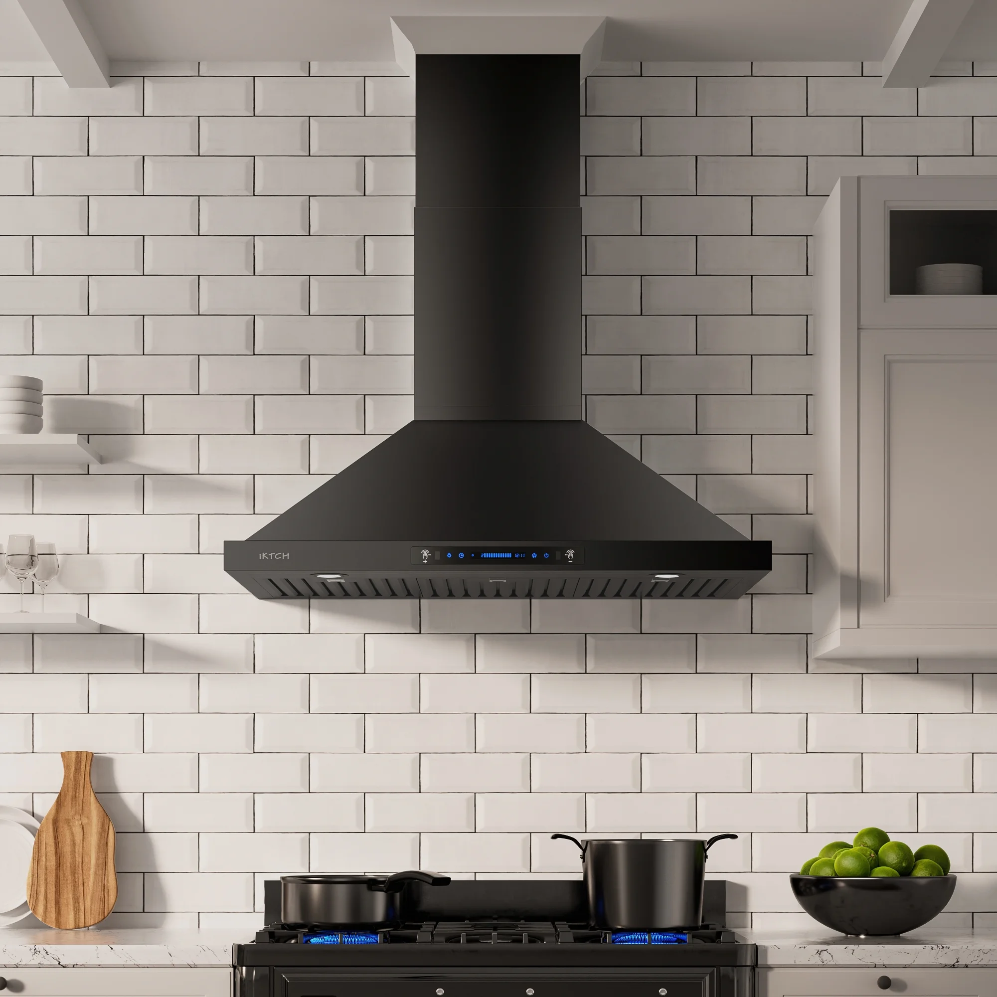 IKTCH 30 inch Black Wall Mount Range Hood, 900 CFM Ducted/Ductless Stainless Steel Vent Hood with Gesture Sensing & Touch Control Switch Panel, 2 Pcs Adjustable Lights(IKP02-30-BSS)
