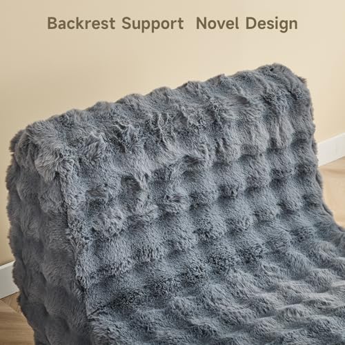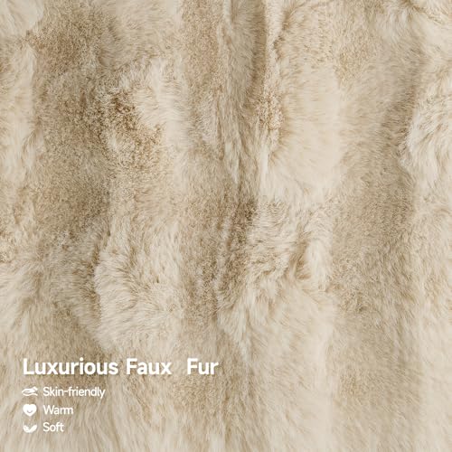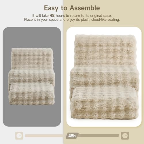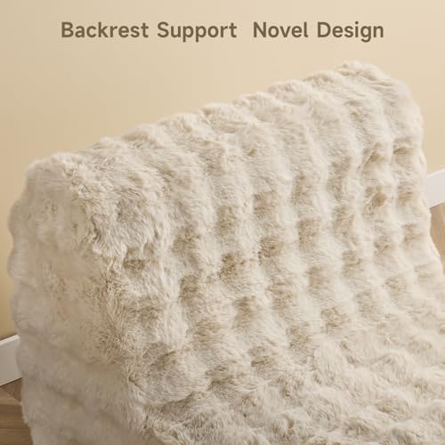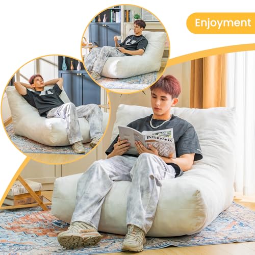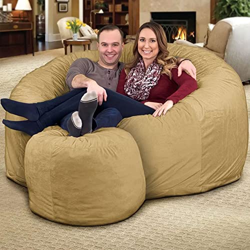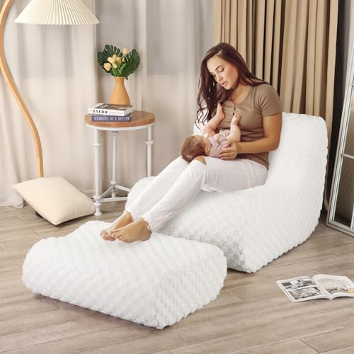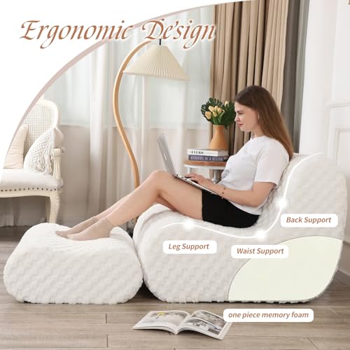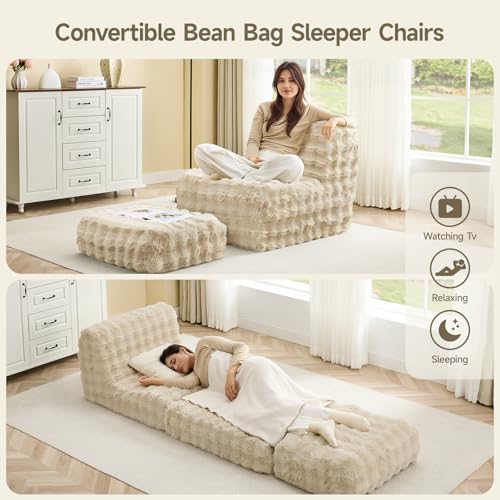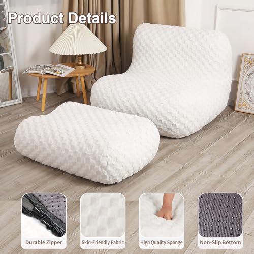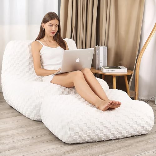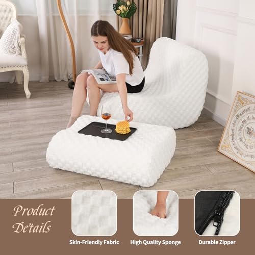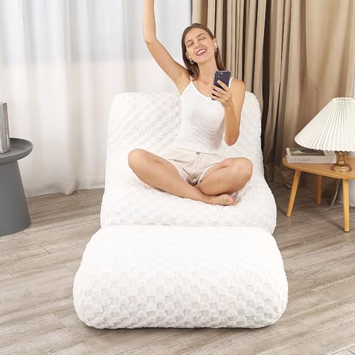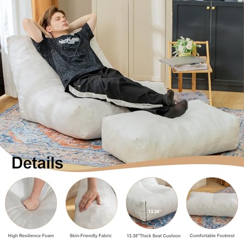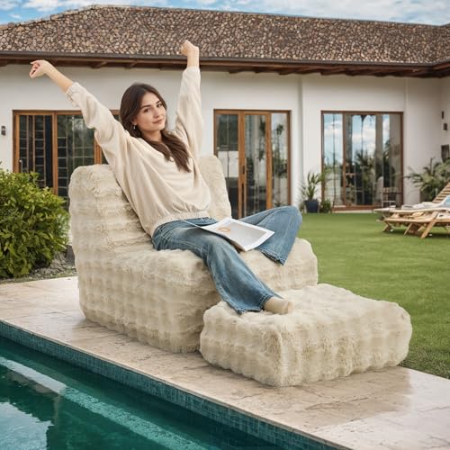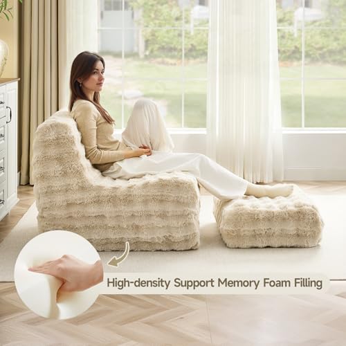 Giant Bean Bag Chair for Adults with Ottoman, Fur Faux Beanbag Sofa Bed with Memory Foam Filled,Plush Lazy Floor Sofa with Footstool Couch for Living Room,Bedroom,Dorm, Apartment,Beige