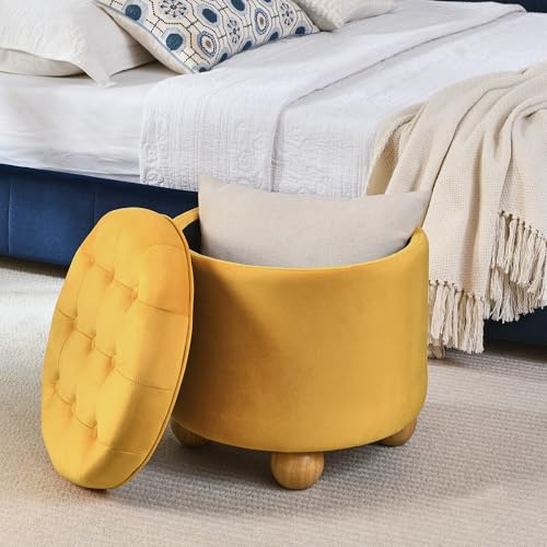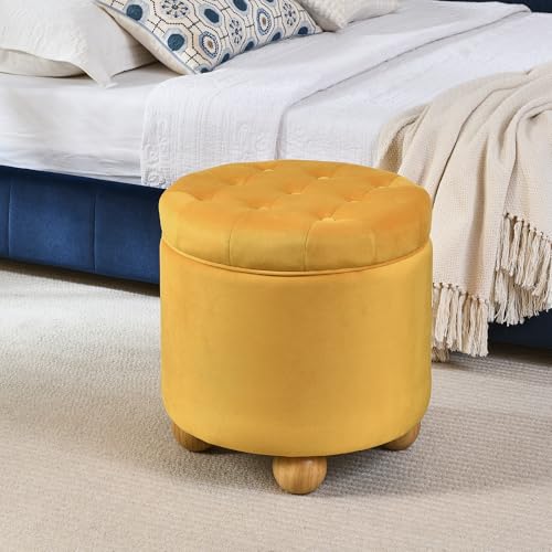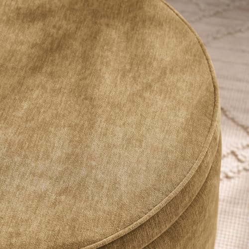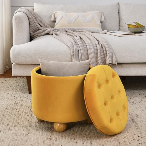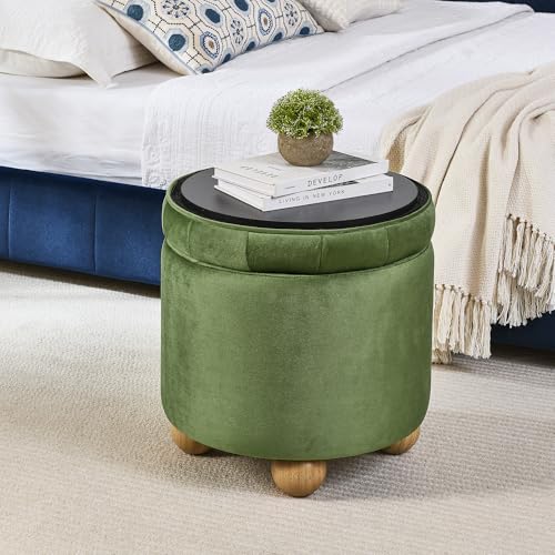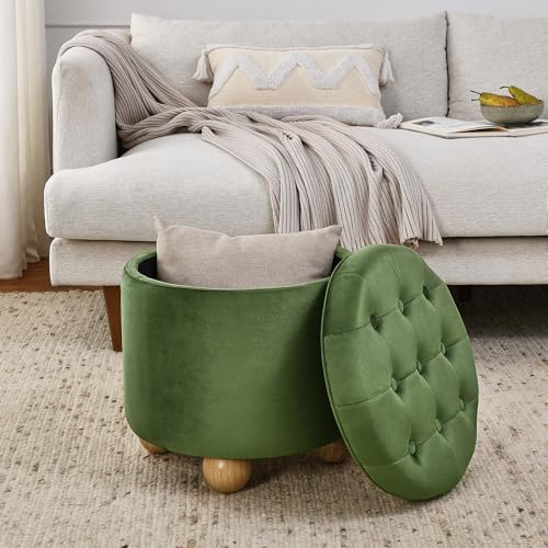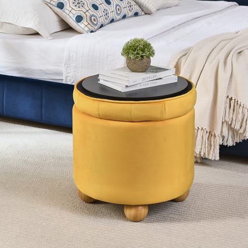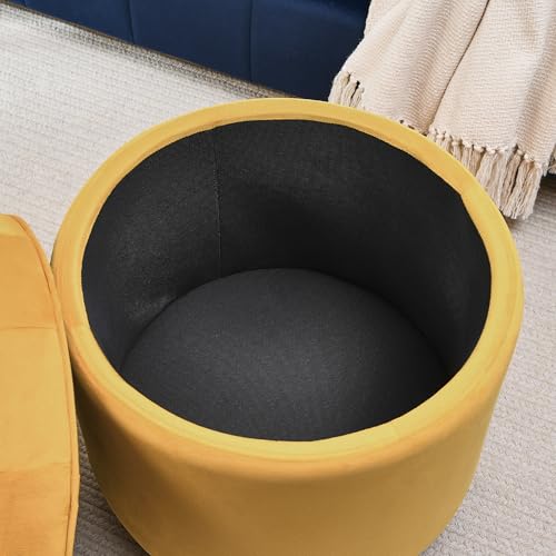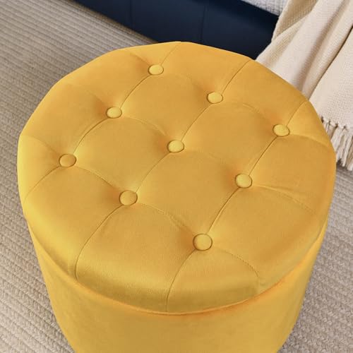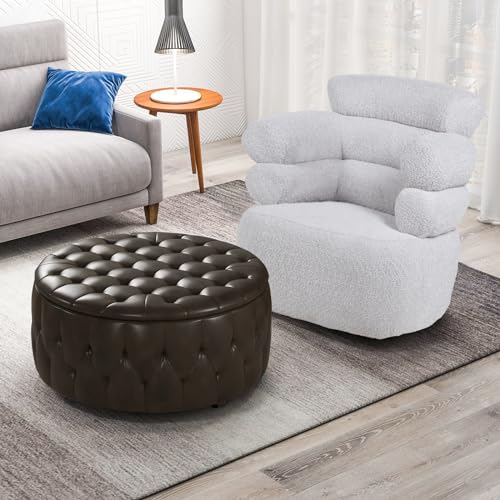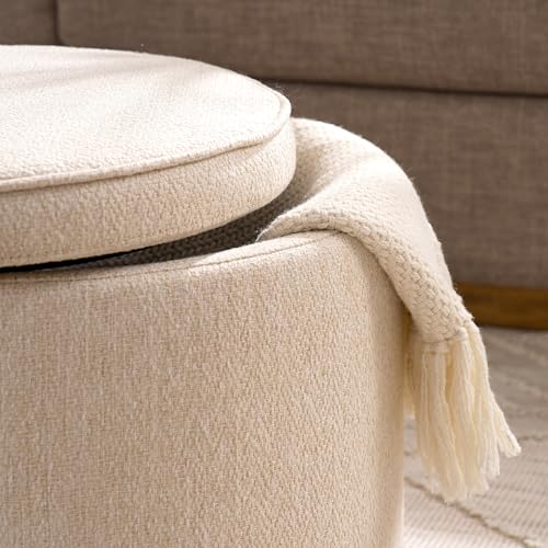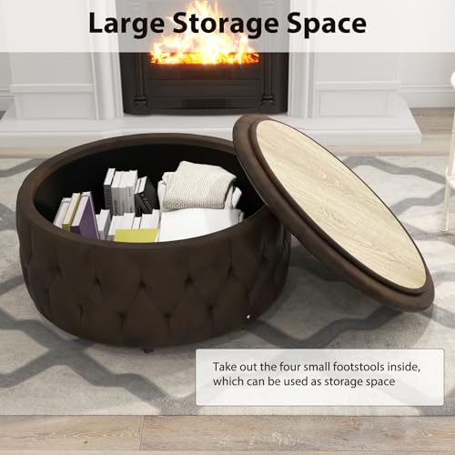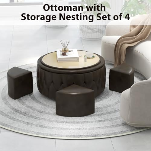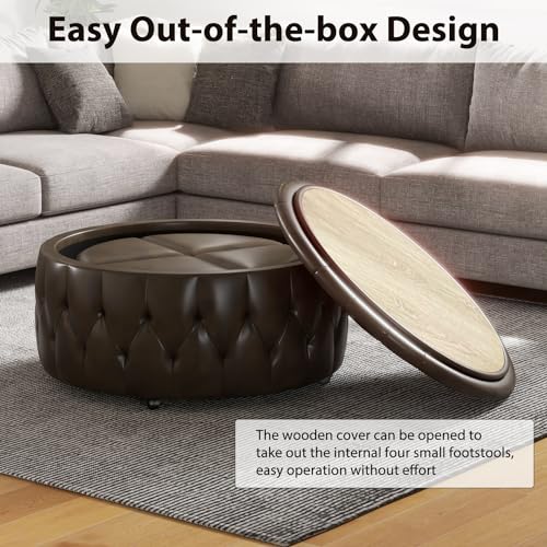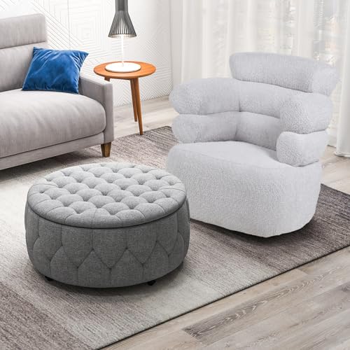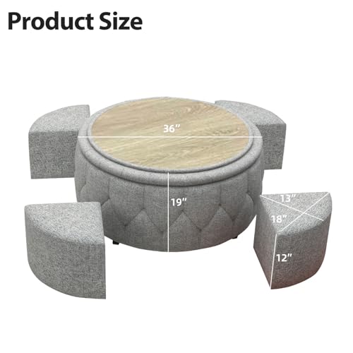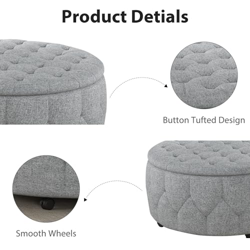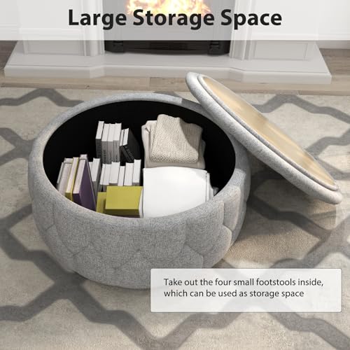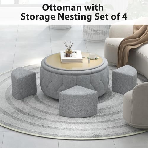 INZOY 36" Wide Storage Ottoman Large with 4 Wheels,Tufted Round Rolling Ottoman with Removable Lid, Coffee Table Seat Inside 4 Stools/Taborets, Fabric Grey