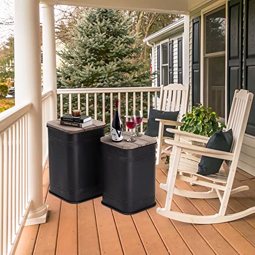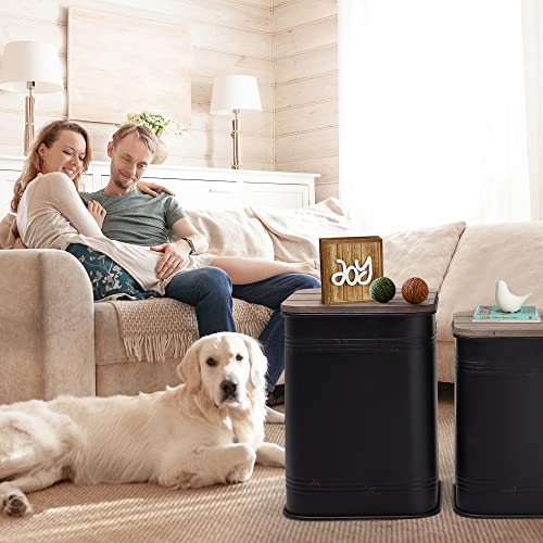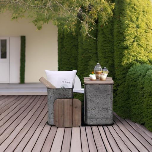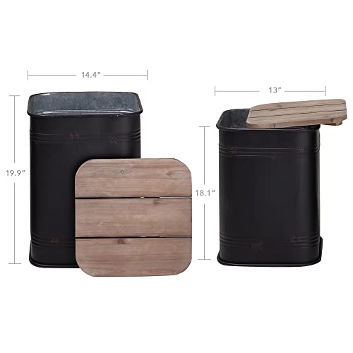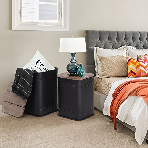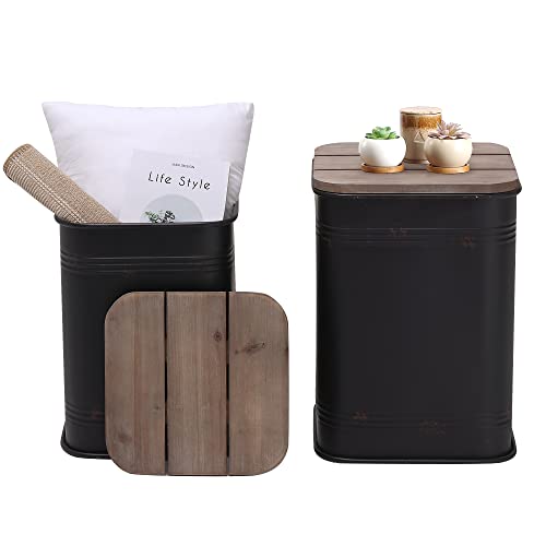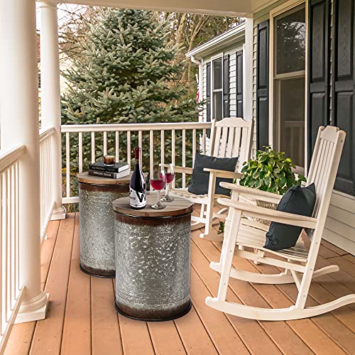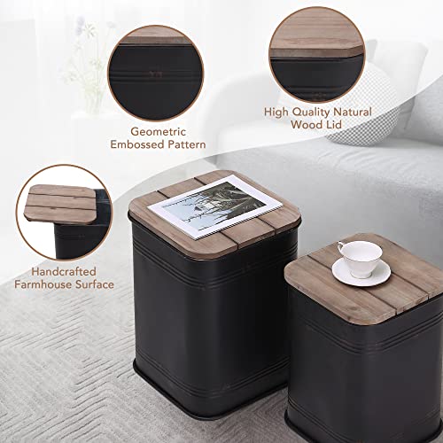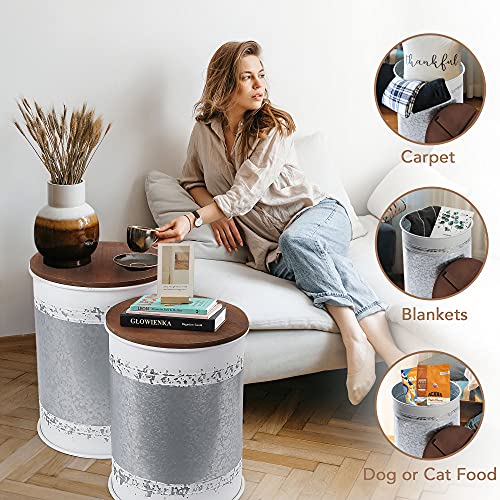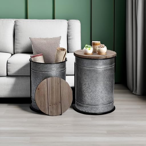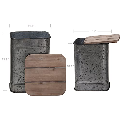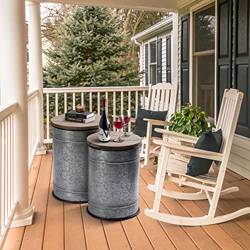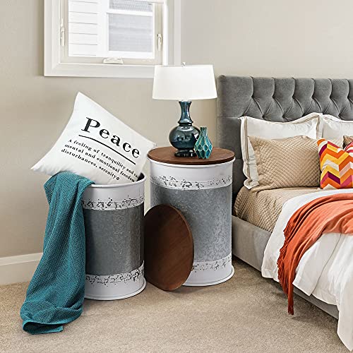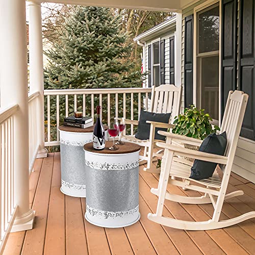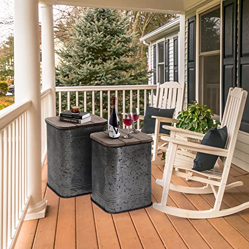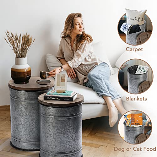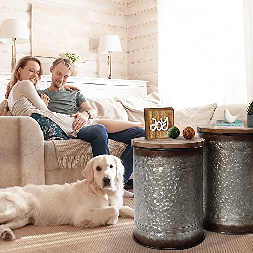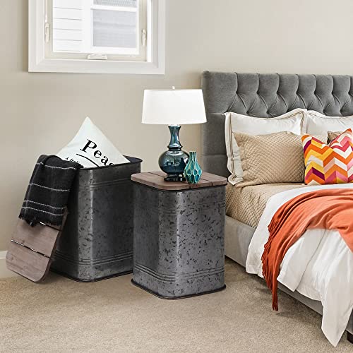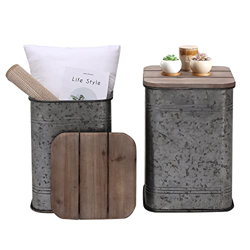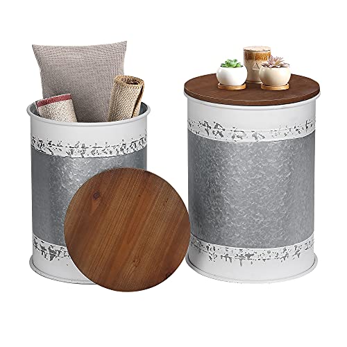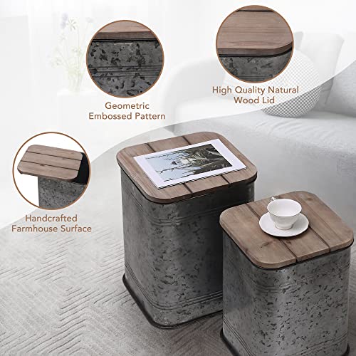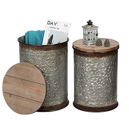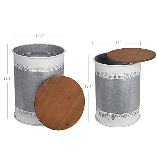 RUSTOWN Farmhouse Accent Side Table, Rustic Storage Ottoman Seat Stool, Galvanized Antique Metal End Table Box Bin with Round Wood Lid, Coffee or Cocktail Table, Nesting Pieces Two (Galvanized)